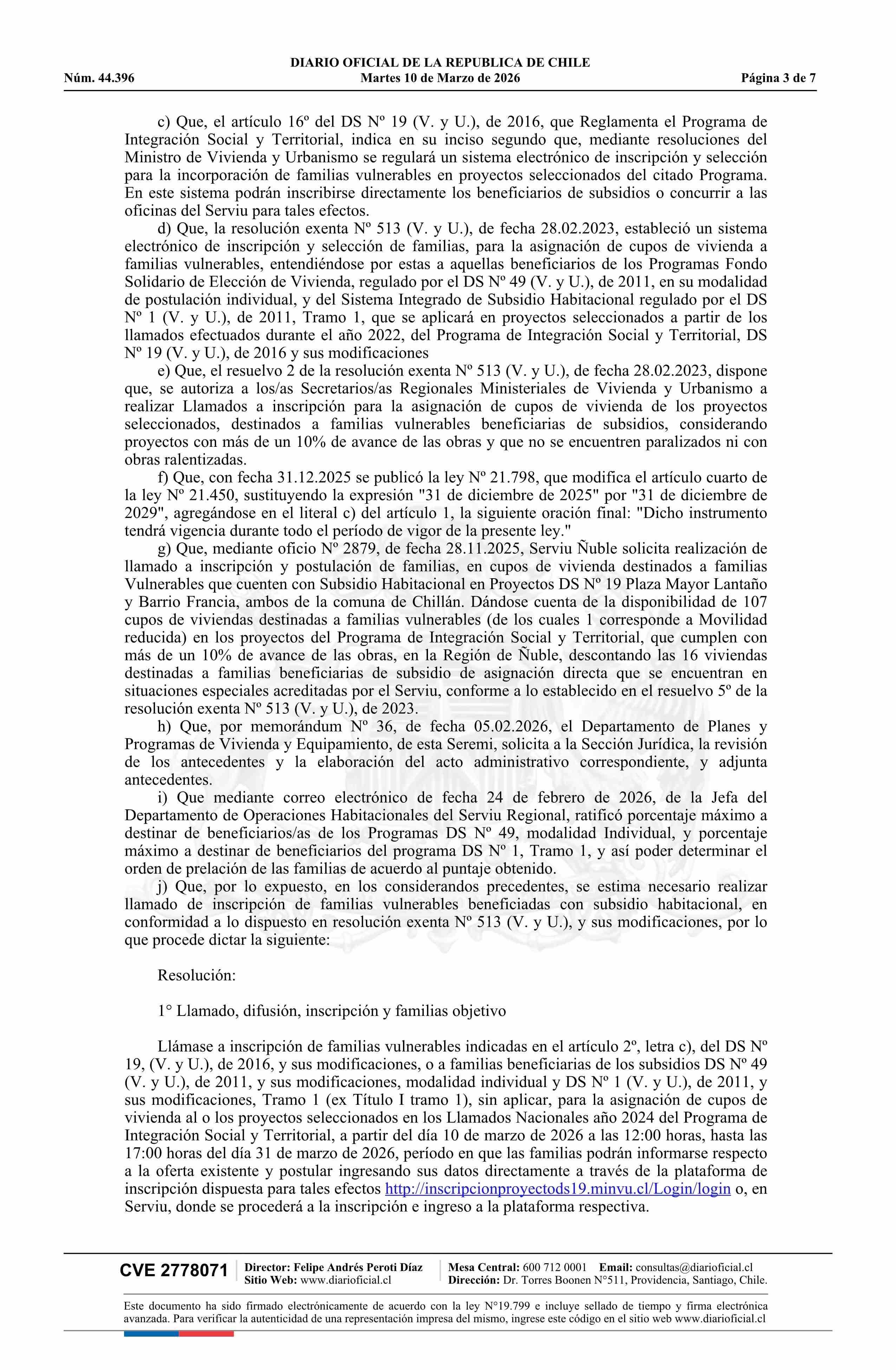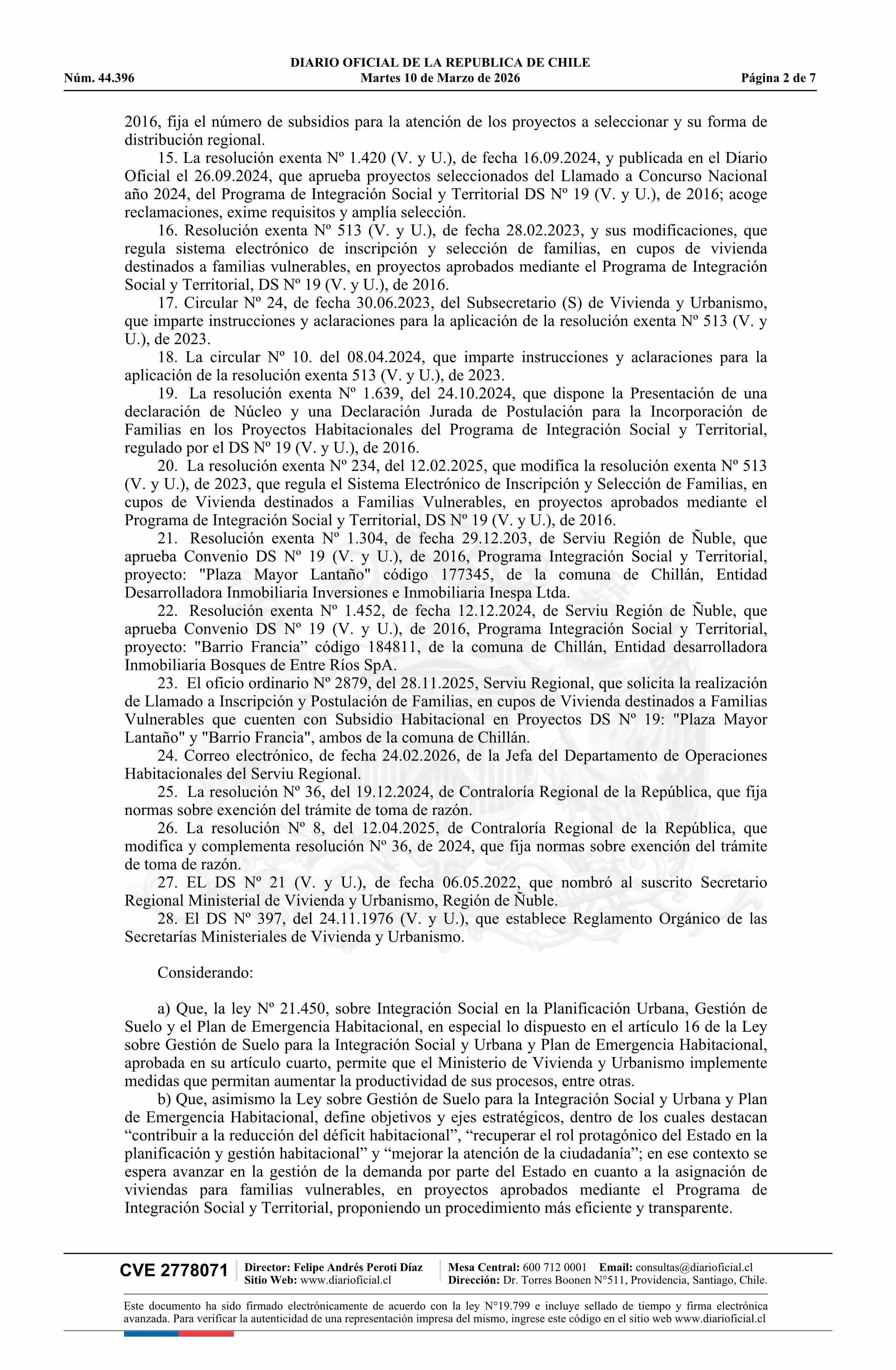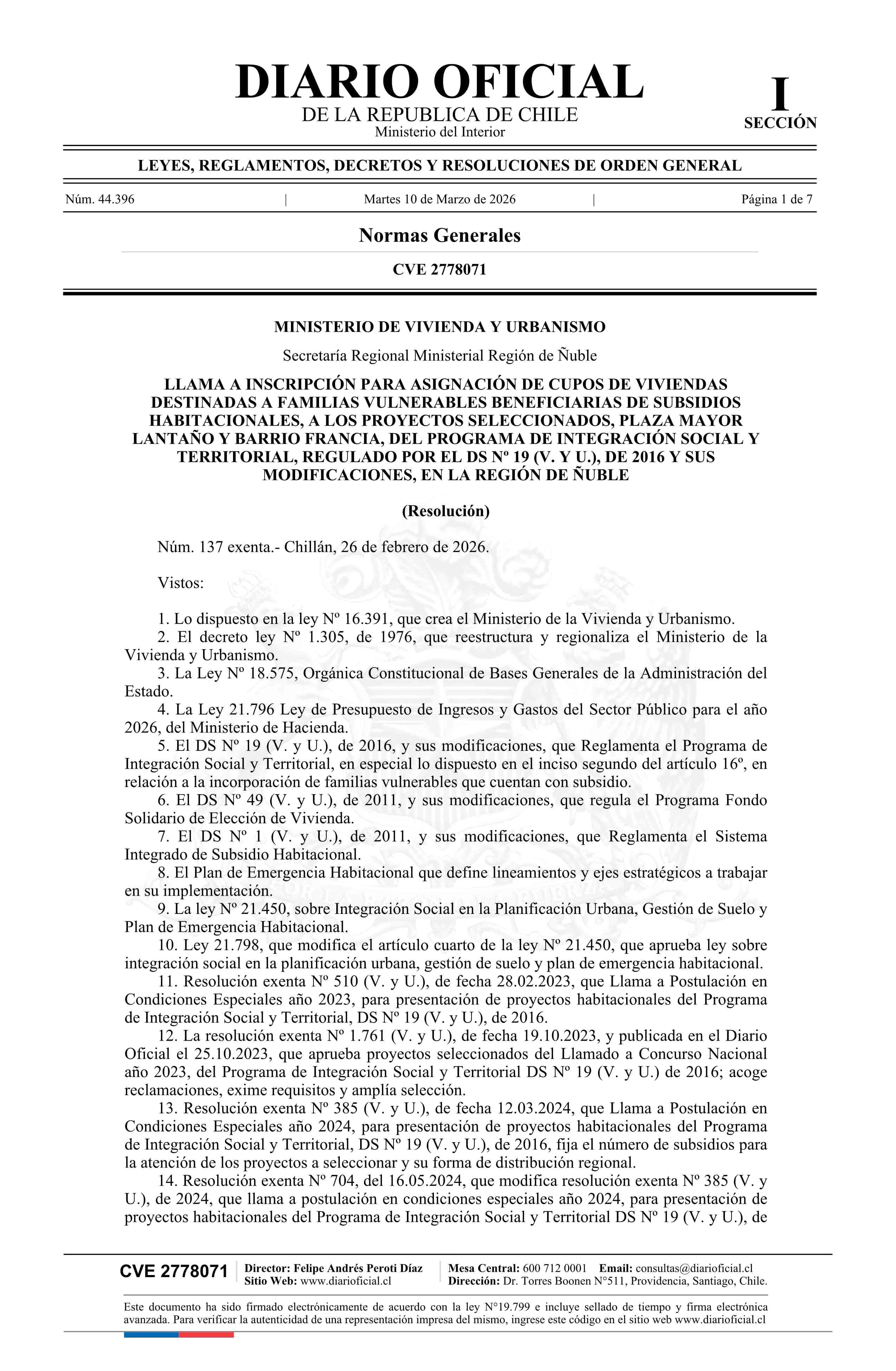 | Título: | Resolución exenta número 137, de 2026.- Llama a inscripción para asignación de cupos de viviendas destinadas a familias vulnerables beneficiarias de subsidios habitacionales, a los proyectos seleccionados, Plaza Mayor Lantaño y Barrio Francia, del Programa de Integración Social y Territorial, regula |