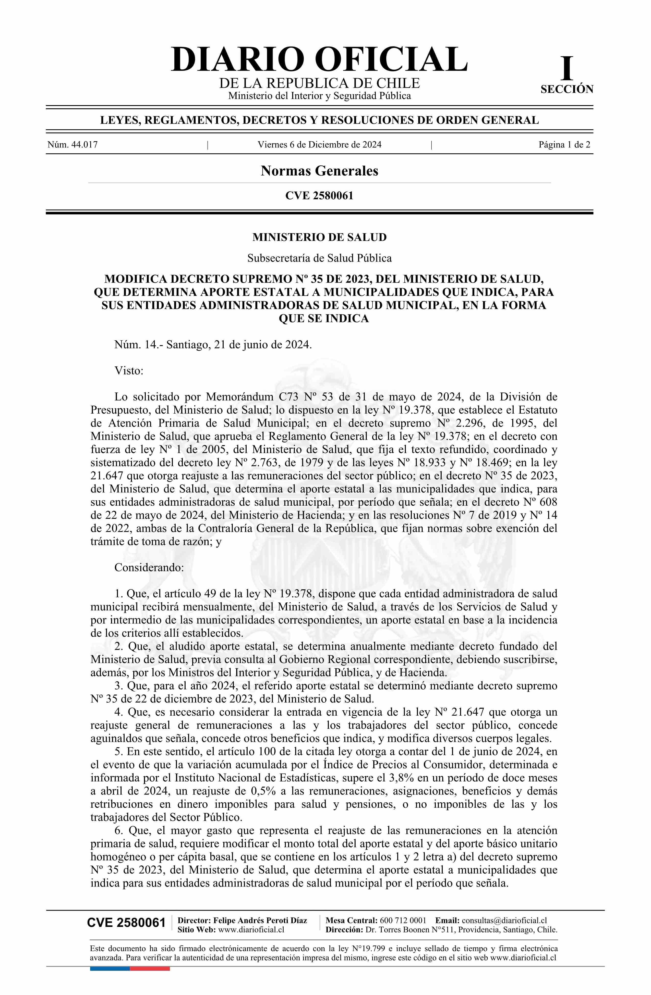 | Título: | Decreto número 14, de 2024.- Modifica decreto supremo Nº 35, de 2023, que determina aporte estatal a municipalidades que indica, para sus entidades administradoras de salud municipal, en la forma que se indica |