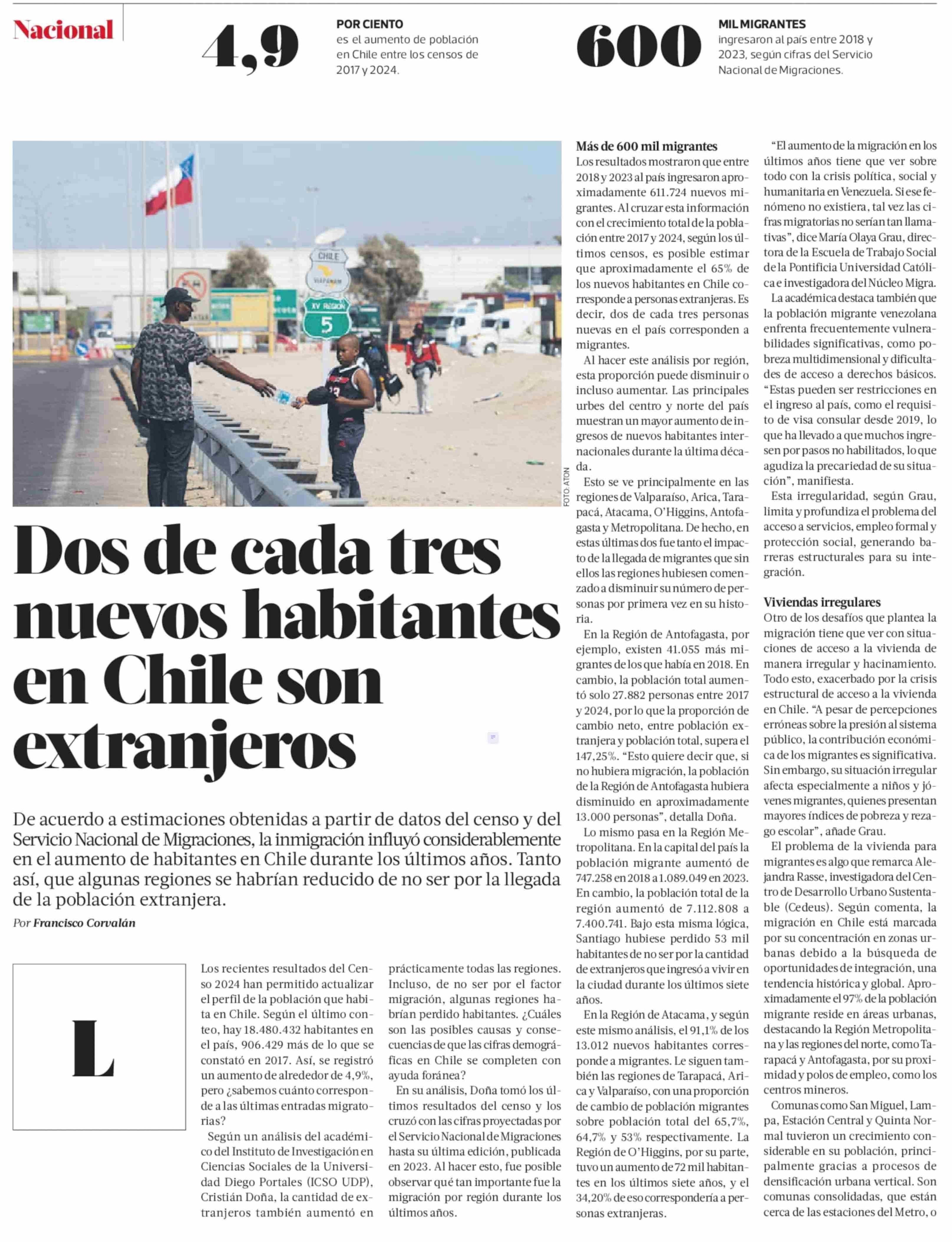 Dos de cada tres nuevos habitantes en Chile son extranjeros 19-04-2025 La Tercera |