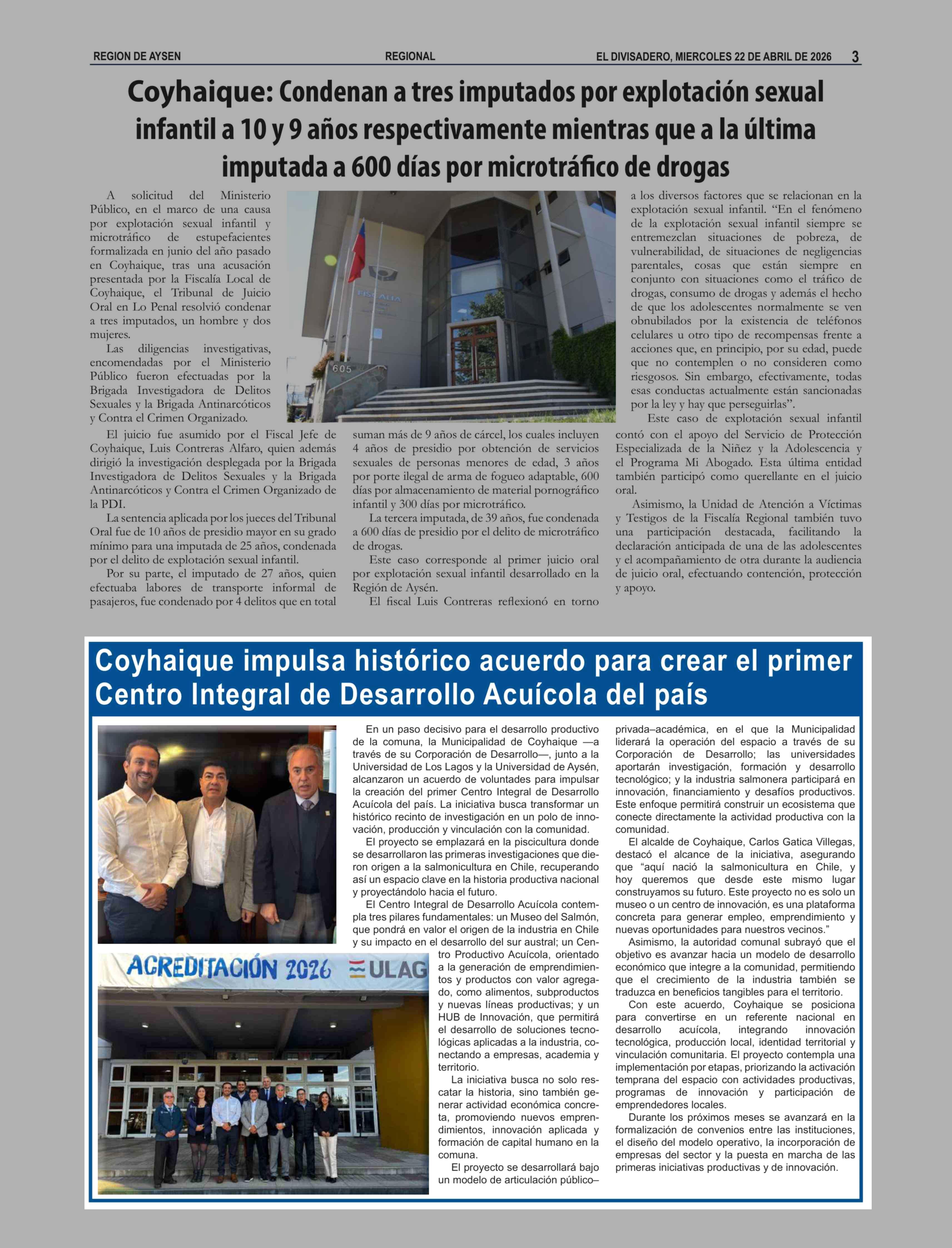 Coyhaique impulsa histórico acuerdo para crear el primer Centro Integral de Desarrollo Acuícola del país 22-04-2026 El Divisadero |