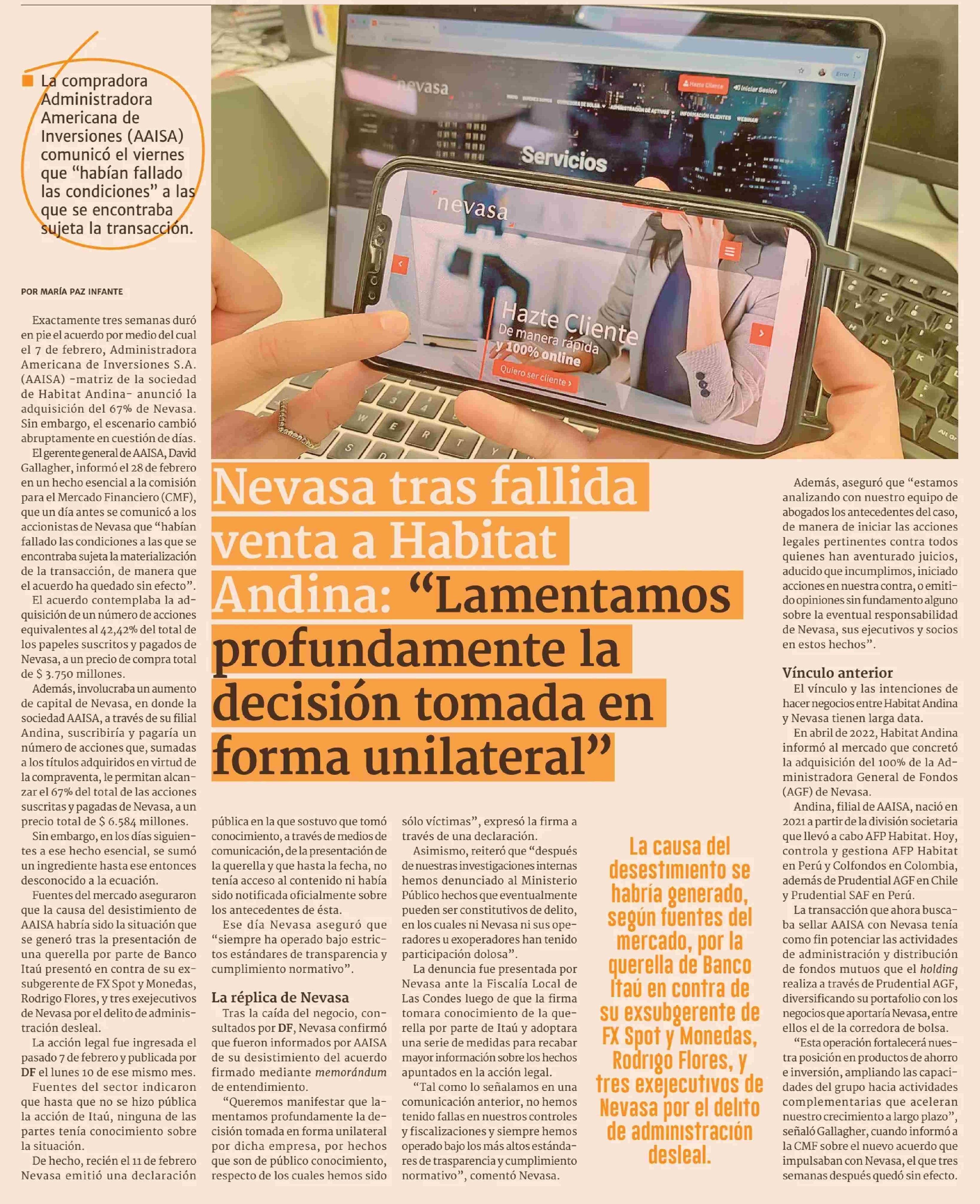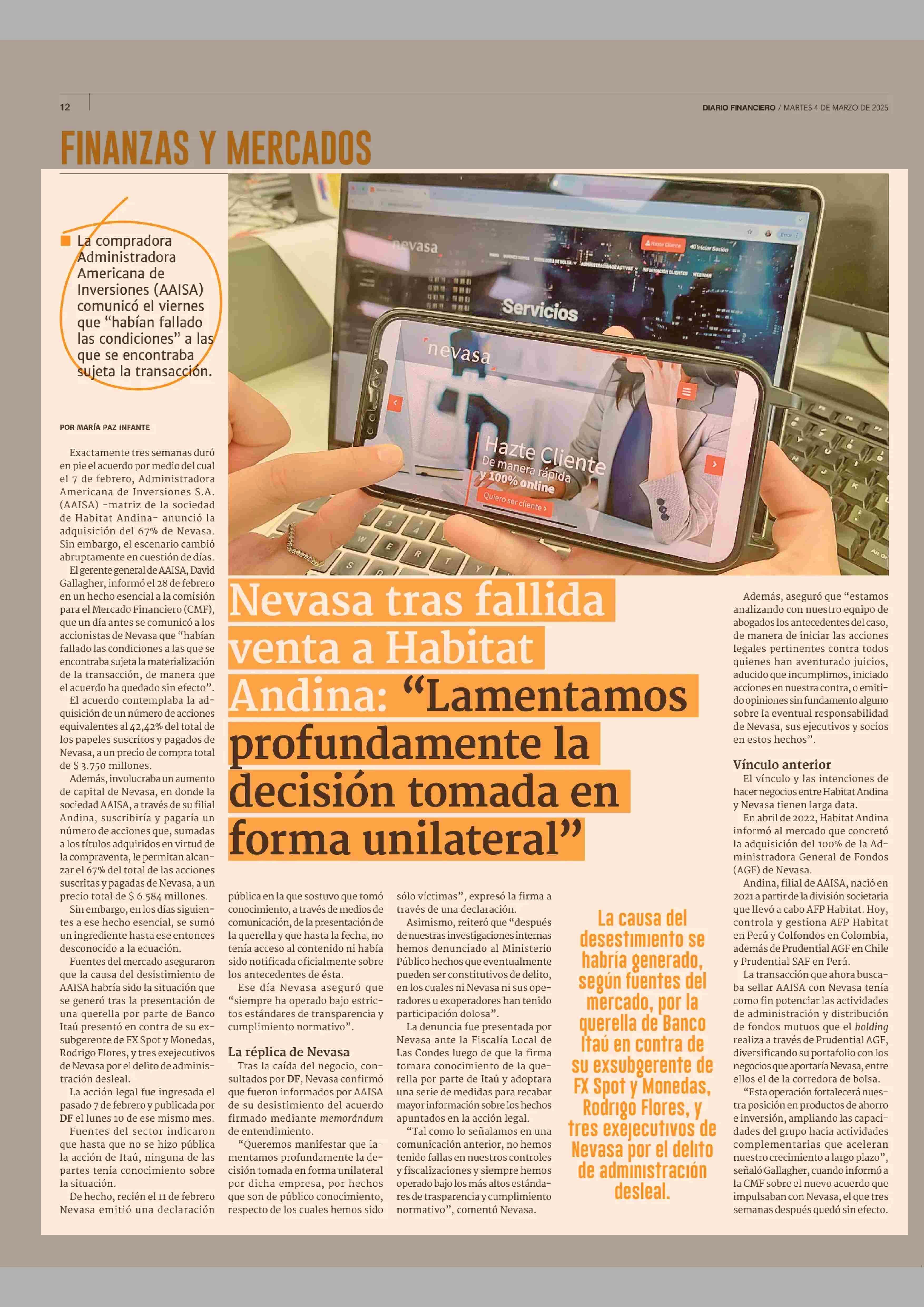 Nevasa tras fallida venta a Habitat Andina: "Lamentamos profundamente la decisión tomada en forma unilateral" 04-03-2025 Diario Financiero |