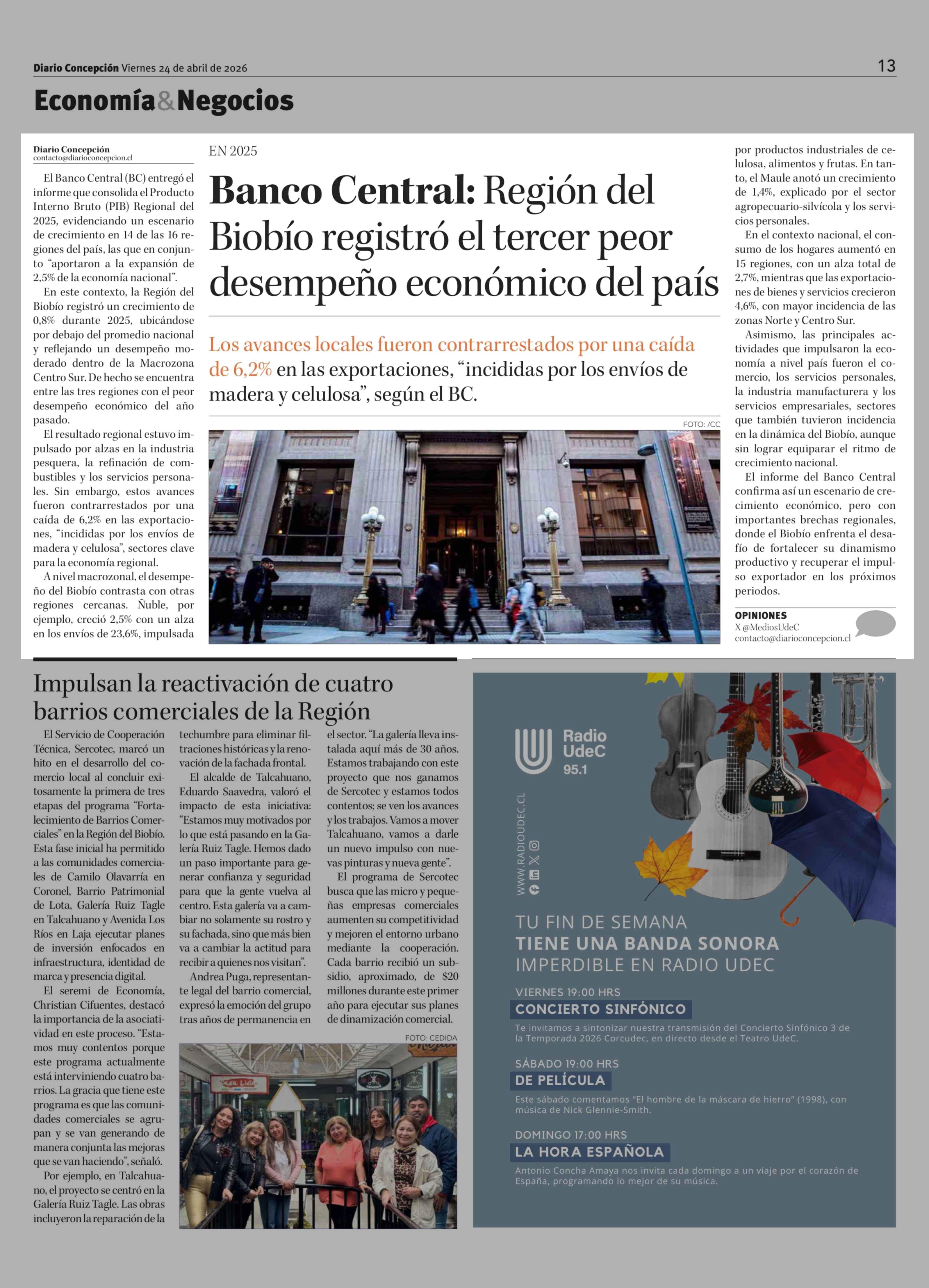 Banco Central: Región del Biobío registró el tercer peor desempeño económico del país 24-04-2026 Diario Concepción |