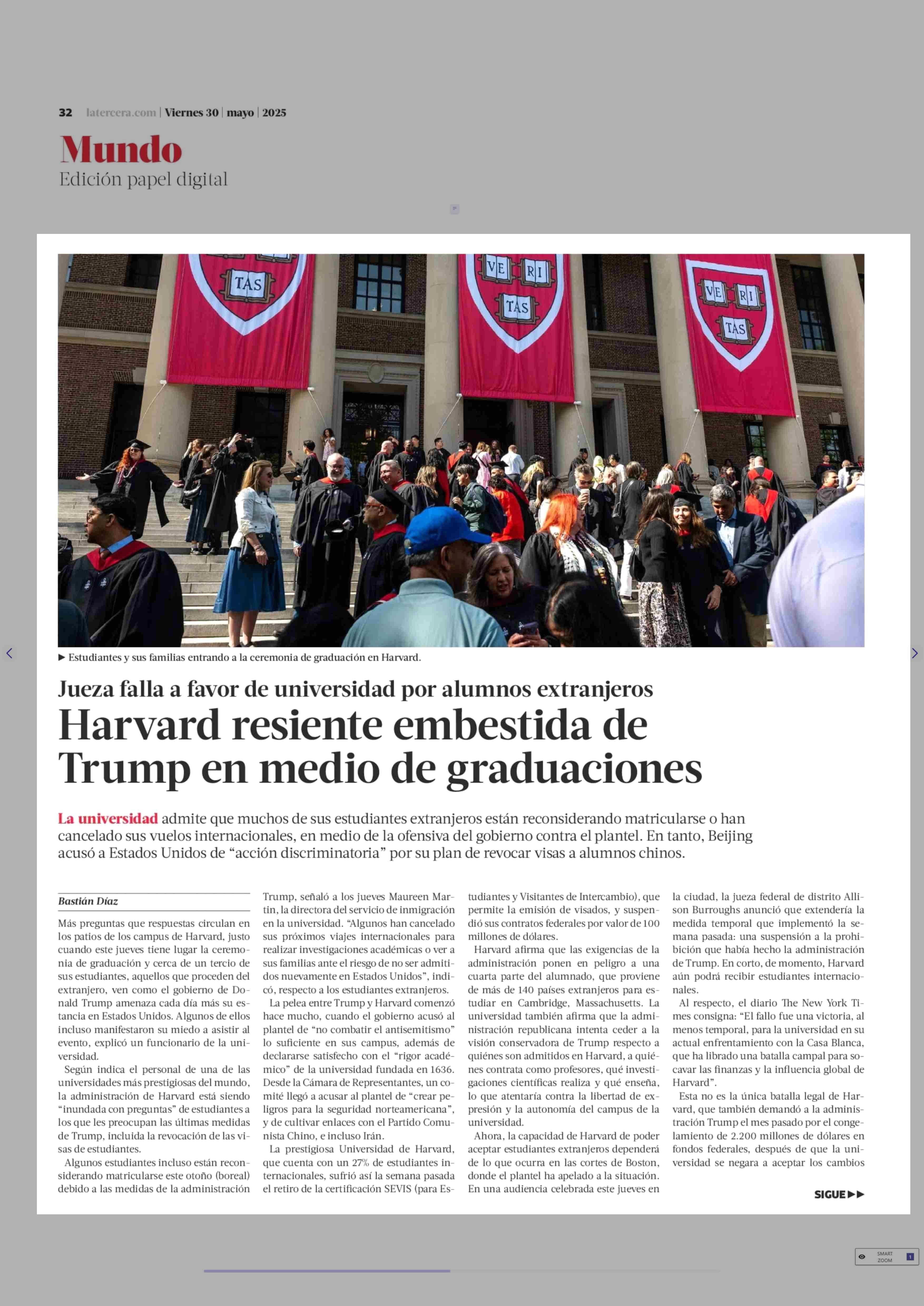 Harvard resiente embestida de Trump en medio de graduaciones 30-05-2025 La Tercera |