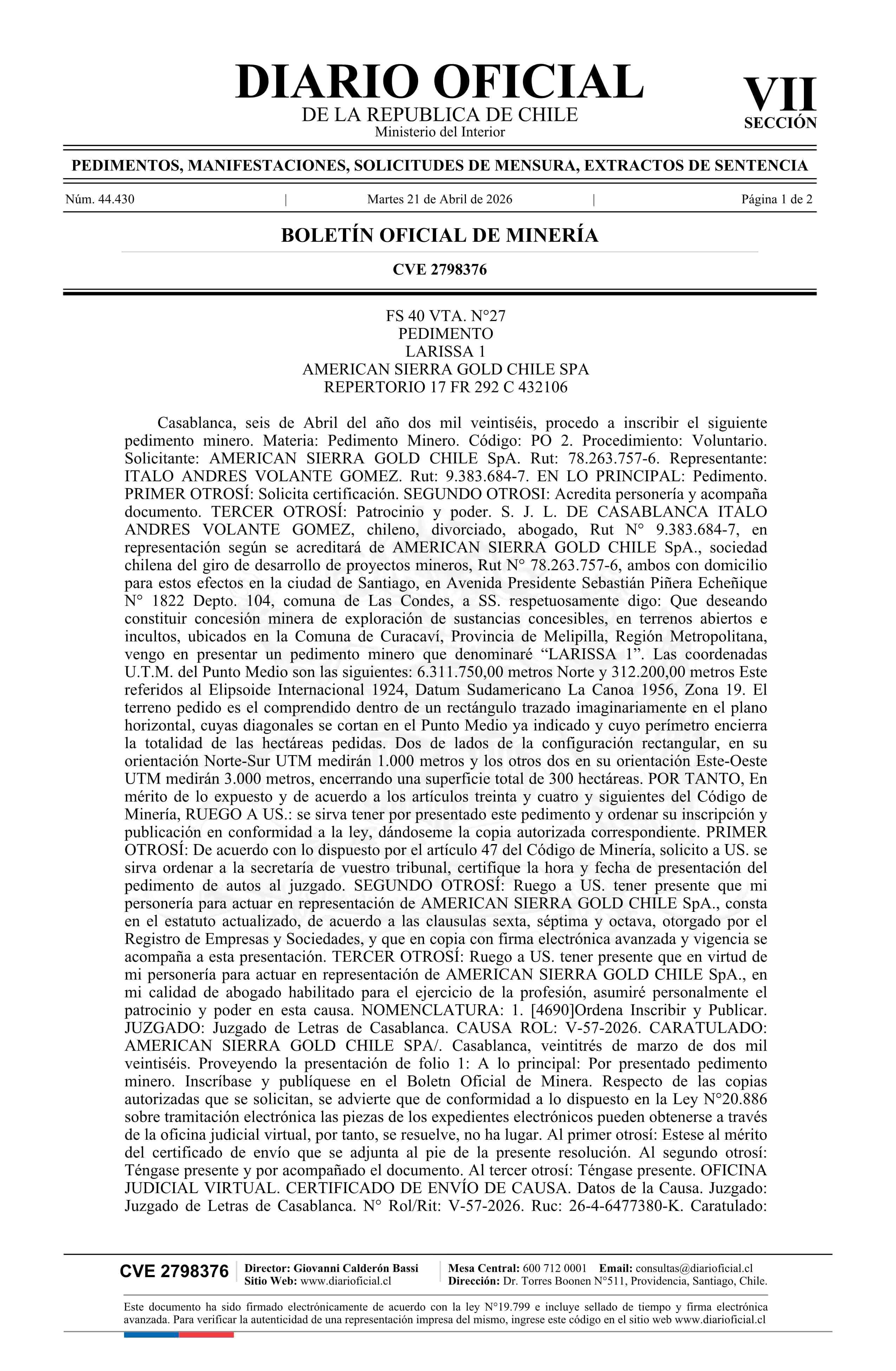 LARISSA 1 / American Sierra Gold Chile SpA 21-04-2026 DIARIO OFICIAL CHILE - BOLETÍN OFICIAL DE MINERÍA |