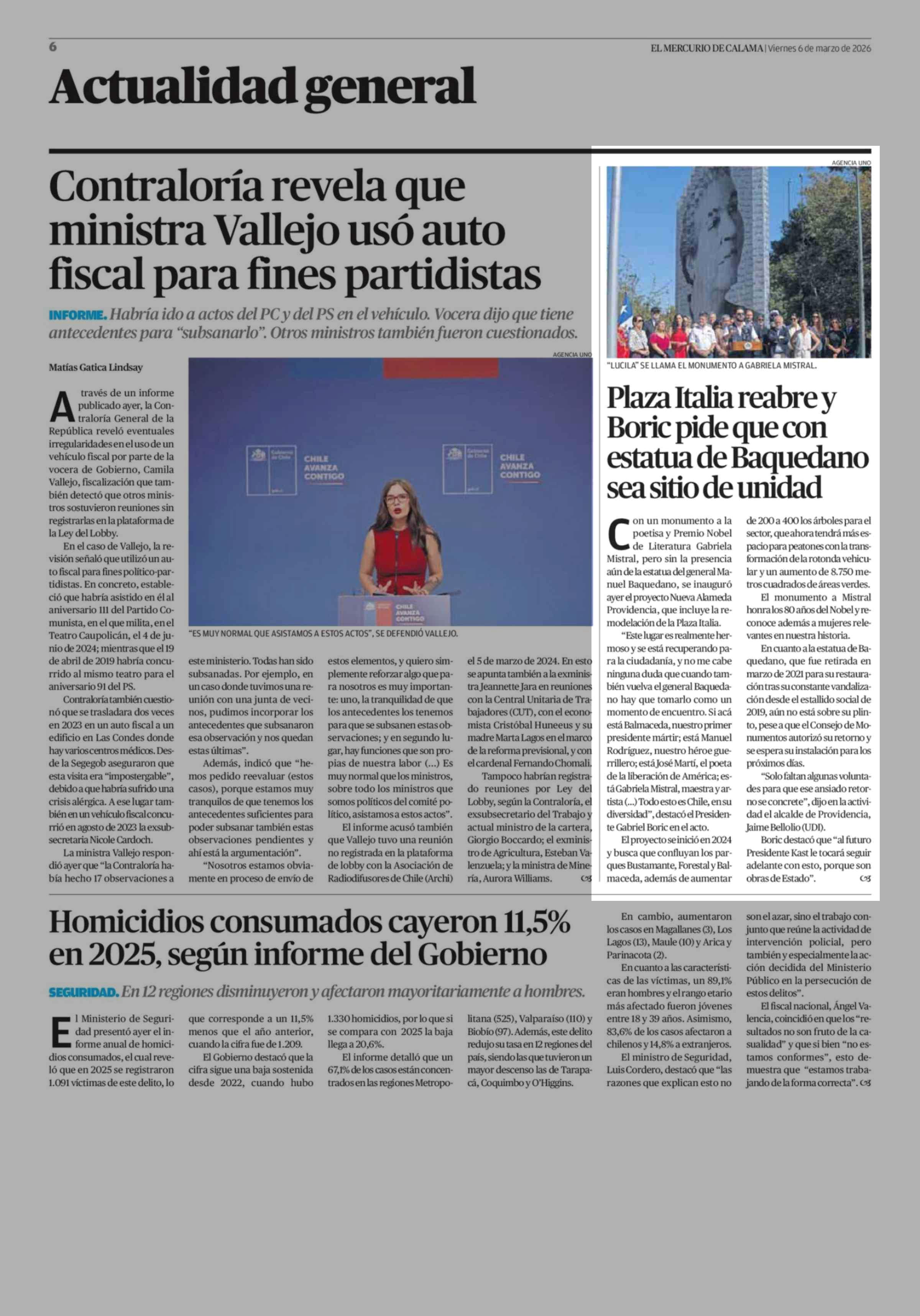 Plaza Italia reabre y Boric pide que con estatua de Baquedano sea sitio de unidad 06-03-2026 El Mercurio de Calama |
