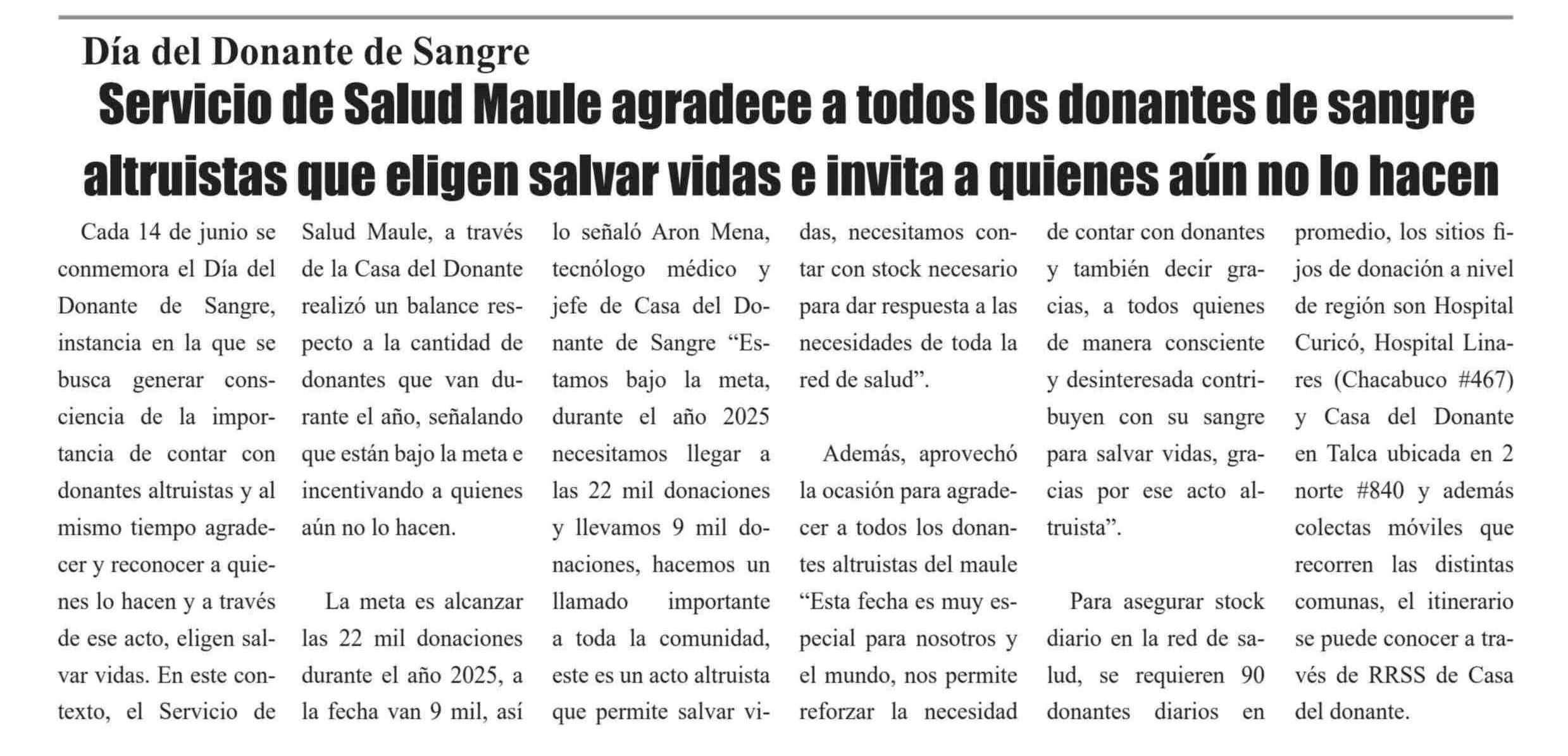 Servicio de Salud Maule agradece a todos los donantes de sangre altruistas que eligen salvar vidas e invita a quienes aún no lo hacen 14-06-2025 El Heraldo |