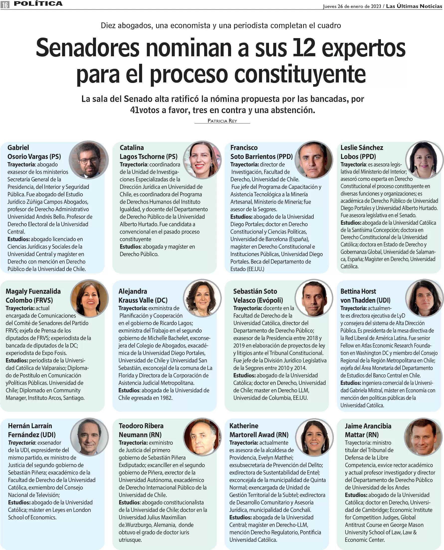 Senadores nominan a sus 12 expertos para el proceso constituyente 26-01-2023 Las Últimas Noticias |
