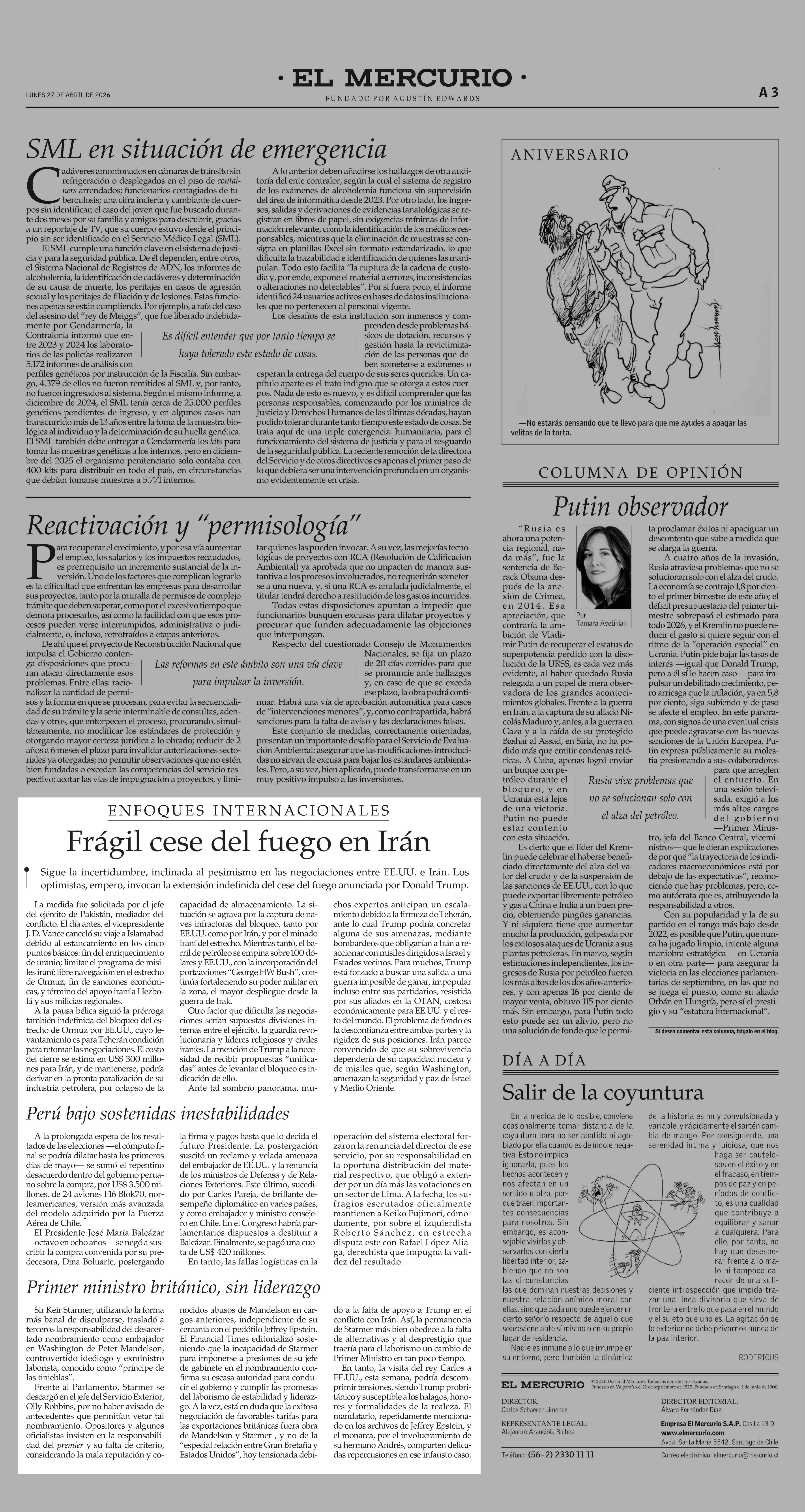 Editorial: Frágil cese del fuego en Irán 27-04-2026 El Mercurio |