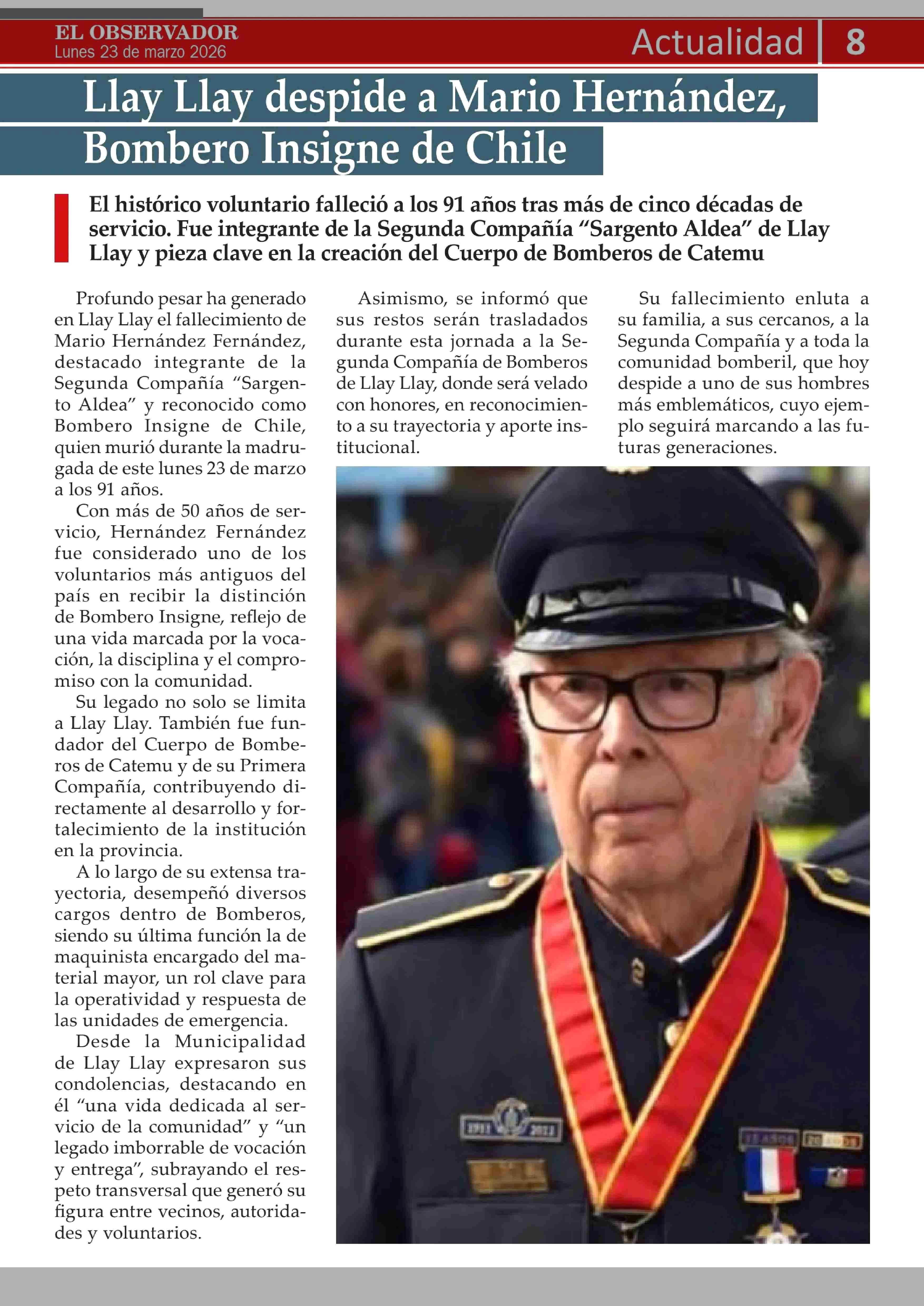 Llay Llay despide a Mario Hernández, Bombero Insigne de Chile 23-03-2026 El Observador Vespertino |