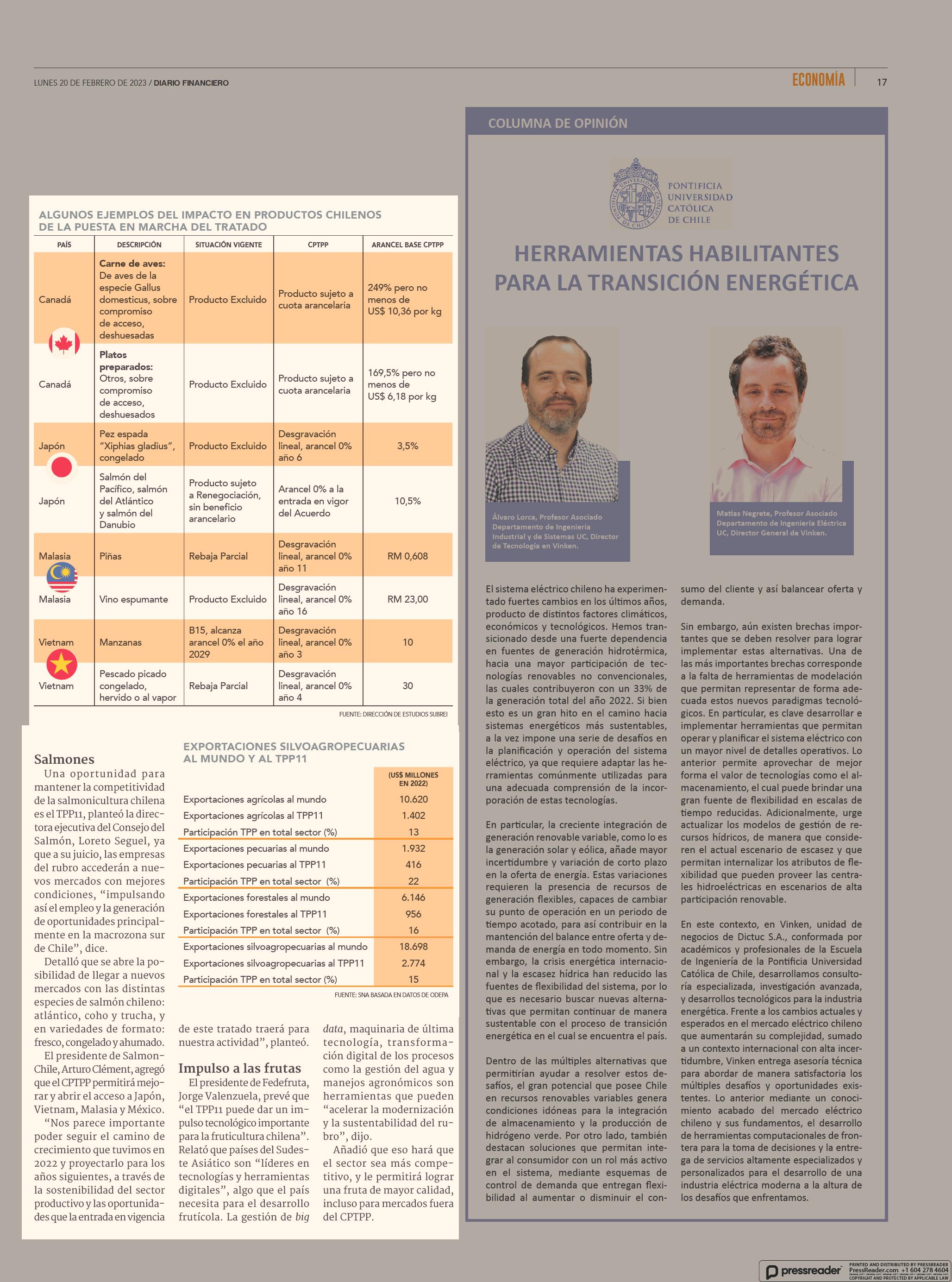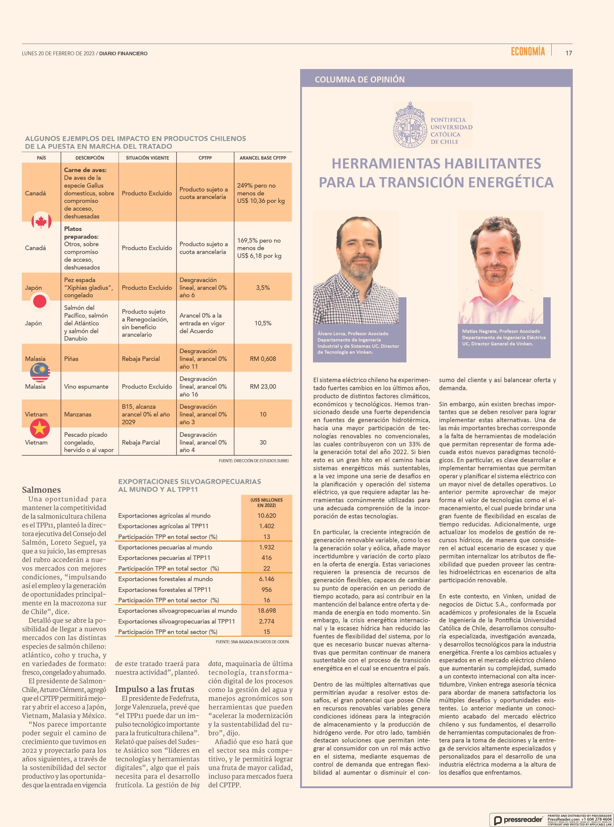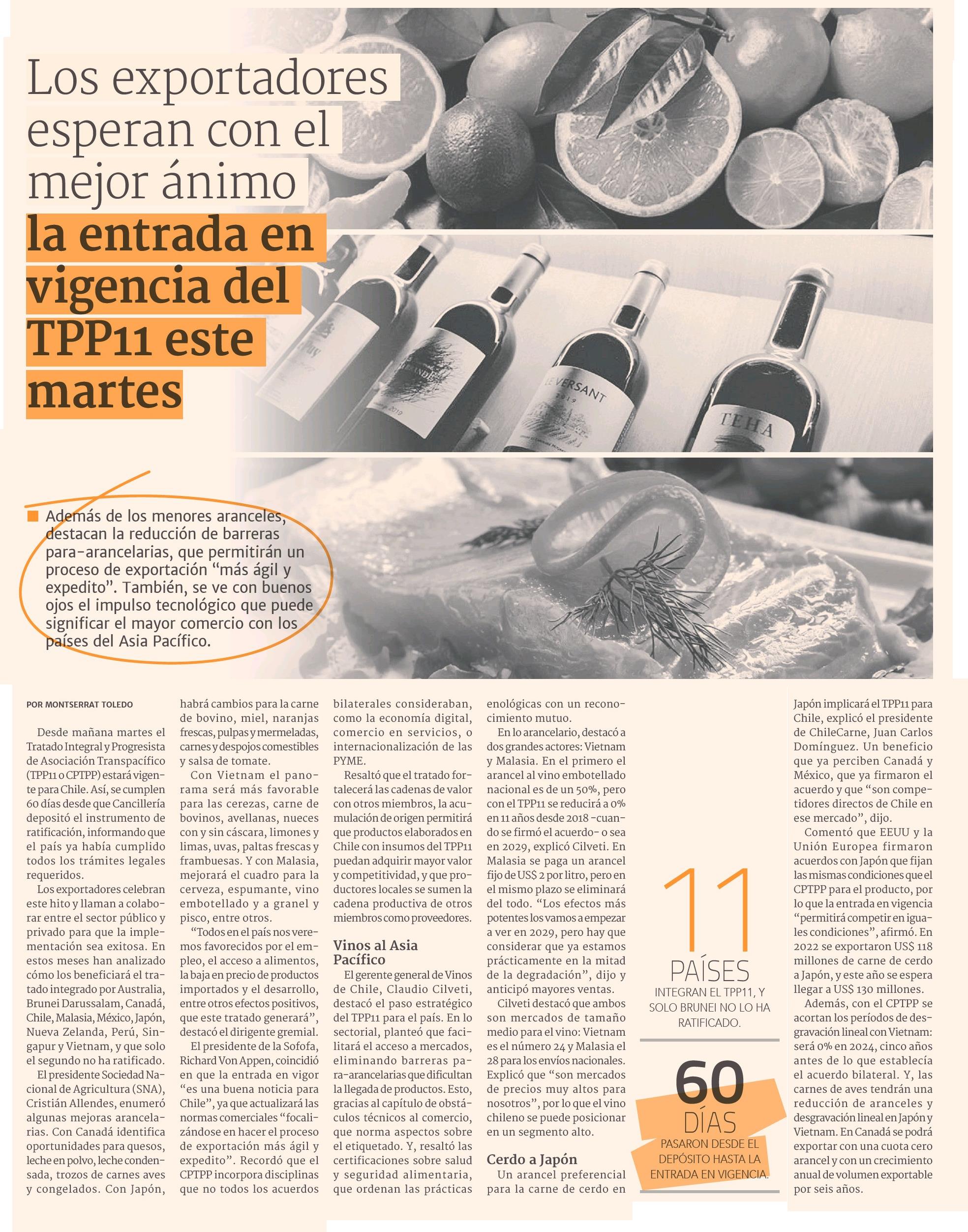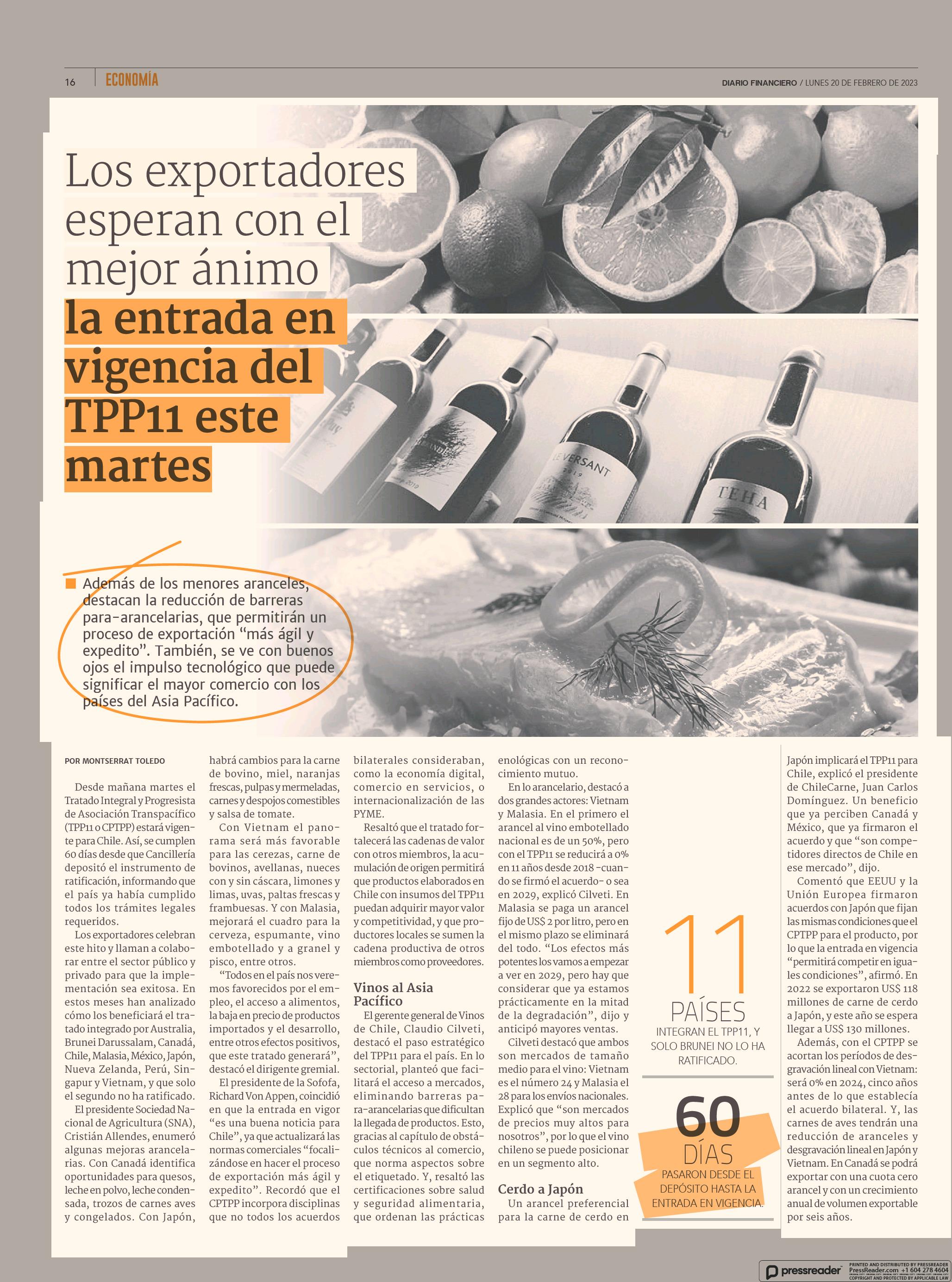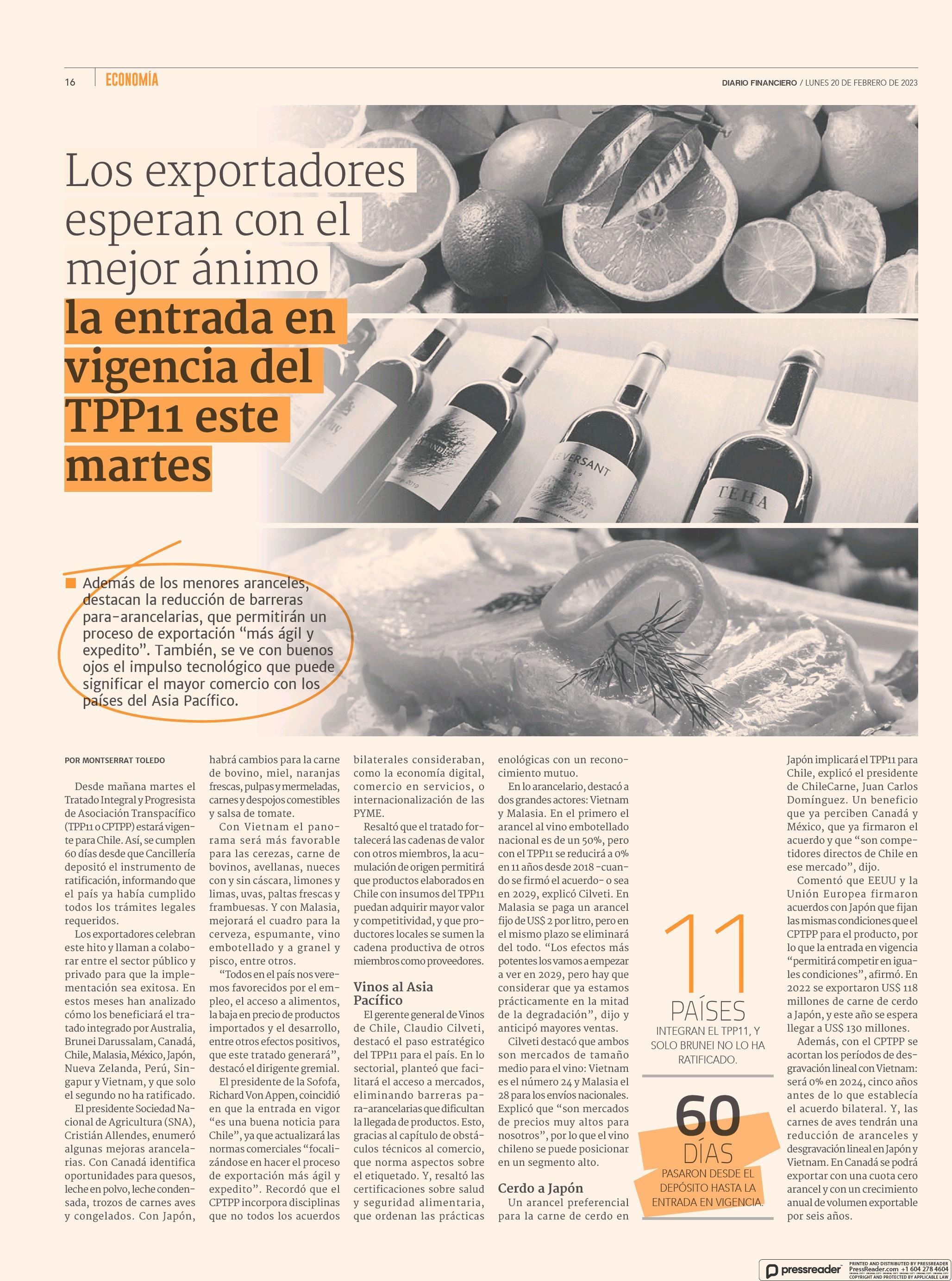 Los exportadores esperan con el mejor ánimo la entrada en vigencia del TPP11 este martes 20-02-2023 Diario Financiero |