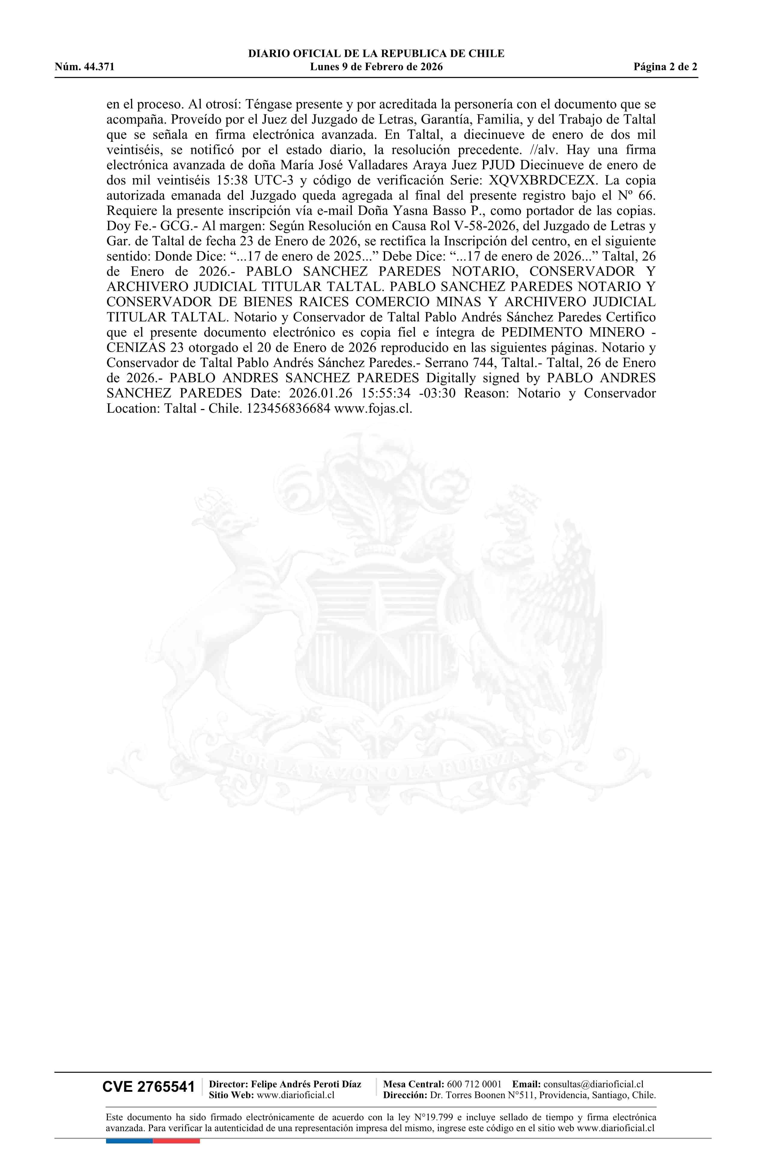 CENIZAS 23 / Vale Exploraciones Chile Limitada 09-02-2026 DIARIO OFICIAL CHILE - BOLETÍN OFICIAL DE MINERÍA |