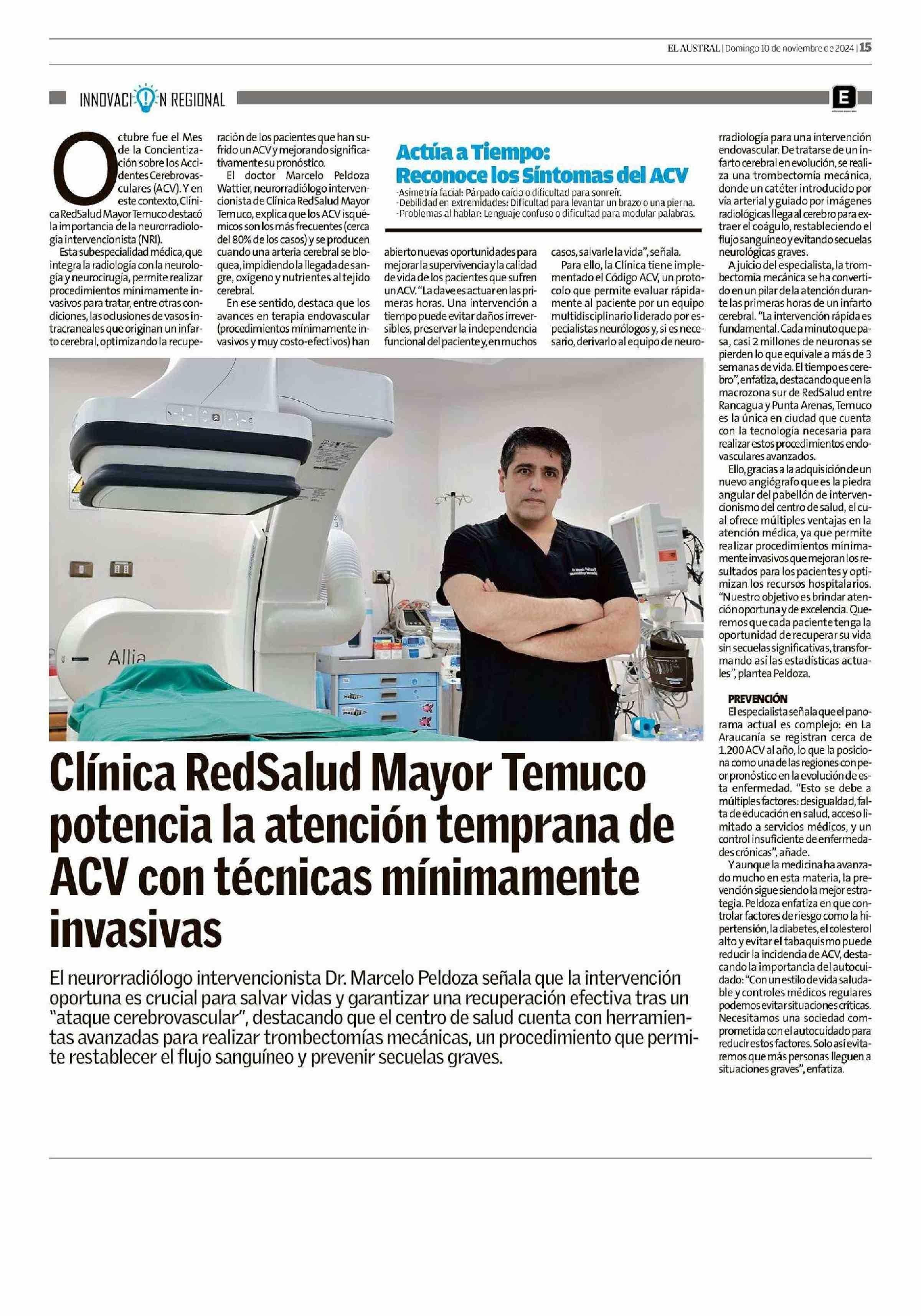Clínica RedSalud Mayor Temuco potencia la atención temprana de Invasivas ACV con técnicas mínimamente 10-11-2024 El Austral de la Araucanía |