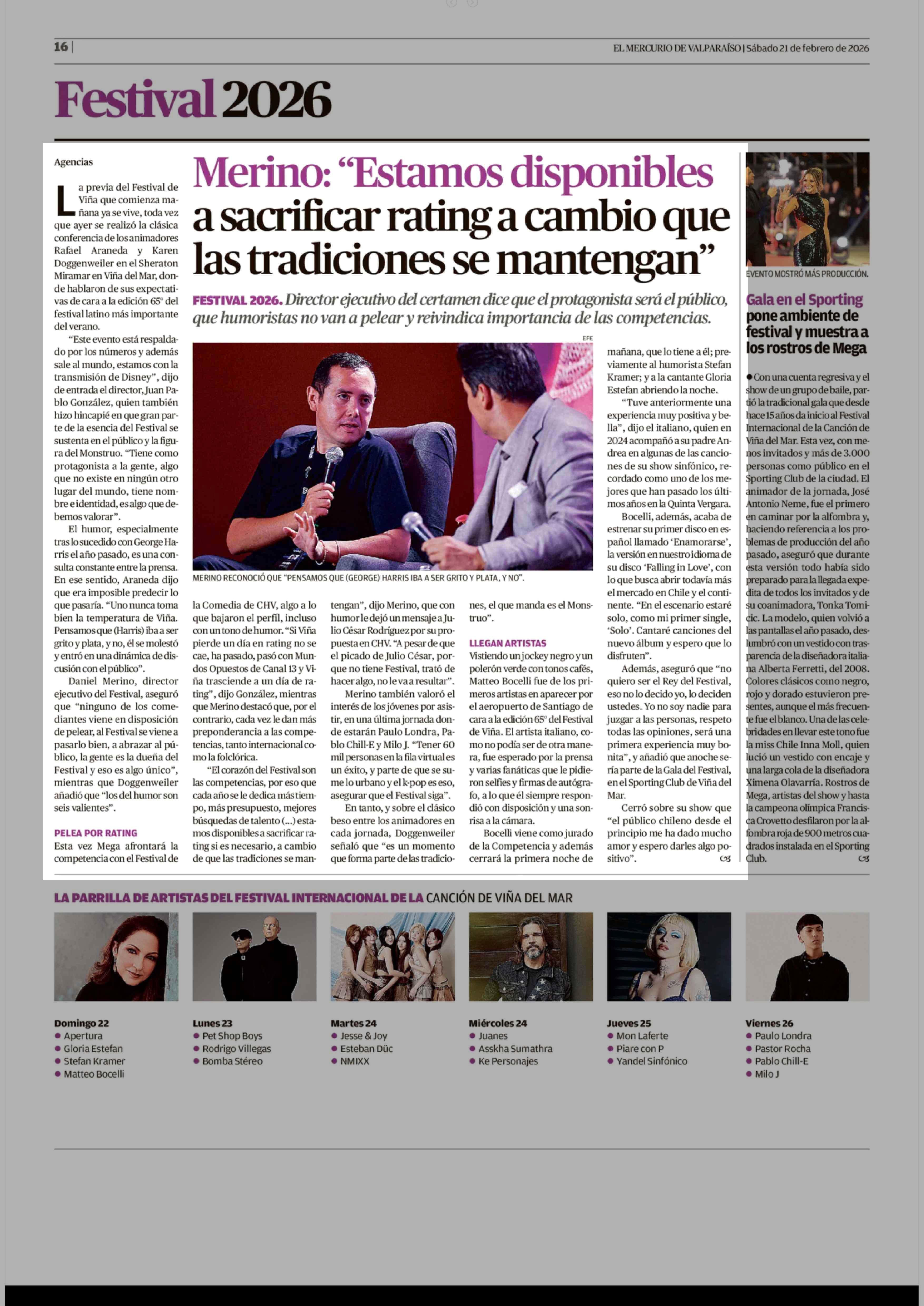 Merino: "Estamos disponibles a sacrificar rating a cambio que las tradiciones se mantengan" 21-02-2026 El Mercurio de Valparaíso |