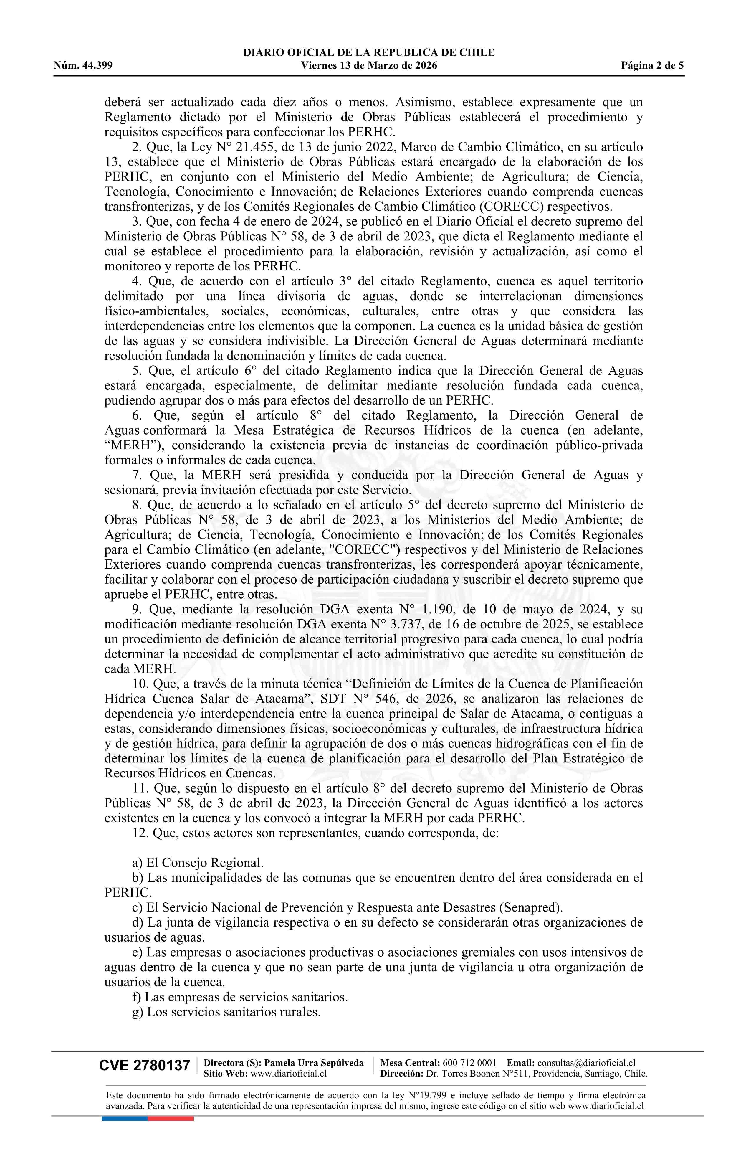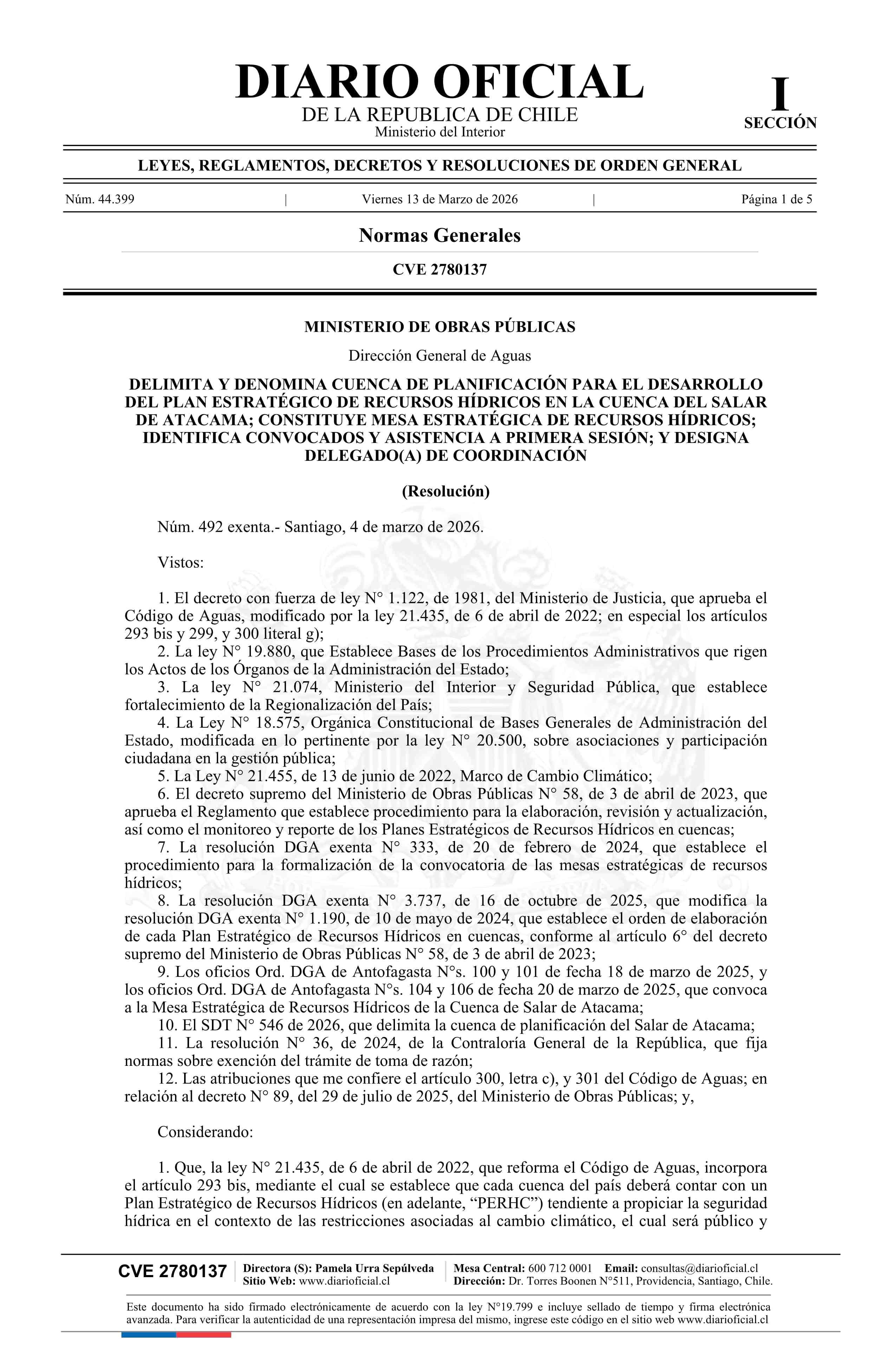 | Título: | Resolución exenta número 492, de 2026.- Delimita y denomina cuenca de planificación para el desarrollo del Plan Estratégico de Recursos Hídricos en la Cuenca del Salar de Atacama; constituye Mesa Estratégica de Recursos Hídricos; identifica convocados y asistencia a primera sesión; y designa Delegad |