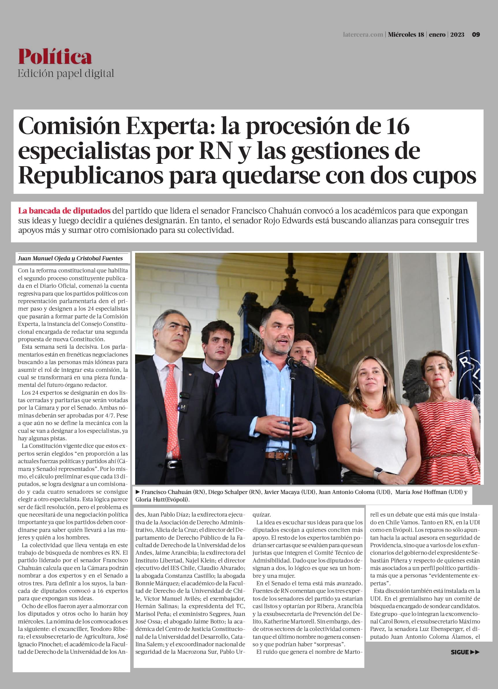 Comisión Experta: la procesión de 16 especialistas por RN y las gestiones de Republicanos para quedarse con dos cupos 18-01-2023 La Tercera |