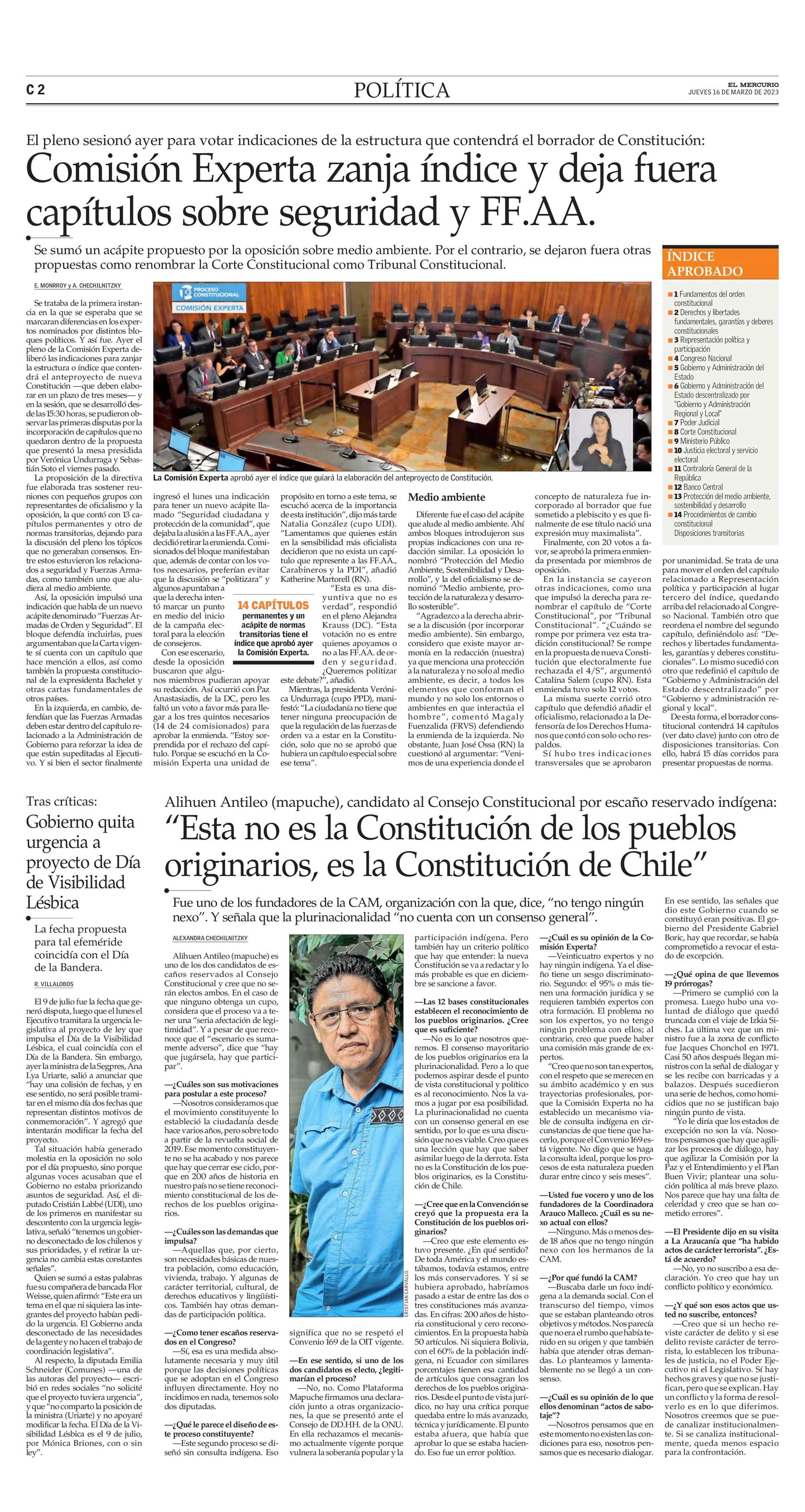 Comisión Experta zanja índice y deja fuera capítulos sobre seguridad y FF.AA. 16-03-2023 El Mercurio |