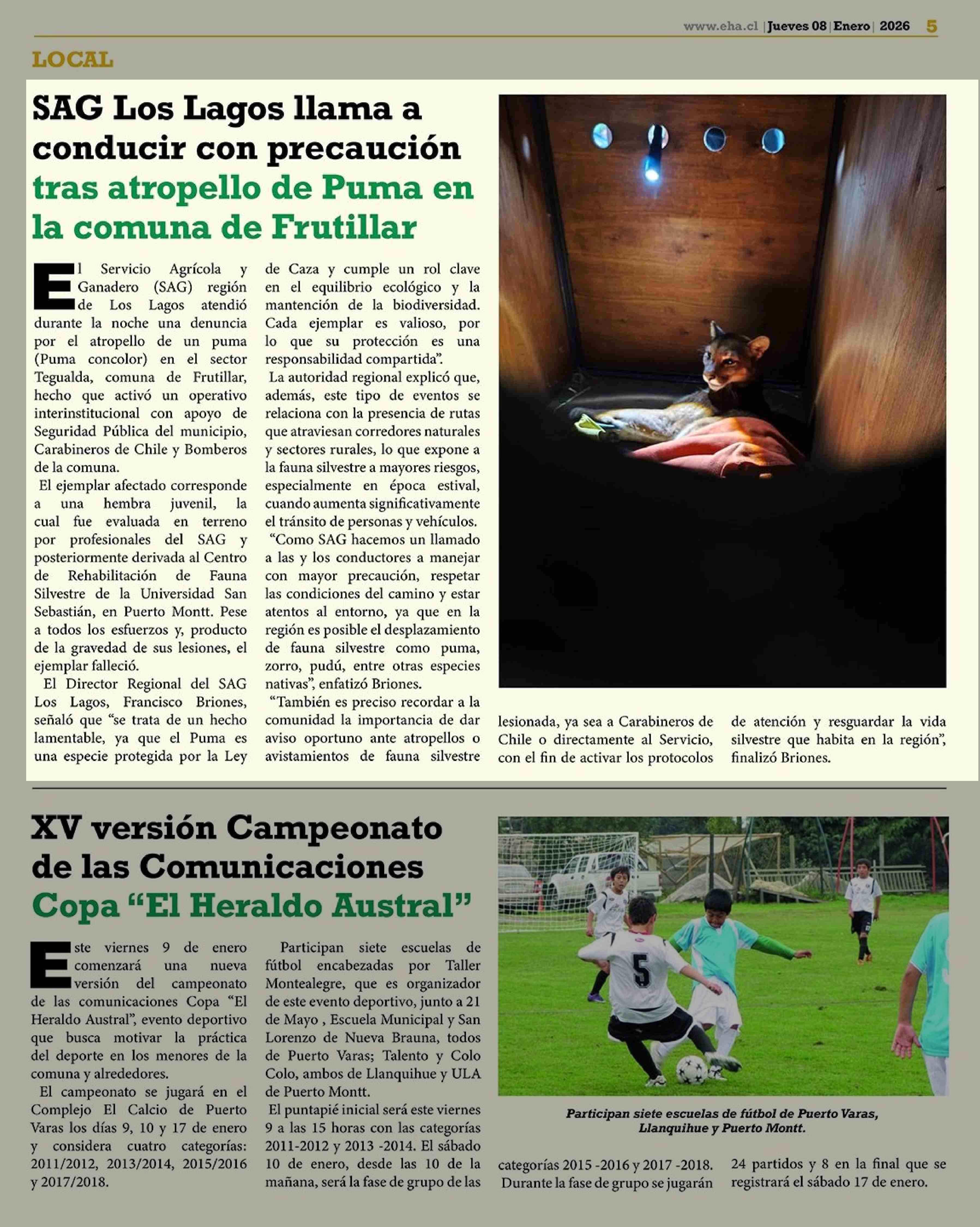 SAG Los Lagos llama a conducir con precaución tras atropello de Puma en la comuna de Frutillar 08-01-2026 El Heraldo Austral |