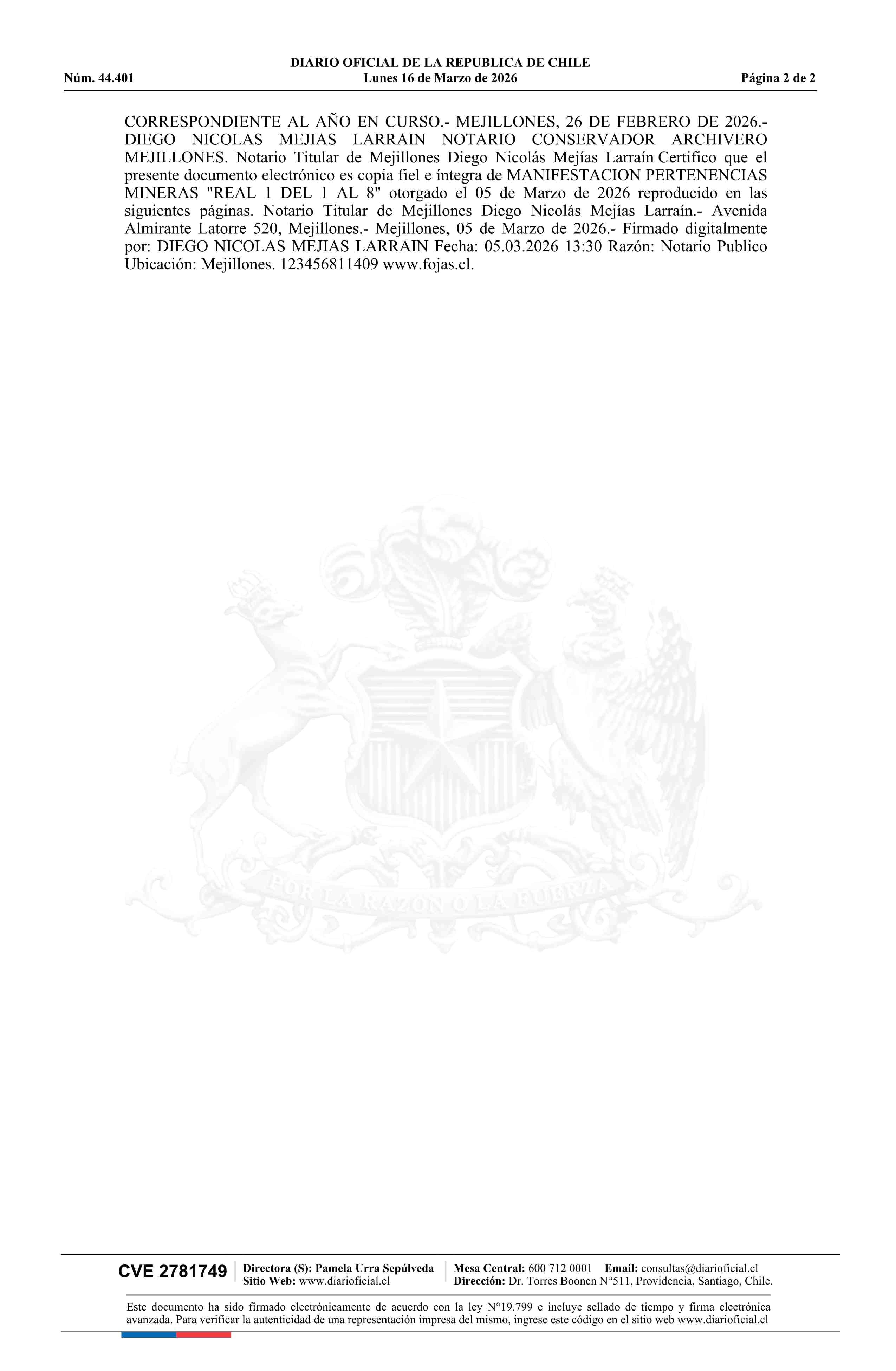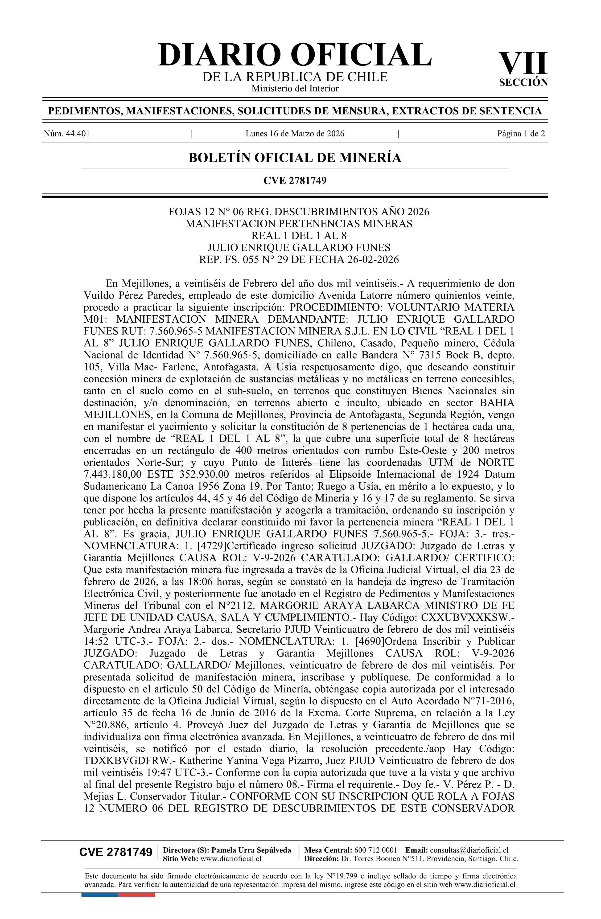 REAL 1 DEL 1 AL 8 / Gallardo Funes Julio Enrique 16-03-2026 DIARIO OFICIAL CHILE - BOLETÍN OFICIAL DE MINERÍA |