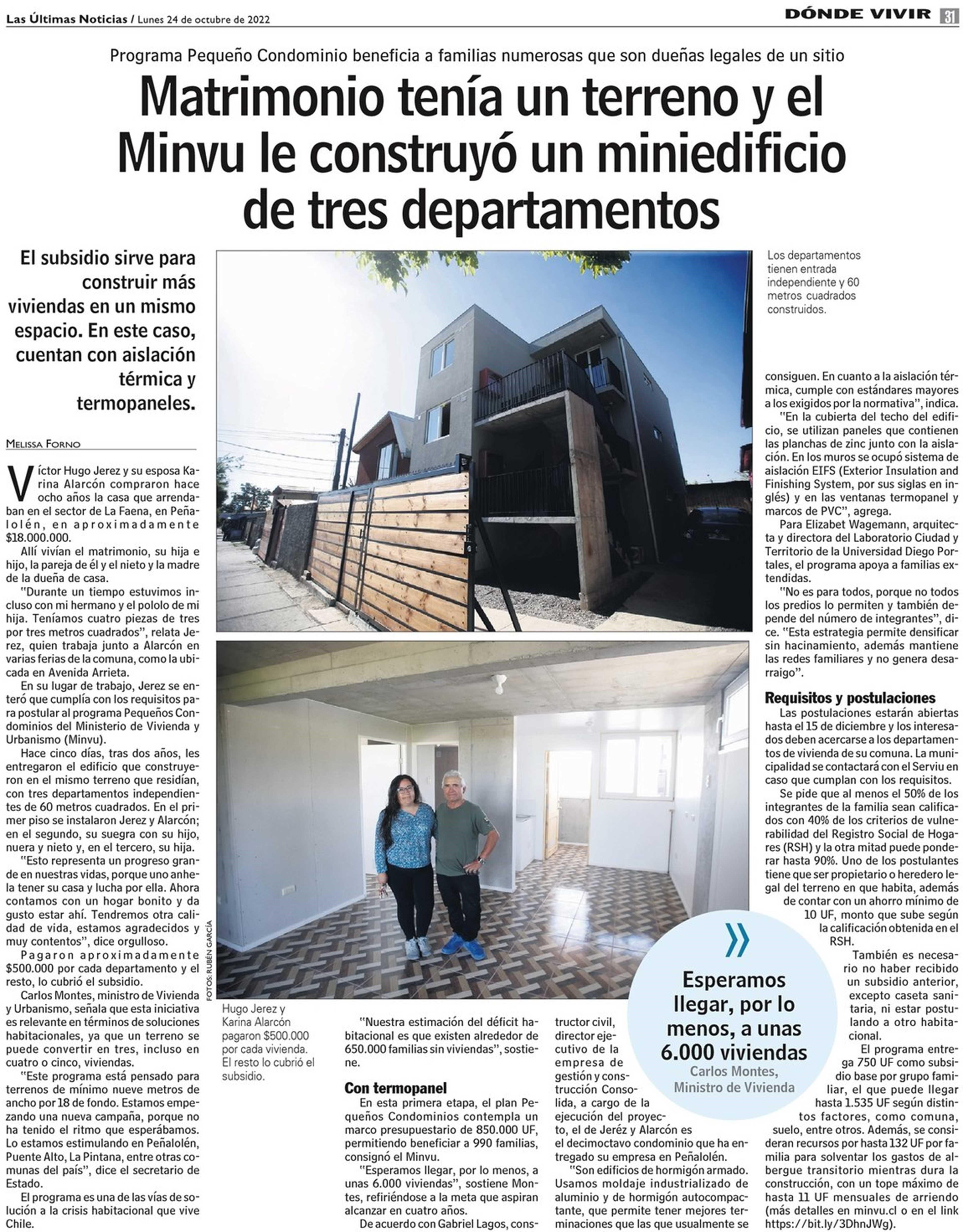Matrimonio tenía un terreno y el Minvu le construyó un miniedificio de tres departamentos 24-10-2022 Las Últimas Noticias |