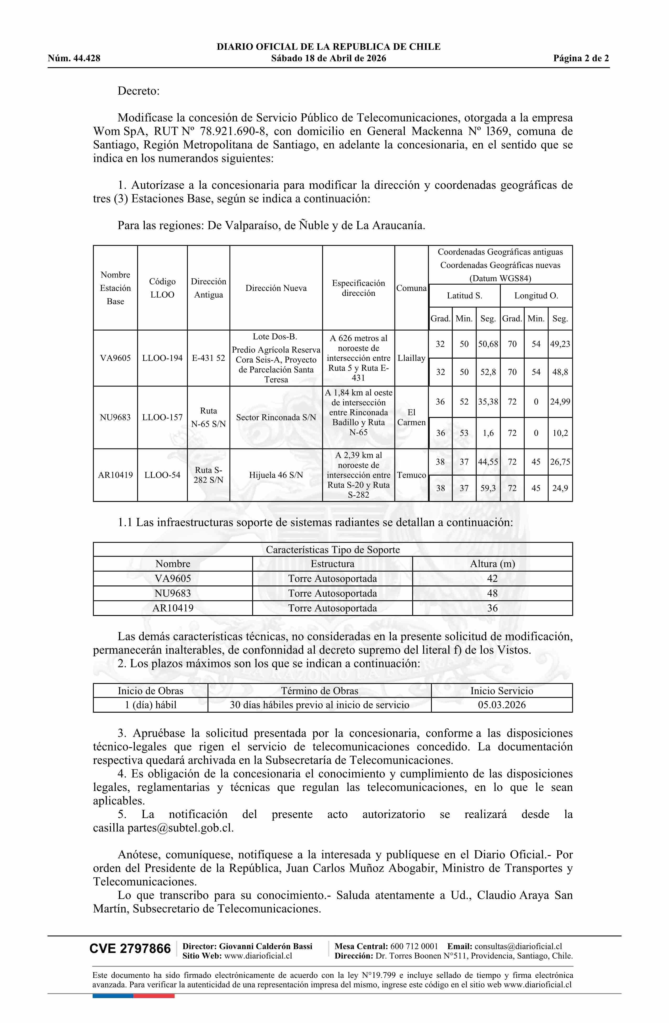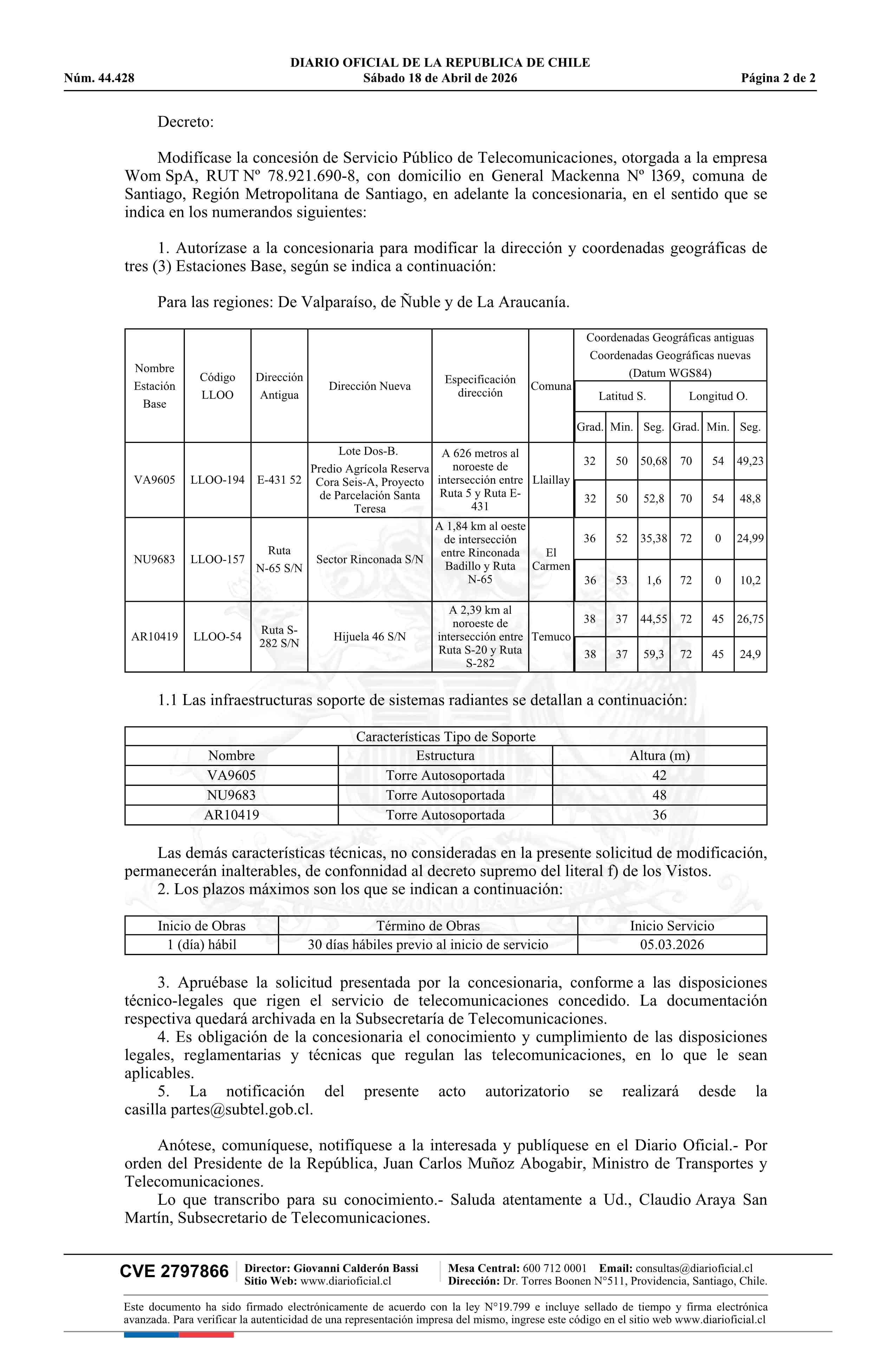 Decreto exento número 141, de 2026.- Modifica concesión de servicio público de telecomunicaciones a la empresa Wom SpA 18-04-2026 Diario Oficial Edición Electrónica |