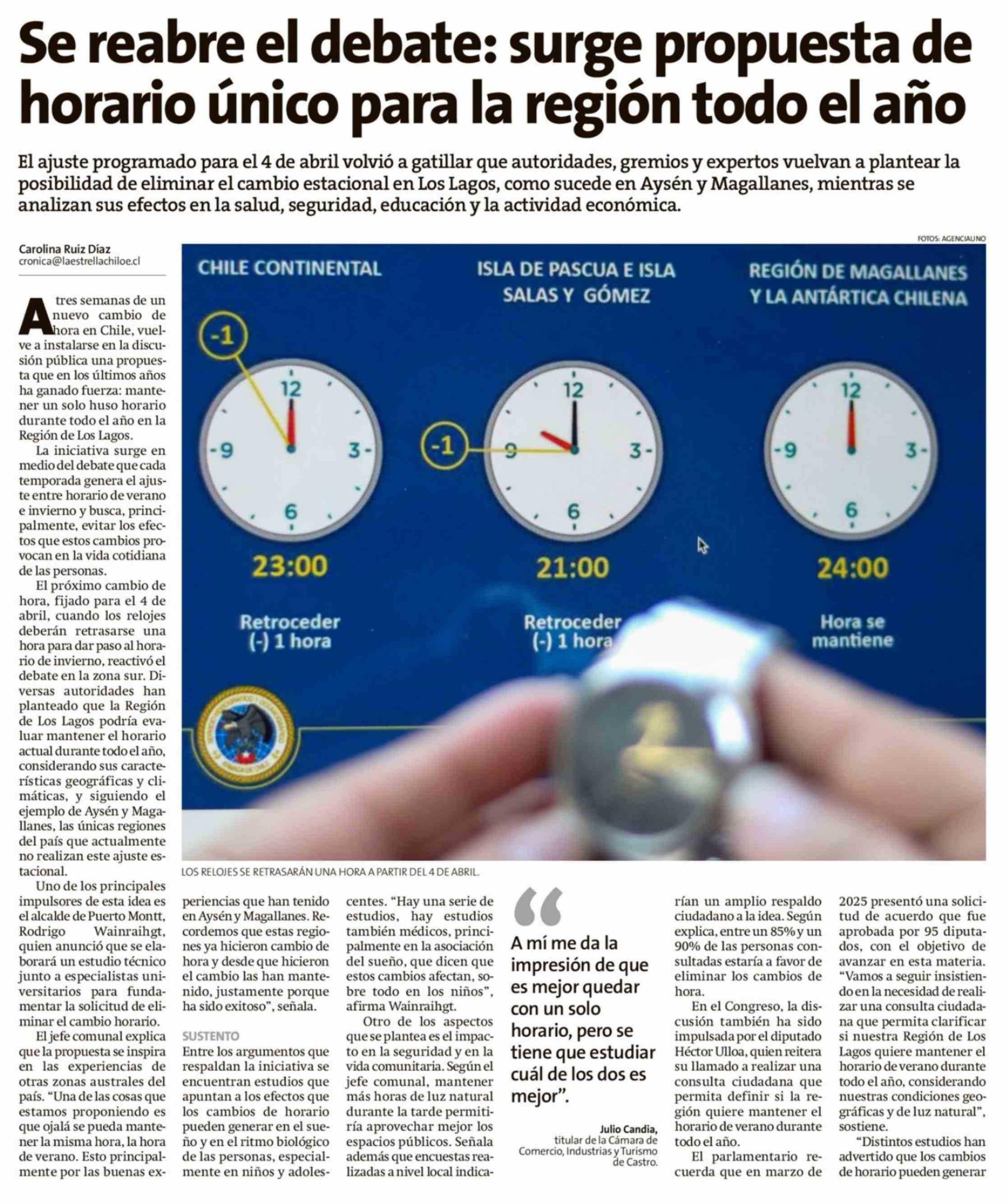 Se reabre el debate: surge propuesta de horario único para la región todo el año 15-03-2026 La Estrella de Chiloé |