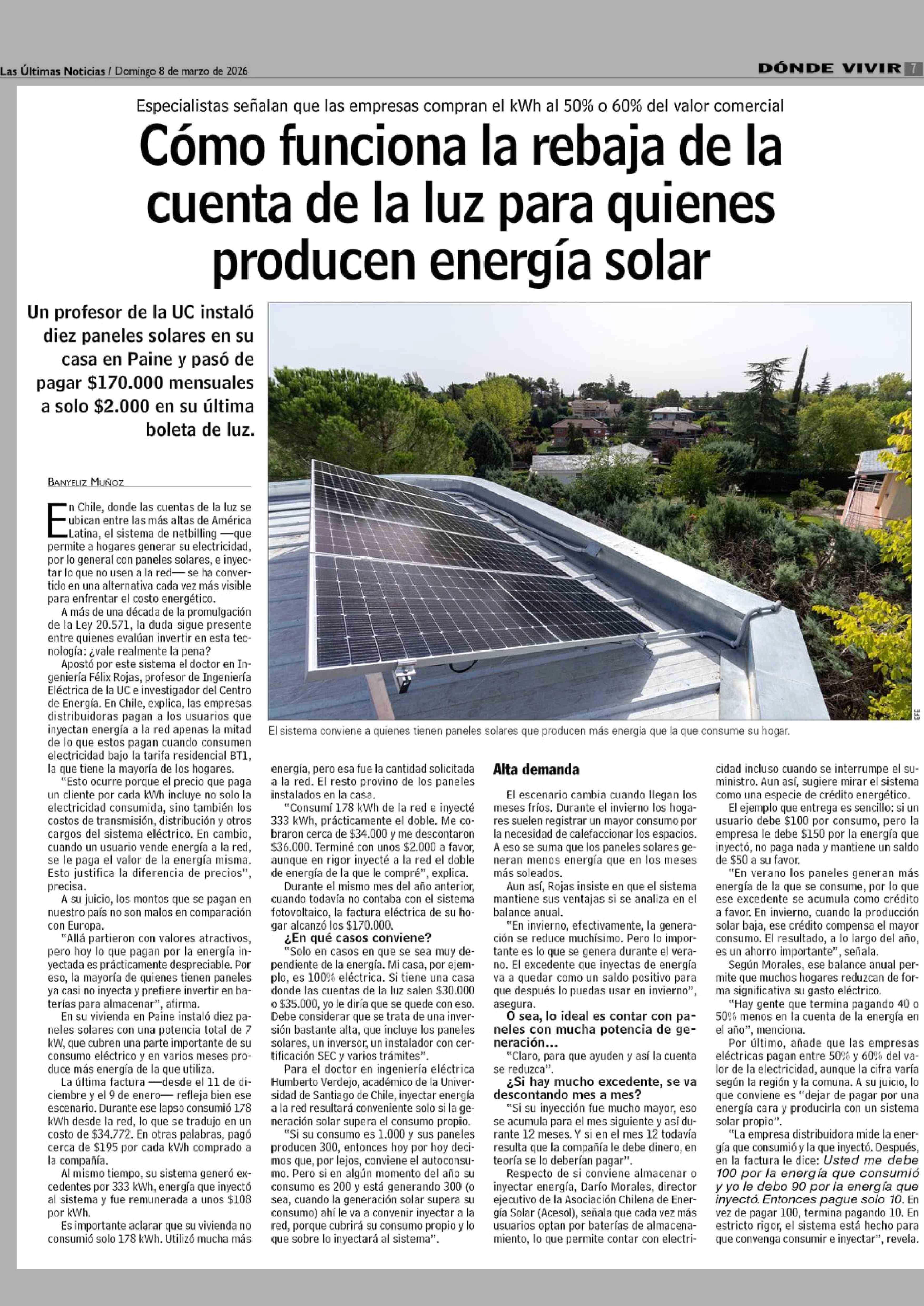 Cómo funciona la rebaja de la cuenta de la luz para quienes producen energía solar 08-03-2026 Las Últimas Noticias |