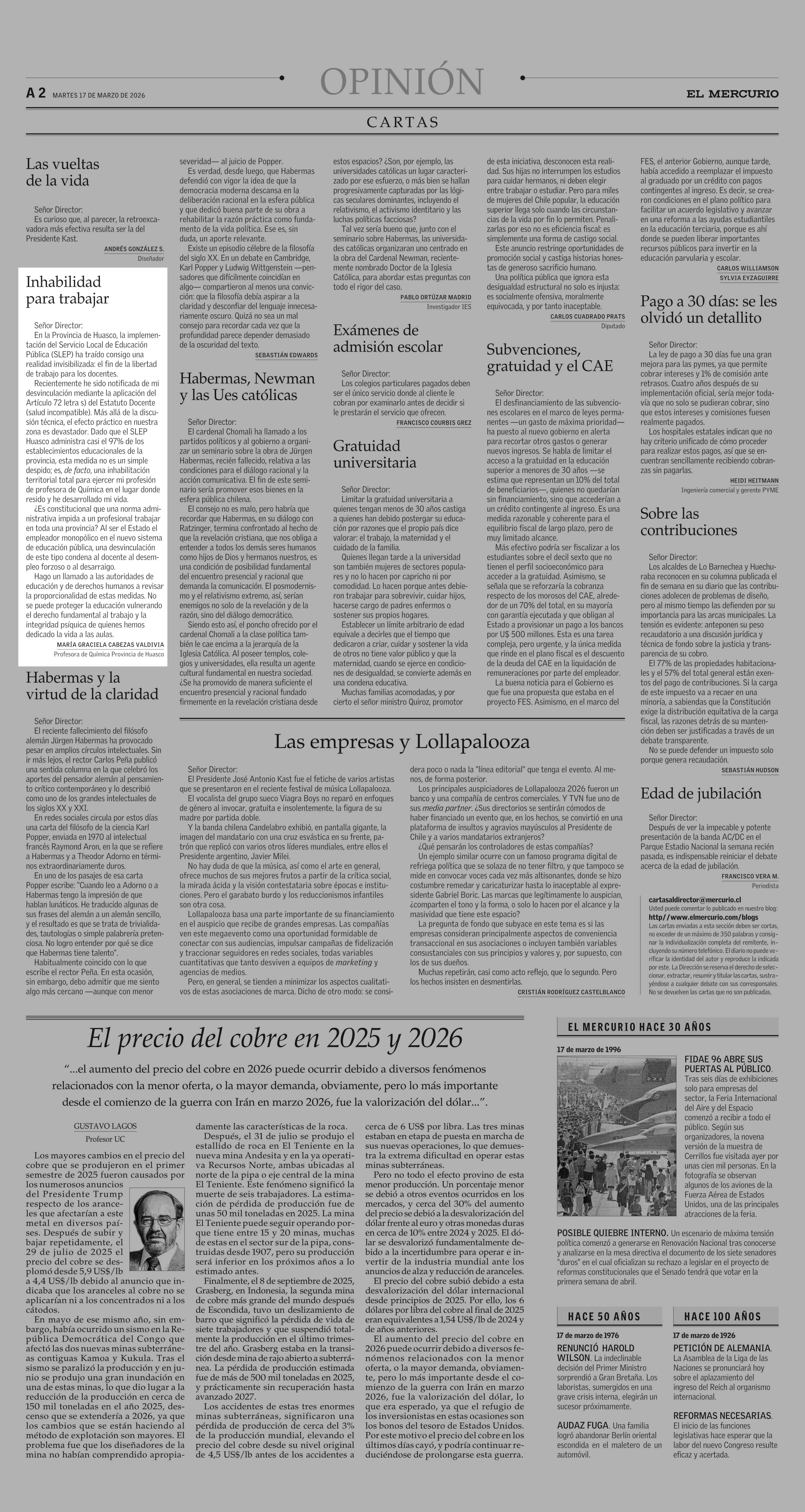Cartas: Inhabilidad para trabajar 17-03-2026 El Mercurio |