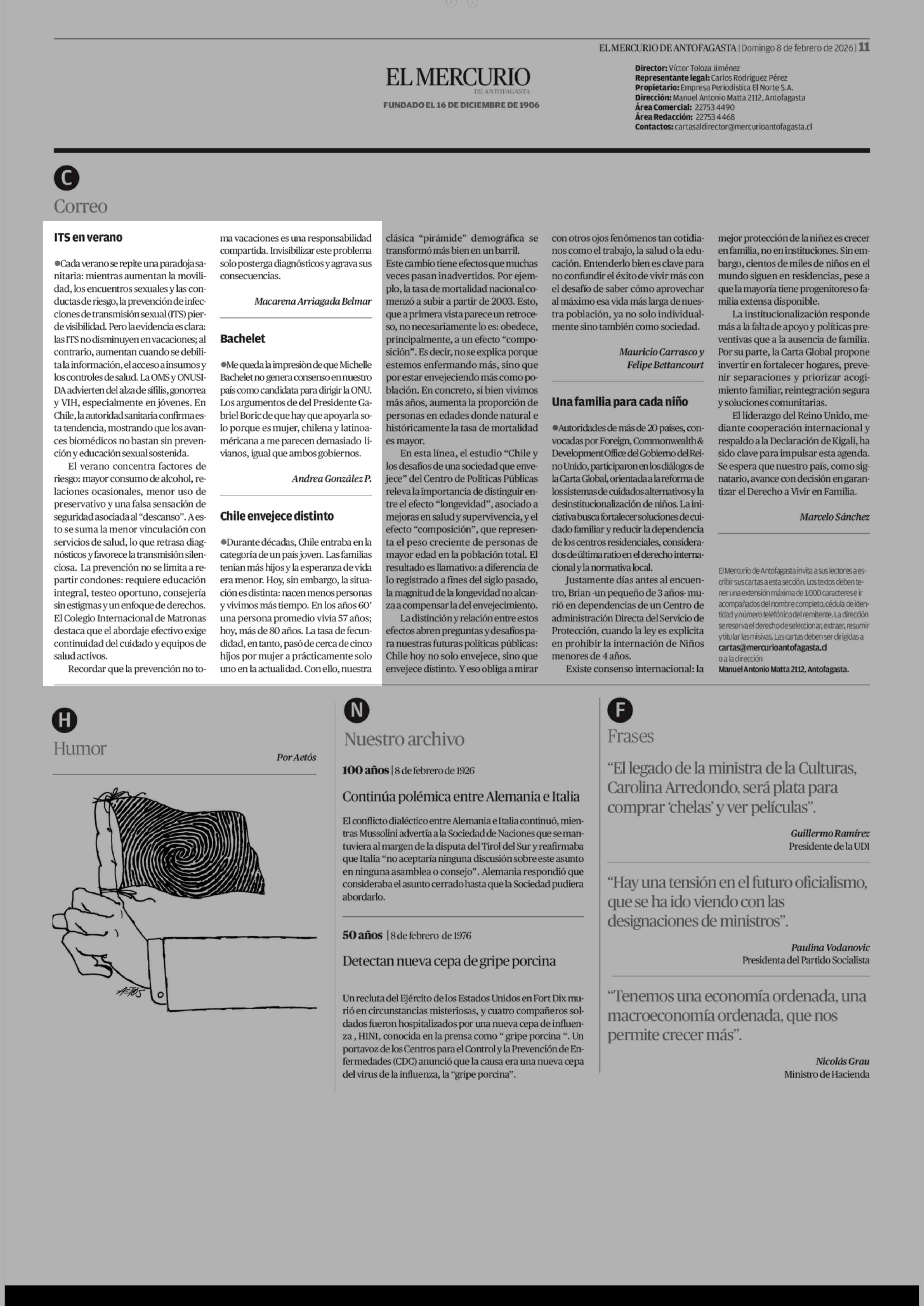 Cartas: ITS en verano 08-02-2026 El Mercurio de Antofagasta |
