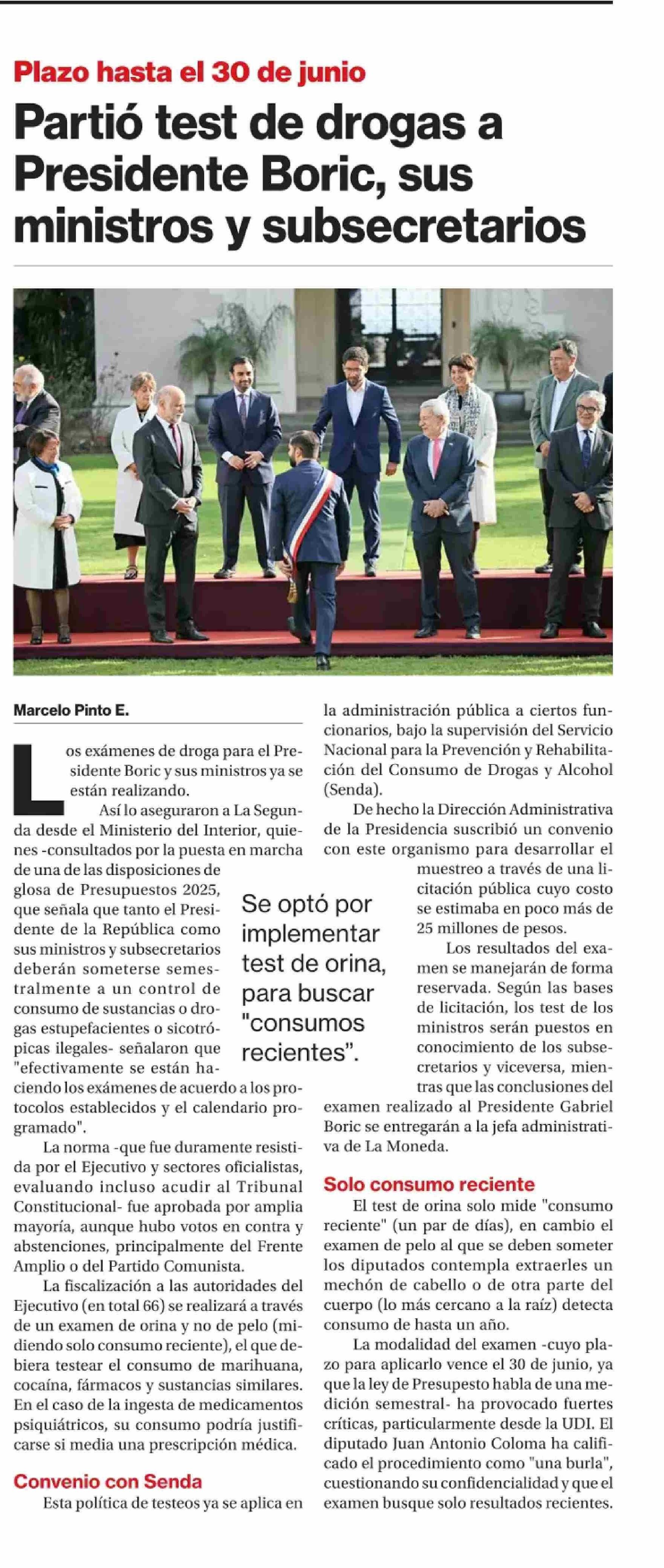 Partió test de drogas a Presidente Boric, sus ministros y subsecretarios 19-06-2025 La Segunda |