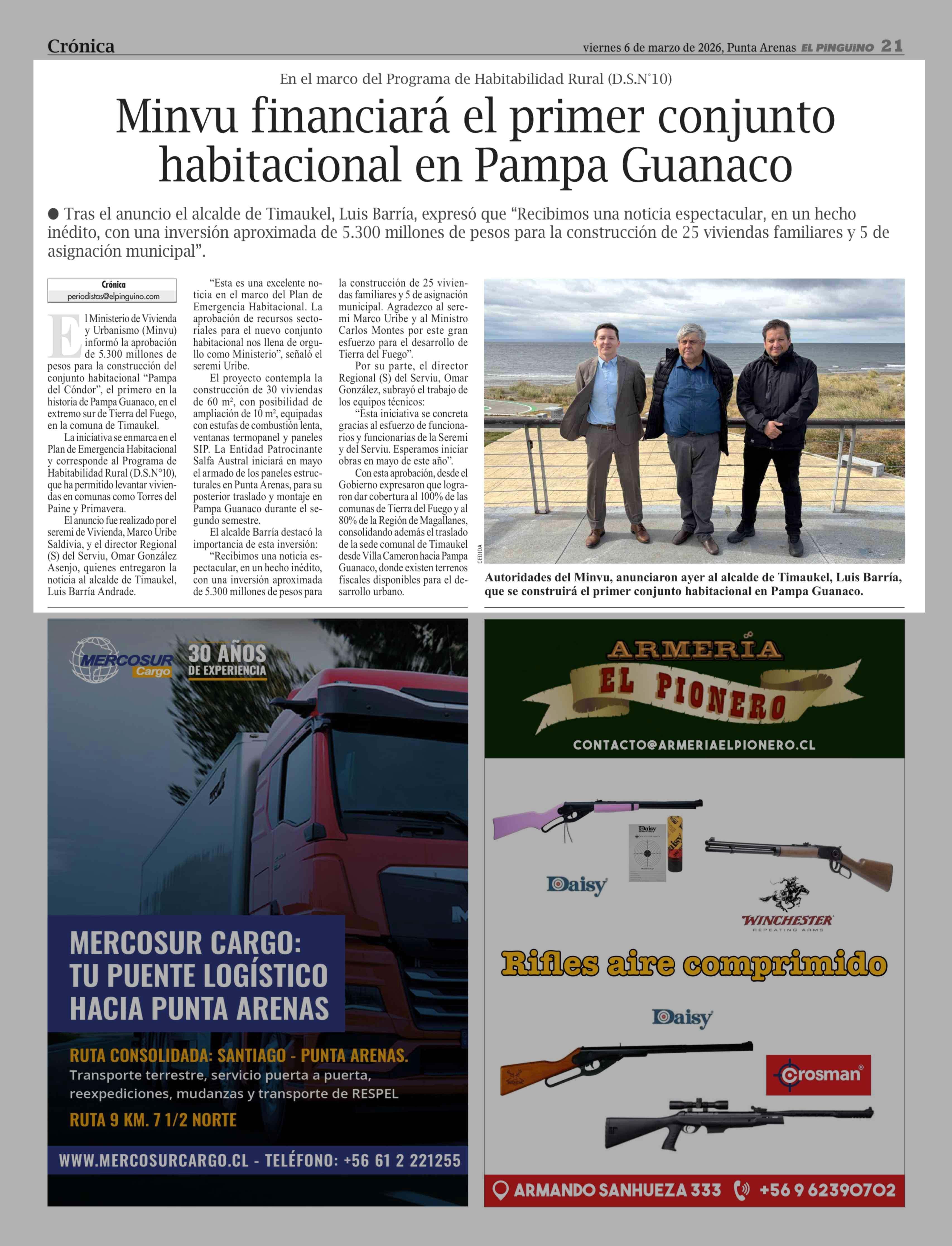 Minvu financiará el primer conjunto habitacional en Pampa Guanaco 06-03-2026 El Pingüino |