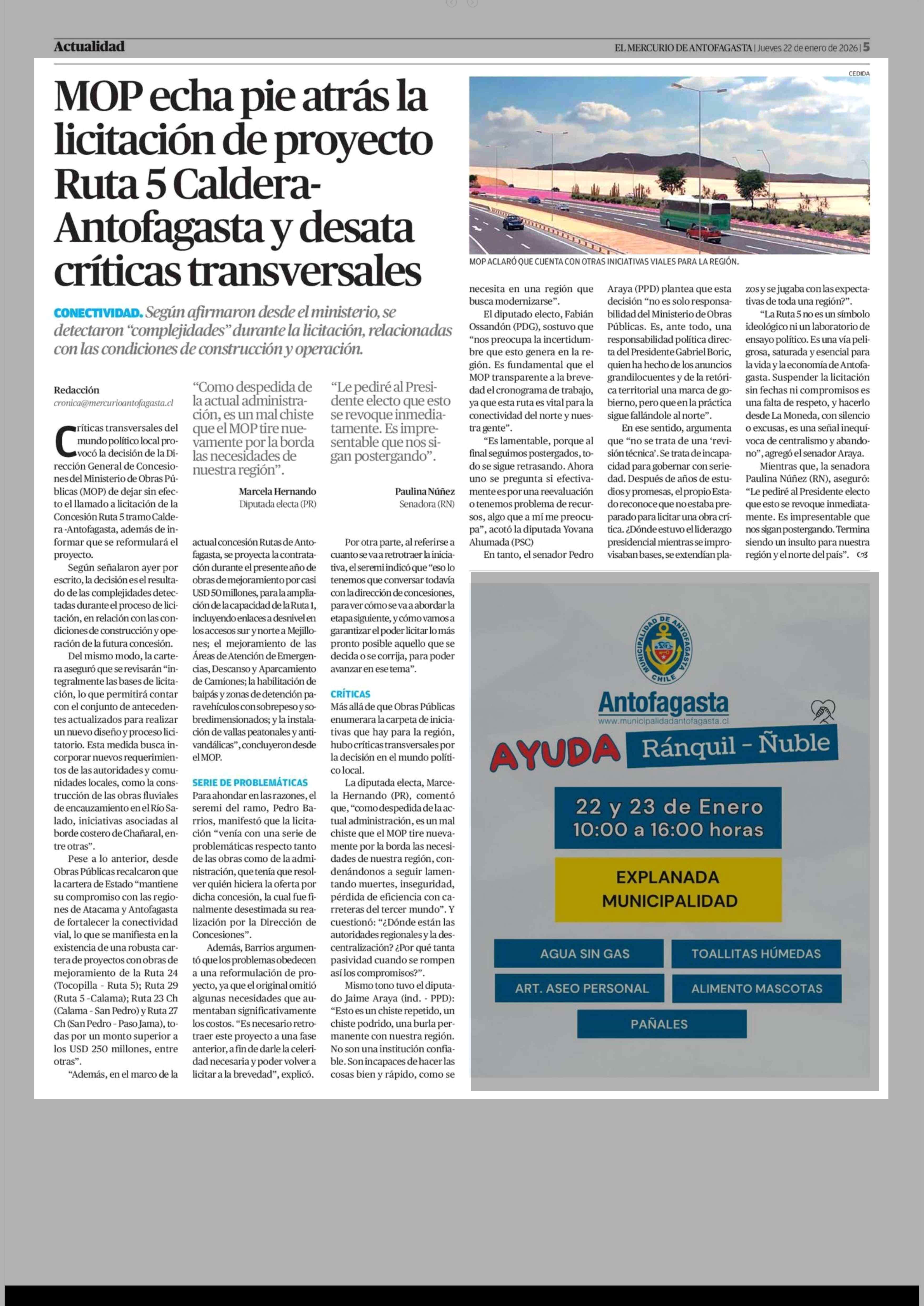 MOP echa pie atrás la licitación de proyecto Ruta 5 Caldera- Antofagasta y desata 22-01-2026 El Mercurio de Antofagasta |