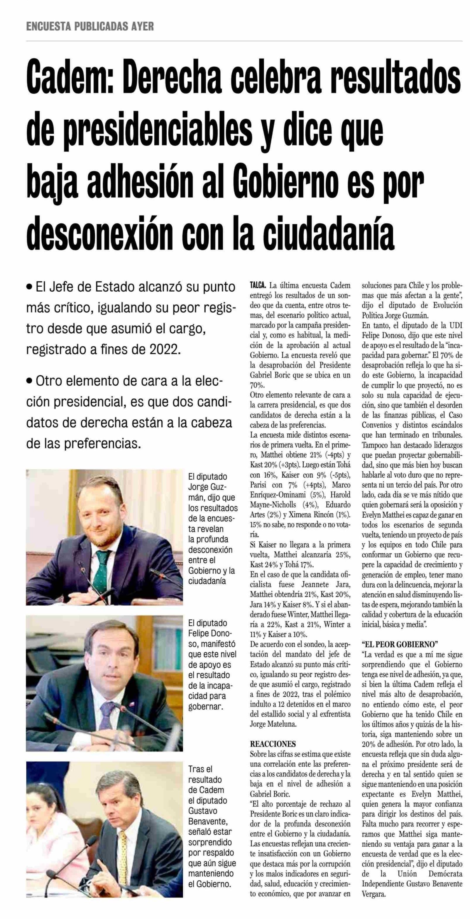 Cadem: Derecha celebra resultados de presidenciables y dice que baja adhesión al Gobierno es por desconexión con la ciudadanía 20-05-2025 La Prensa de Curicó |