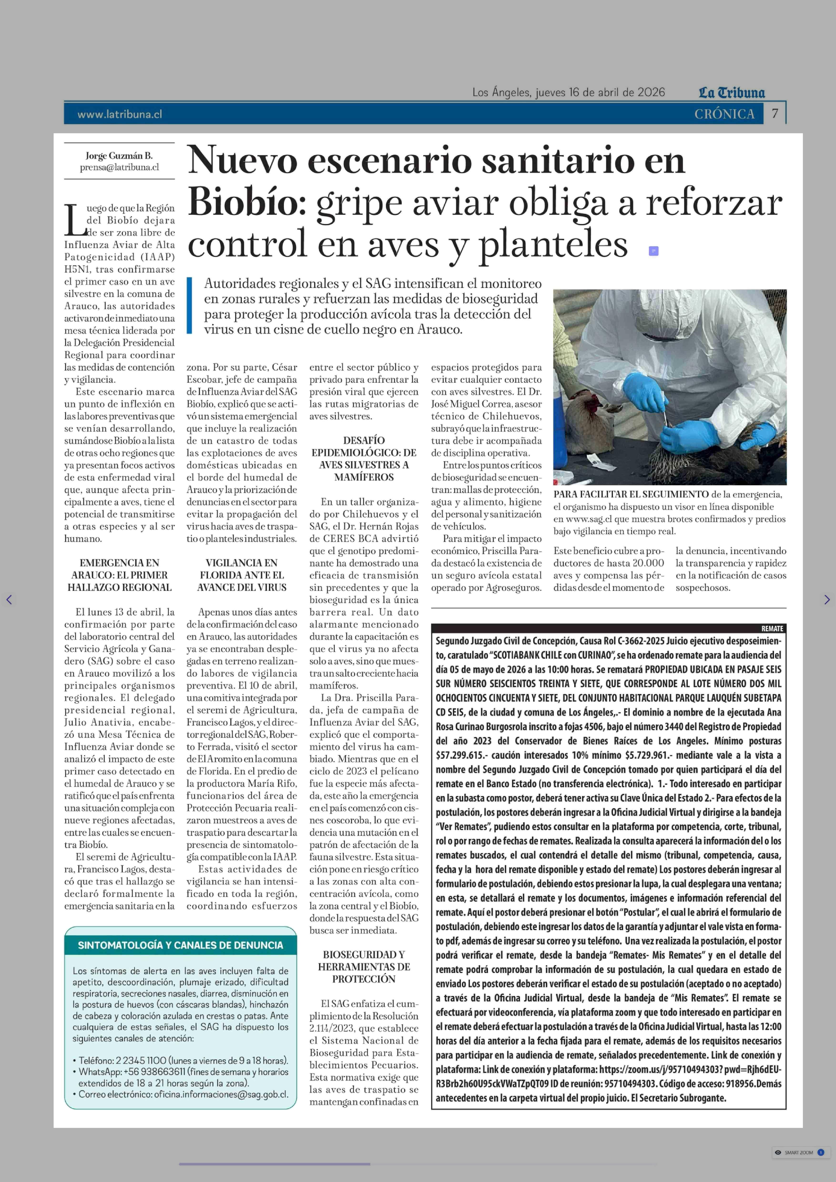Nuevo escenario sanitario en Biobío: gripe aviar obliga a reforzar control en aves y planteles 16-04-2026 La Tribuna |