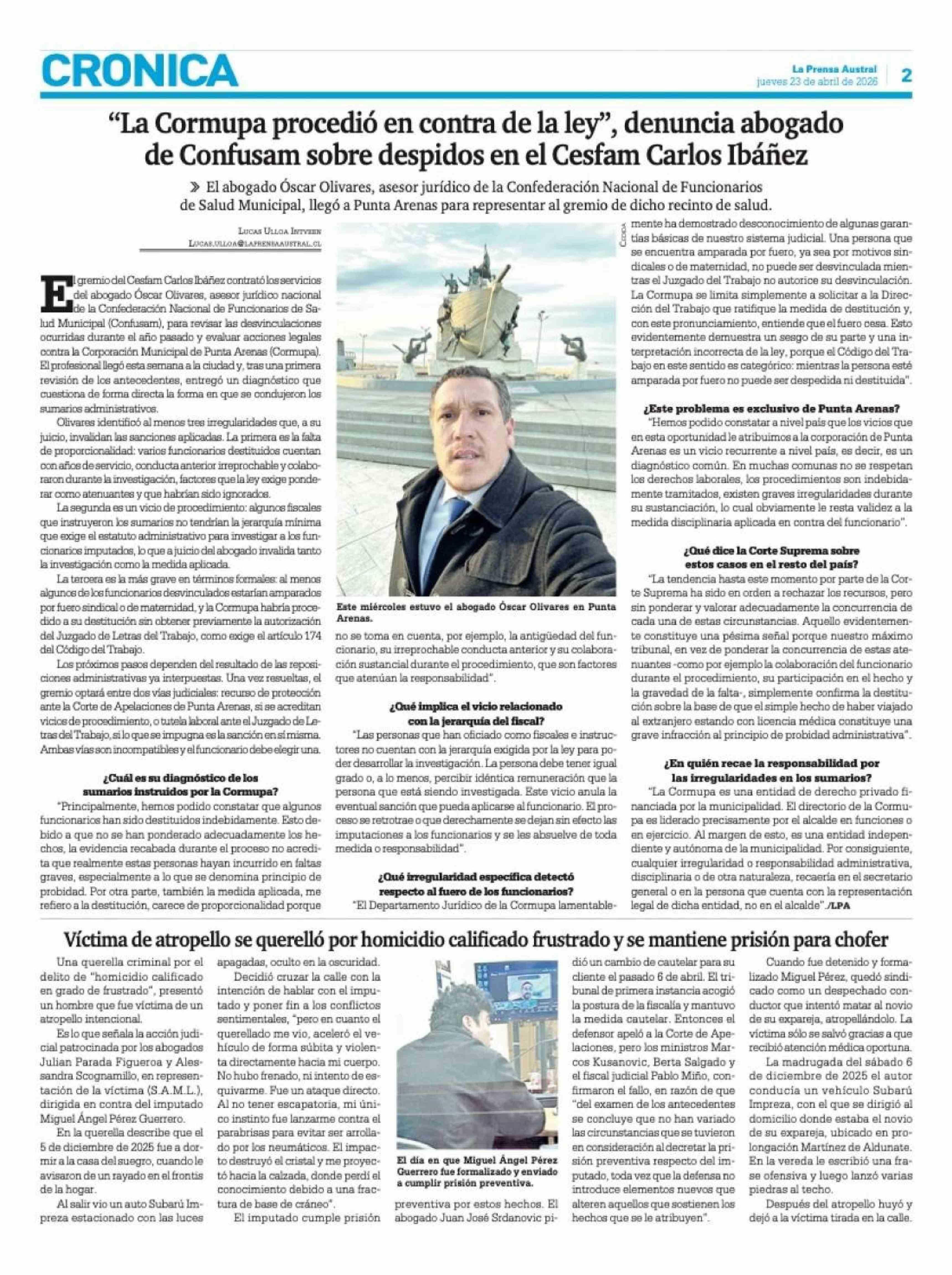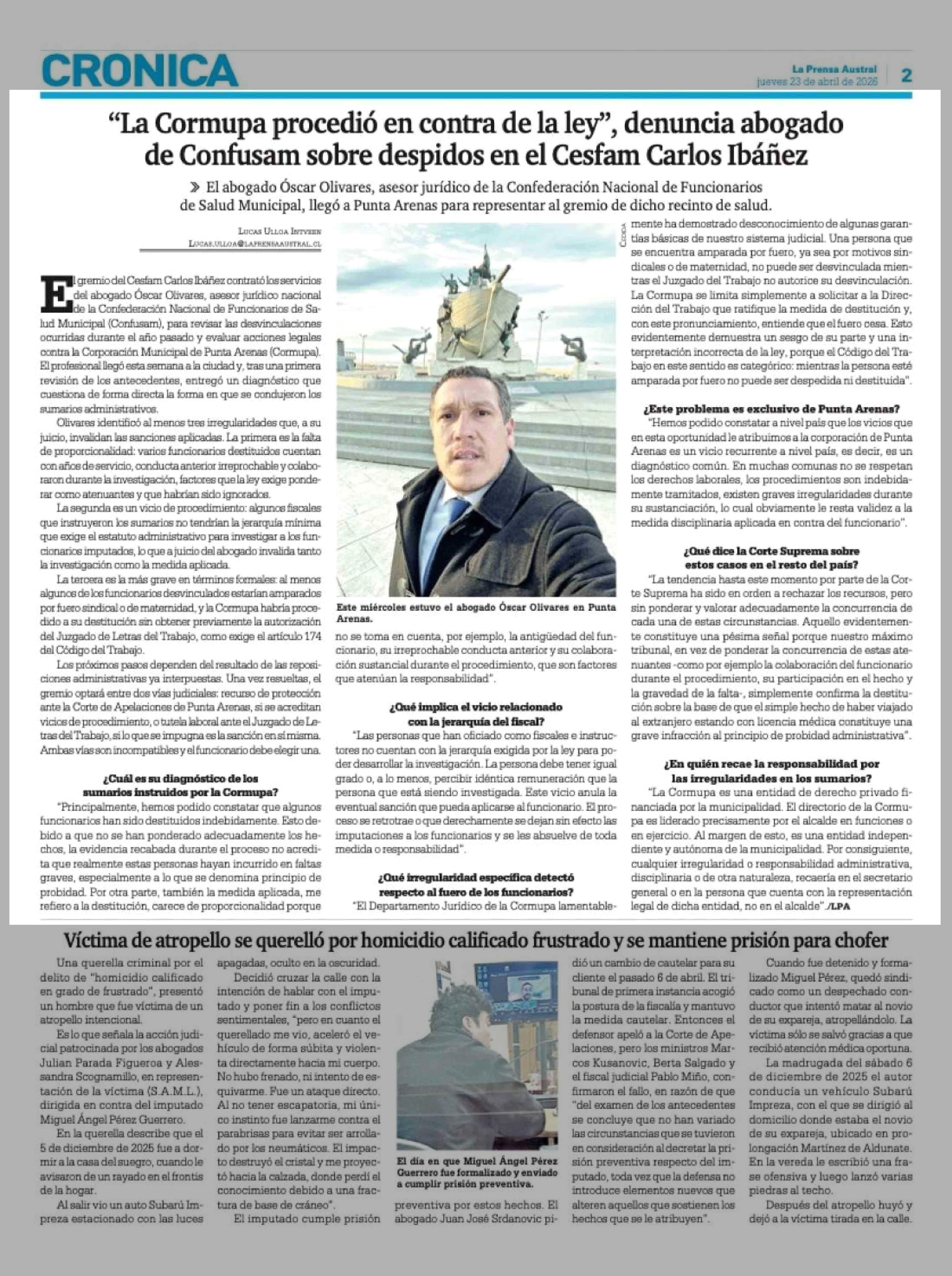 “La Cormupa procedió en contra de la ley”, denuncia abogado de Confusam sobre despidos en el Cesfam Carlos Ibáñez 23-04-2026 La Prensa Austral |