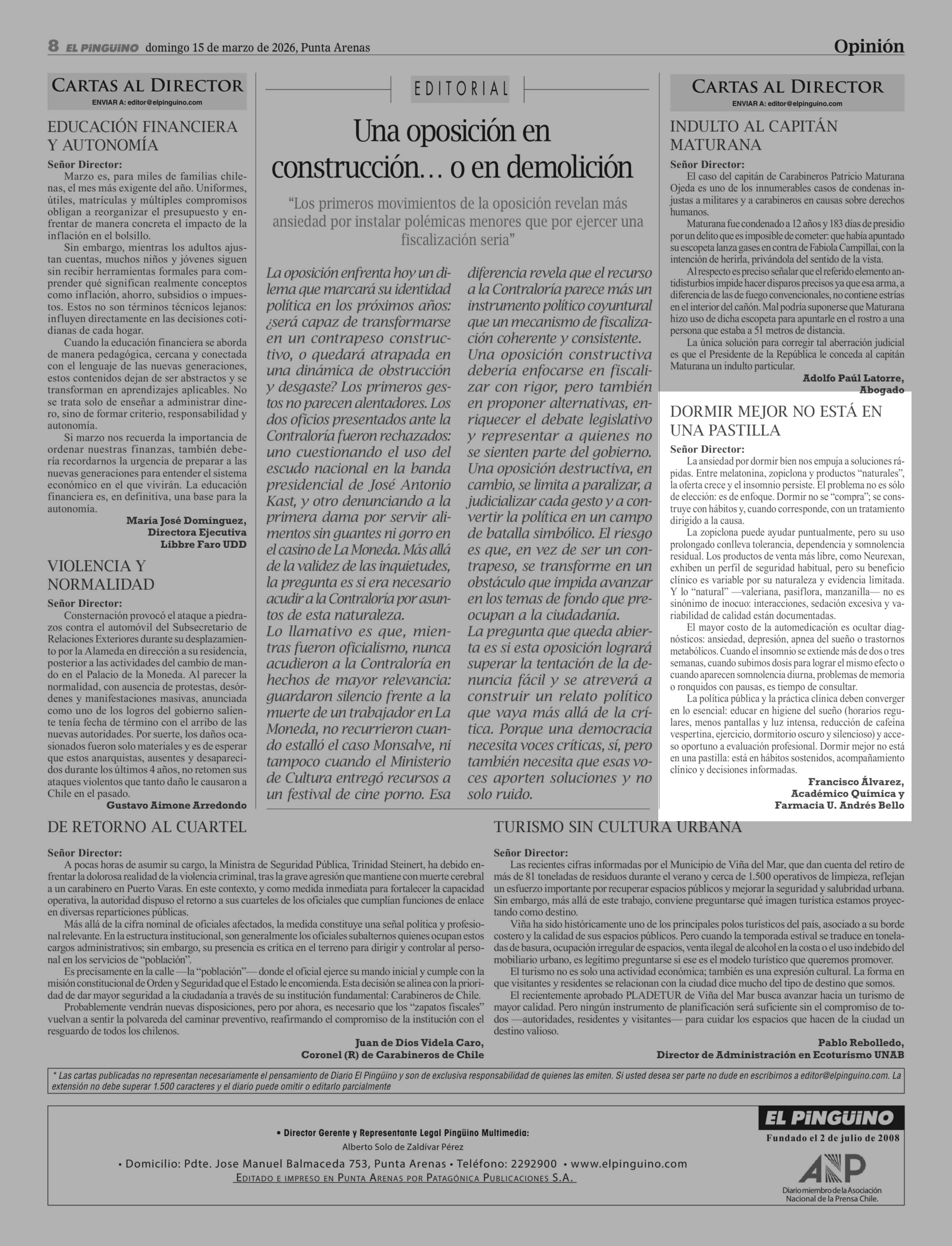 Cartas: DORMIR MEJOR NO ESTÁ EN UNA PASTILLA 15-03-2026 El Pingüino |