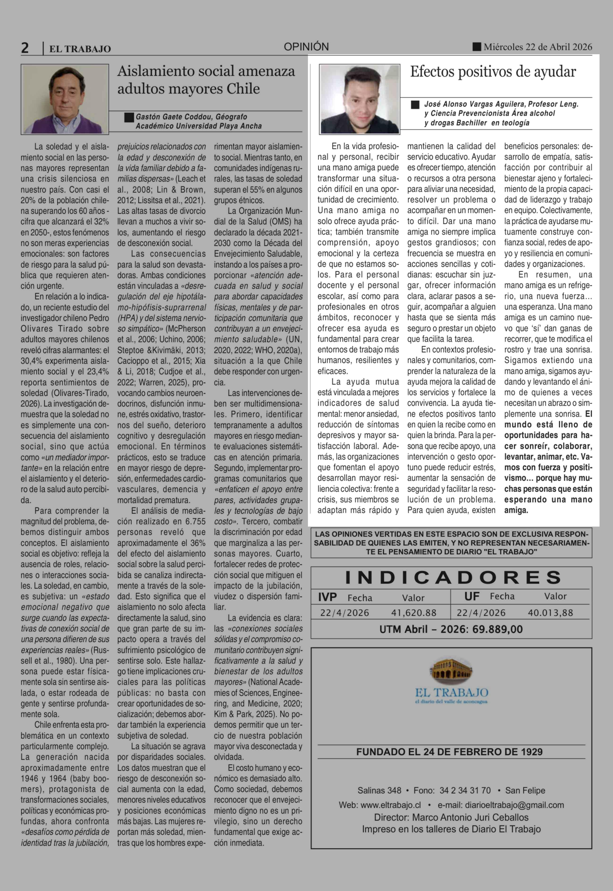 Columnas de Opinión: Efectos positivos de ayudar 22-04-2026 El Trabajo |