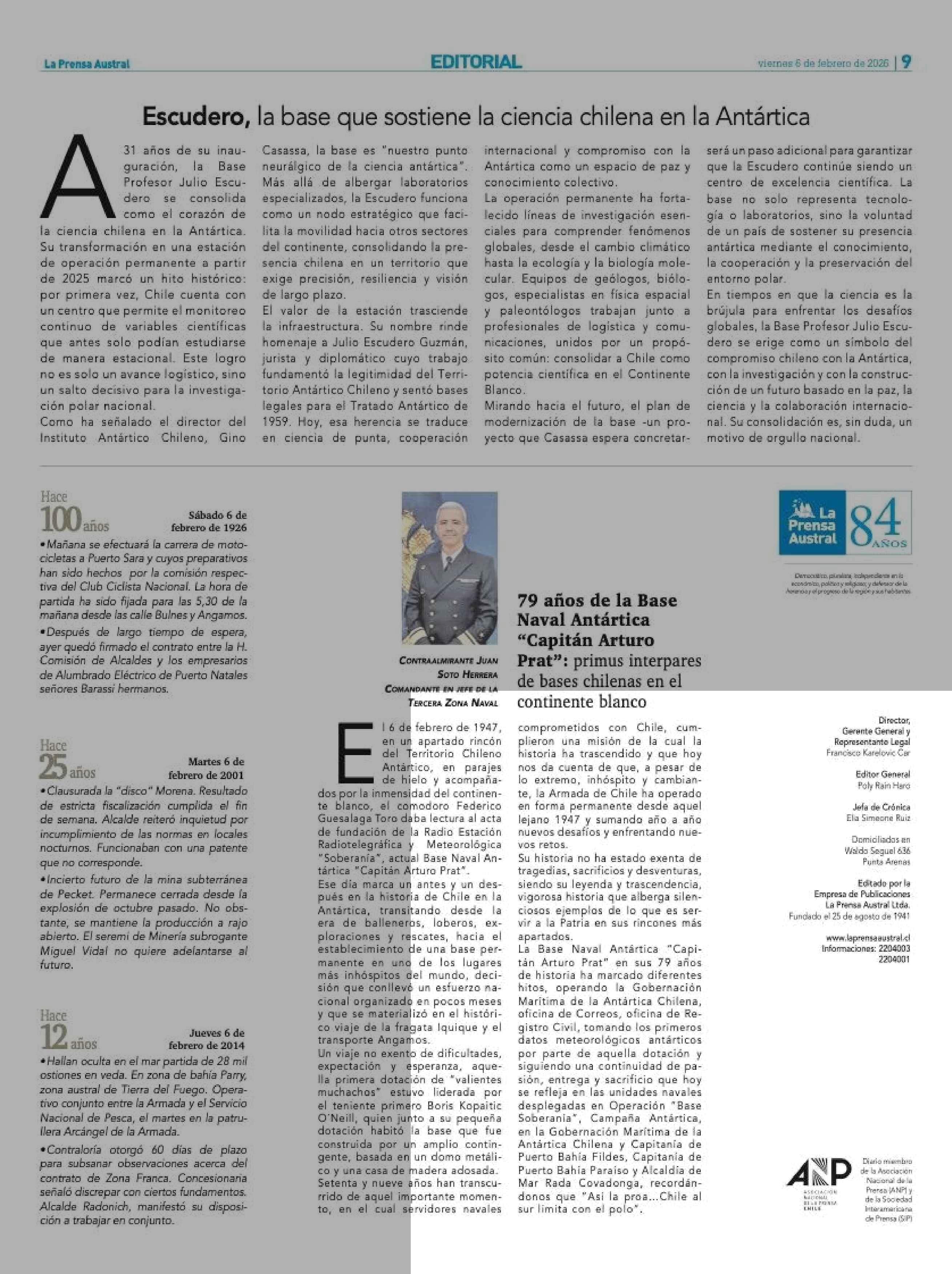 79 años de la Base Naval Antártica "Capitán Arturo Prat": primus interpares de bases chilenas en el continente blanco 06-02-2026 La Prensa Austral |