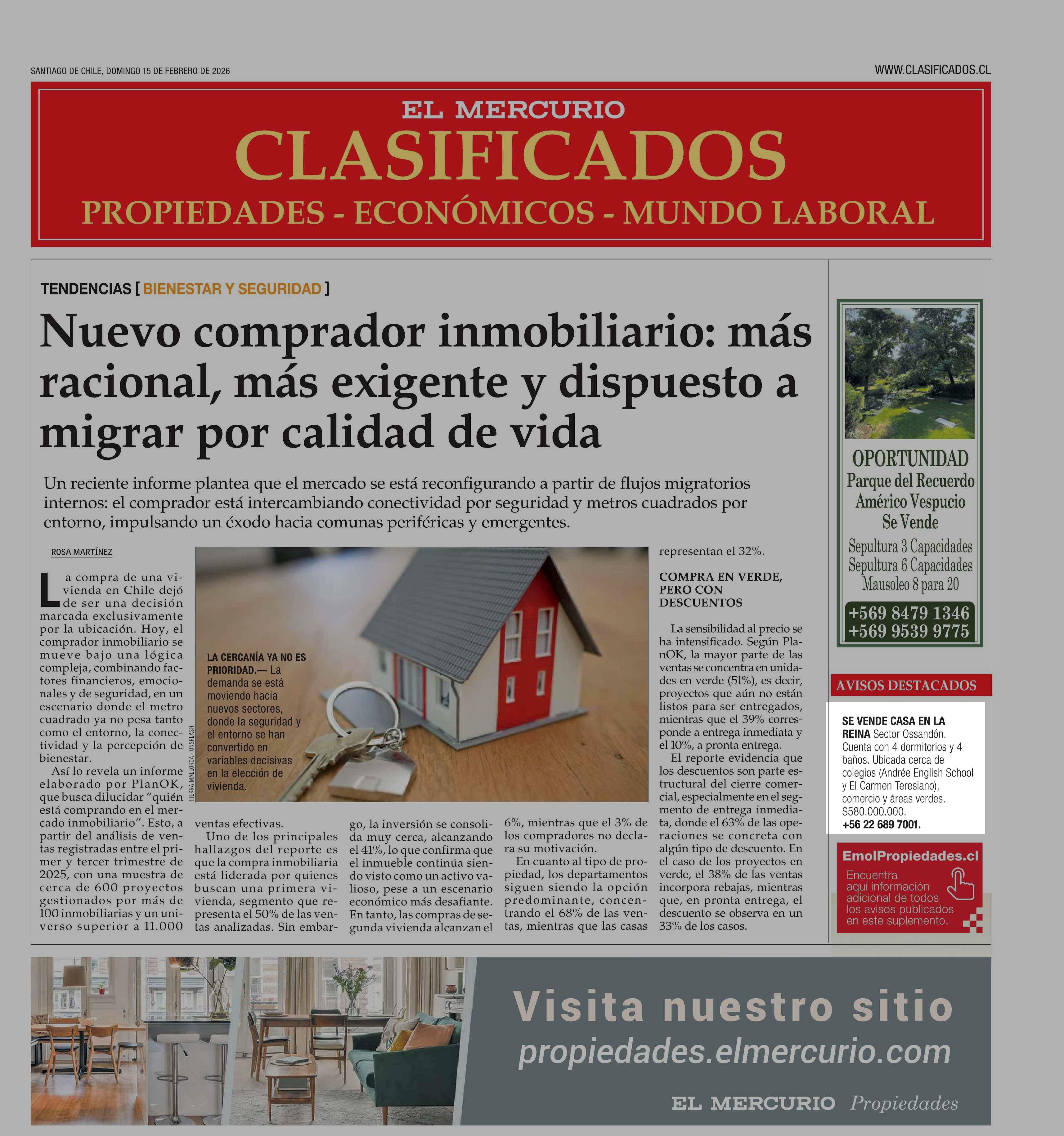 AVISO INMOBILIARIO: SE VENDE CASA EN LA REINA Sector Ossandón 15-02-2026 El Mercurio |