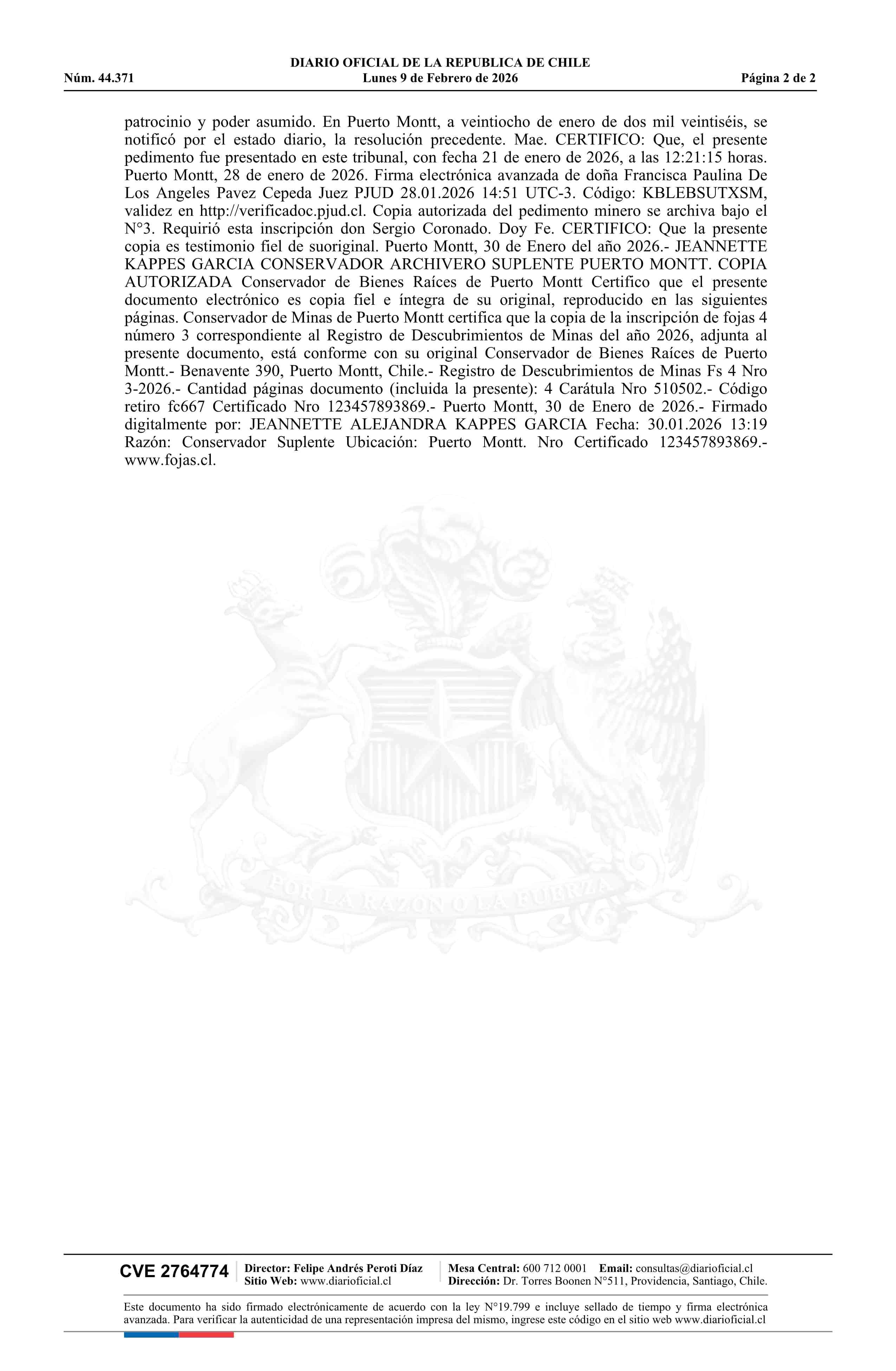 | Fuente: | DIARIO OFICIAL CHILE - BOLETÍN OFICIAL DE MINERÍA (DIARIO OFICIAL CHILE – BOM – PEDIMENTOS MINEROS) | Página(s): | 197-198 |