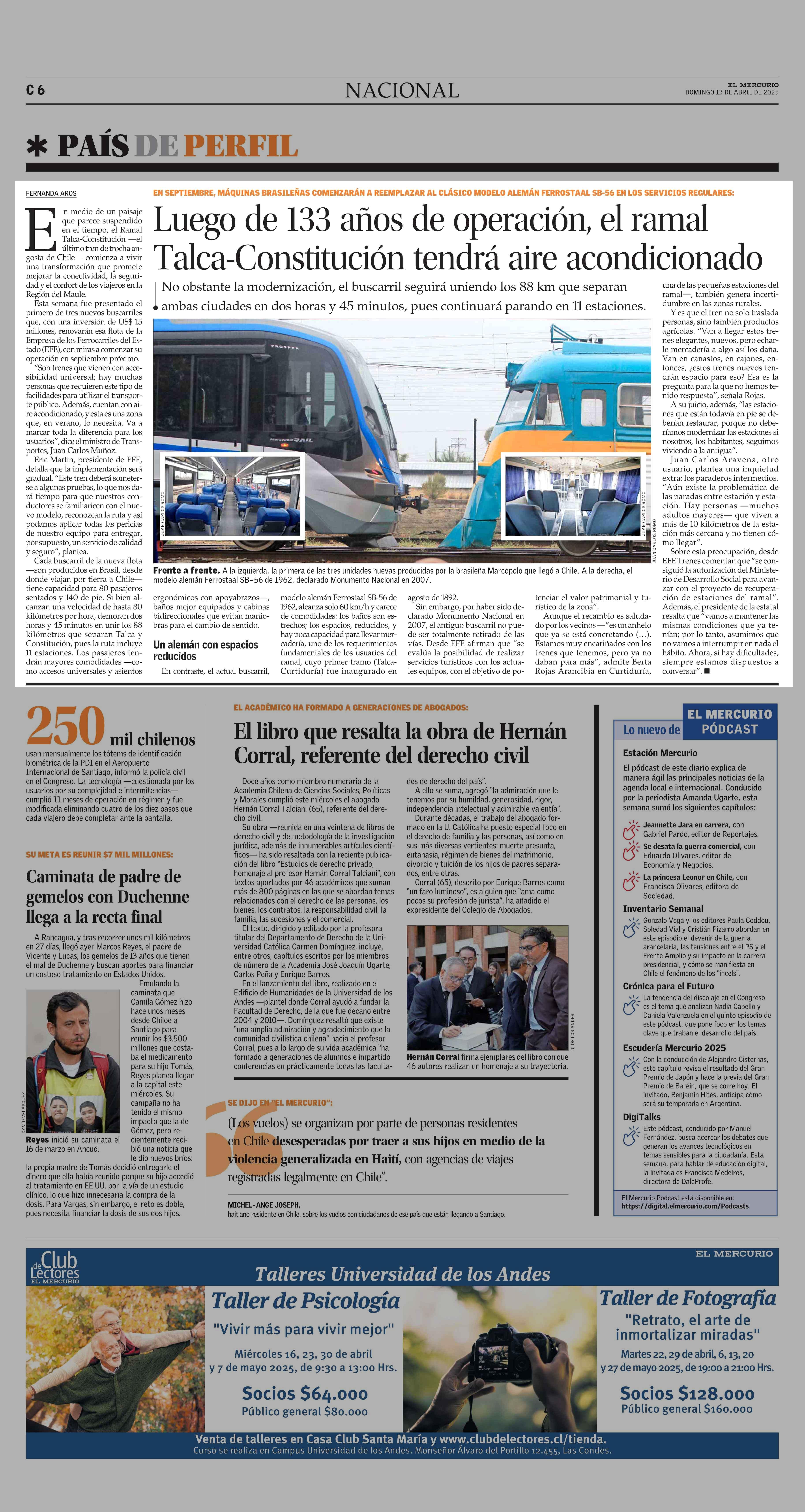 Luego de 133 años de operación, el ramal Talca-Constitución tendrá aire acondicionado 13-04-2025 El Mercurio |
