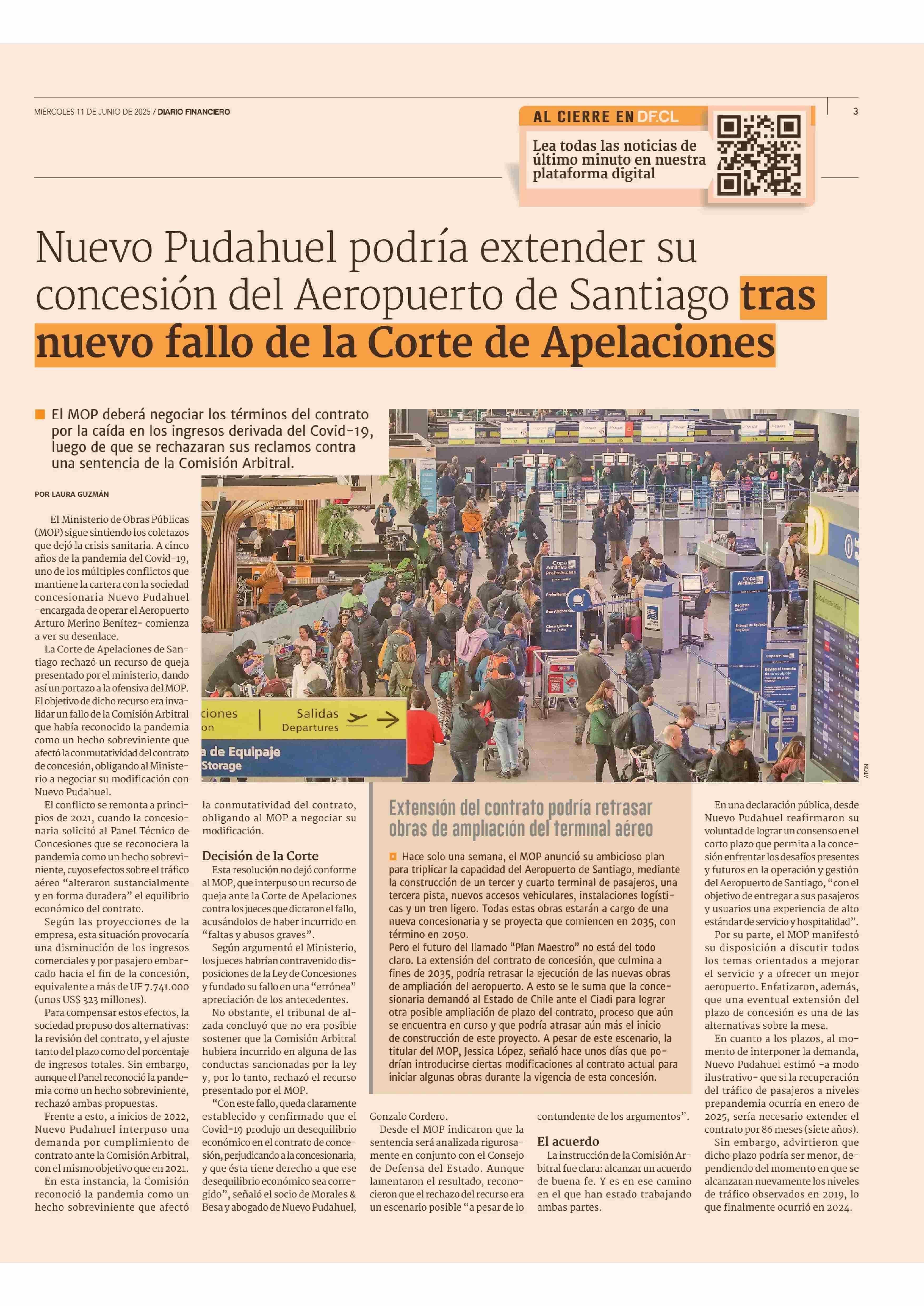 Nuevo Pudahuel podría extender su concesión del Aeropuerto de Santiago tras nuevo fallo de la Corte de Apelaciones 11-06-2025 Diario Financiero |