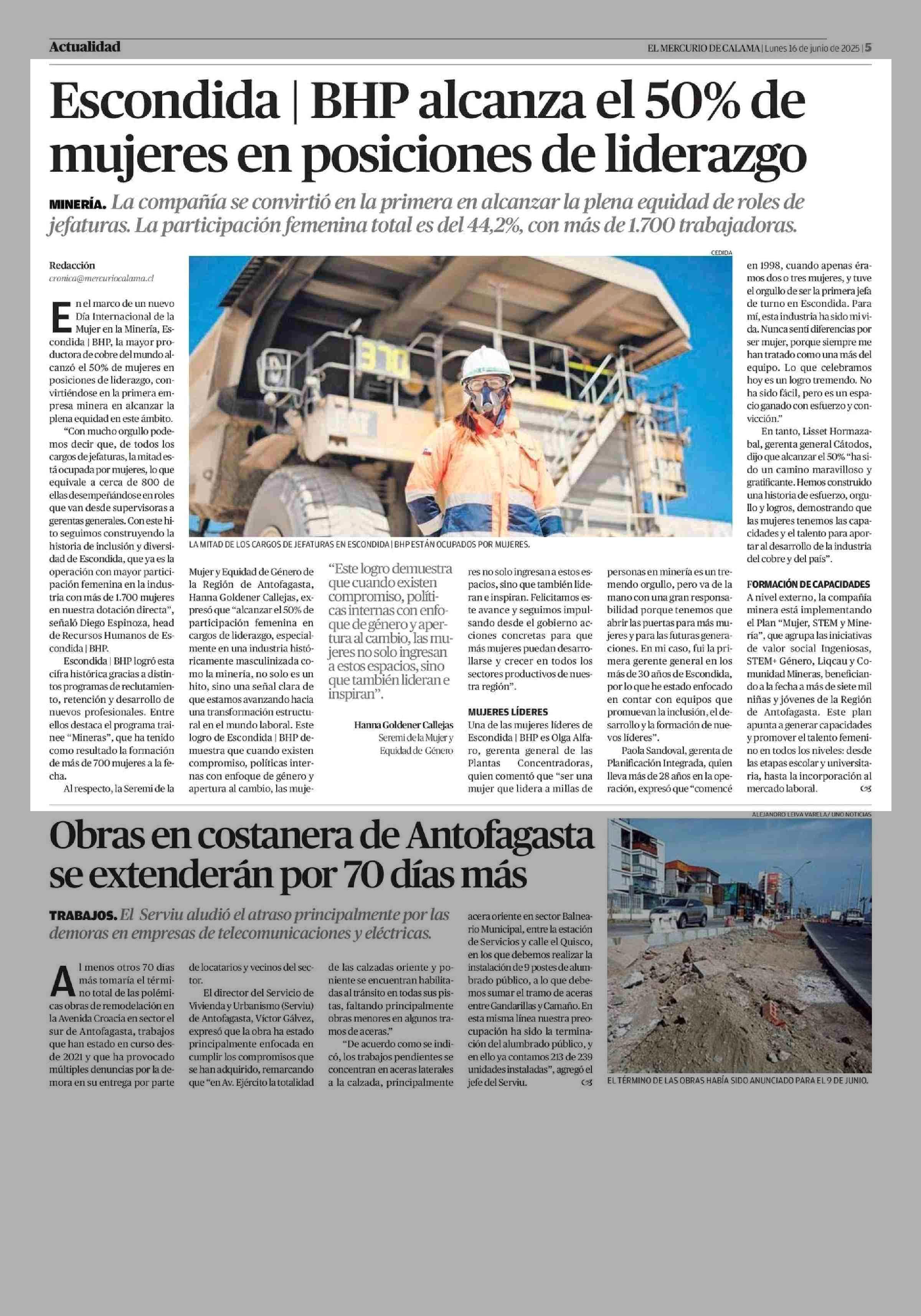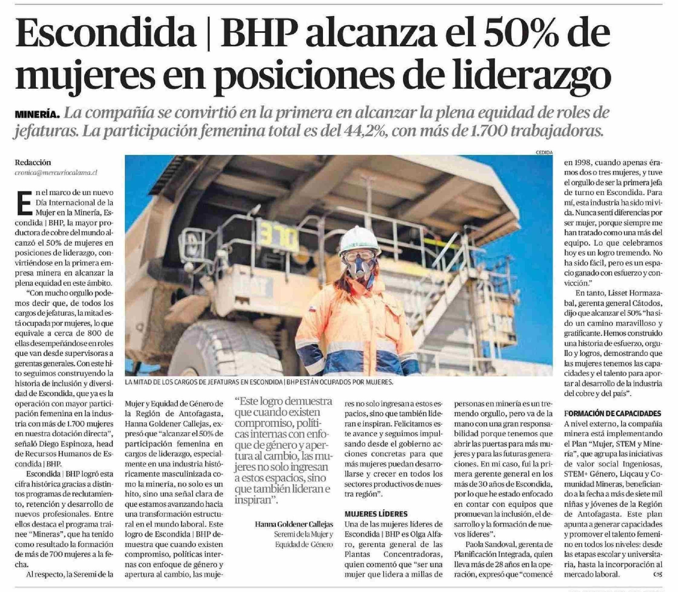 Título: Escondida | BHP alcanza el 50% de mujeres en posiciones de liderazgo