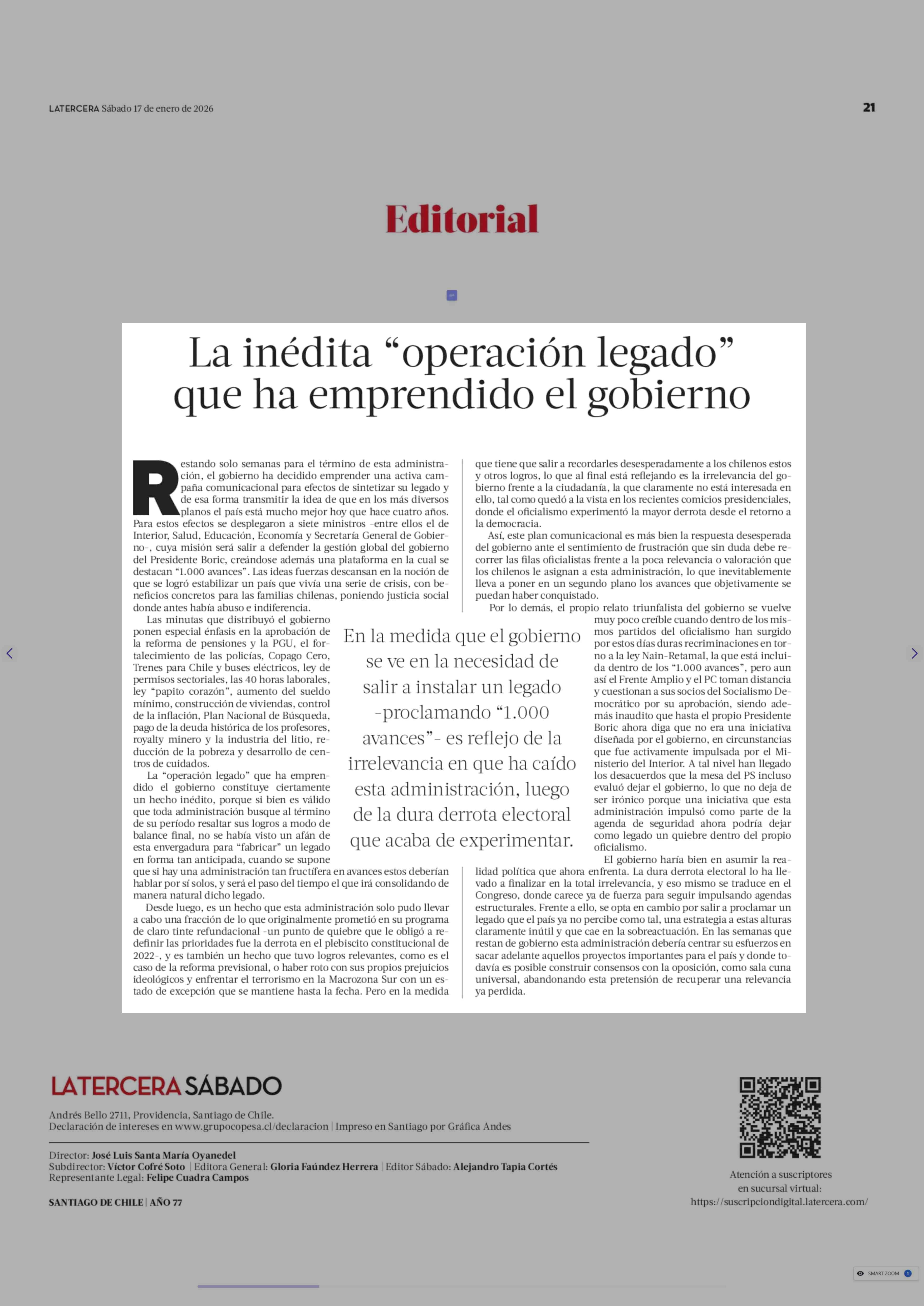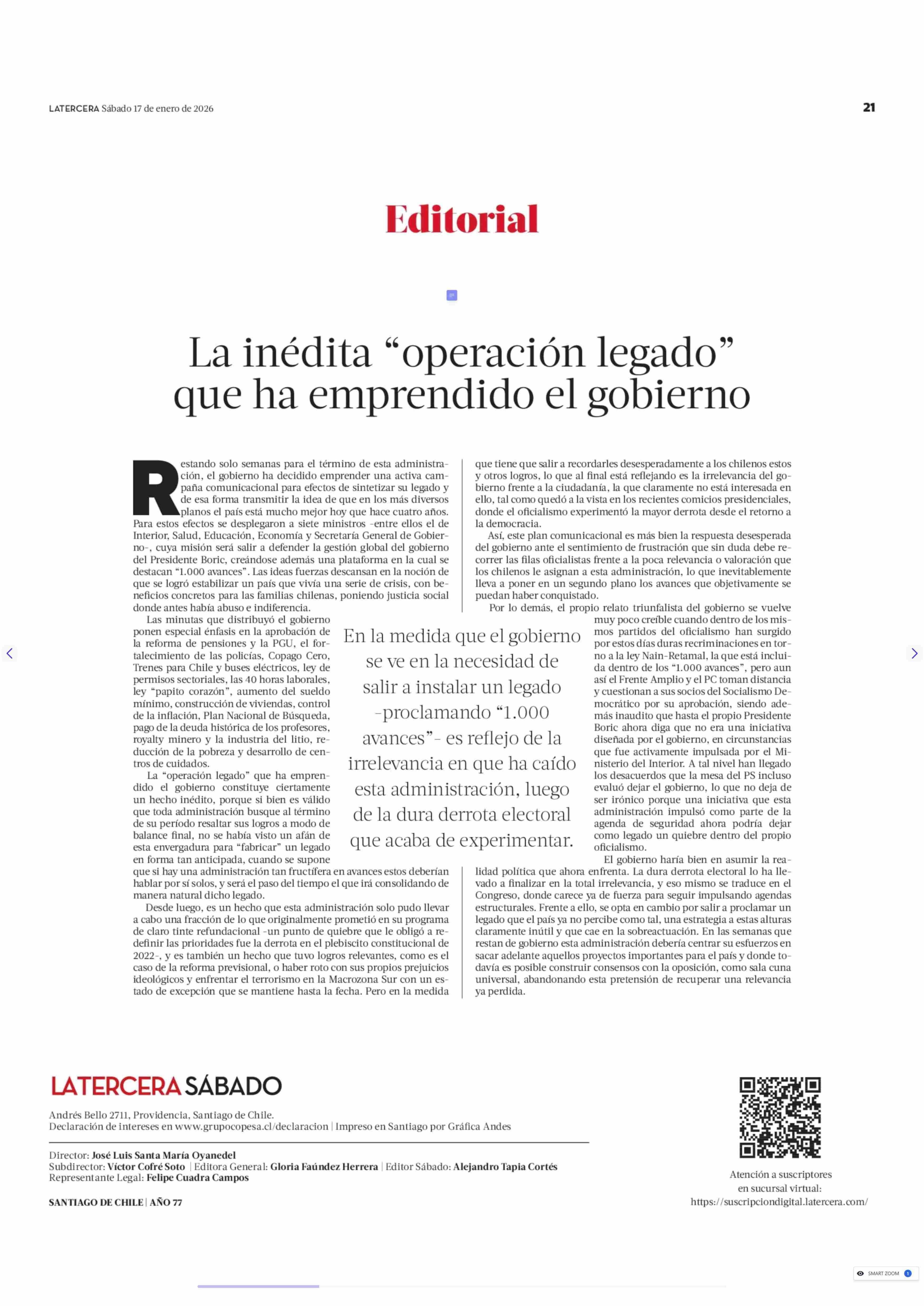 Editorial: La inédita "operación legado" que ha emprendido el gobierno 17-01-2026 La Tercera |