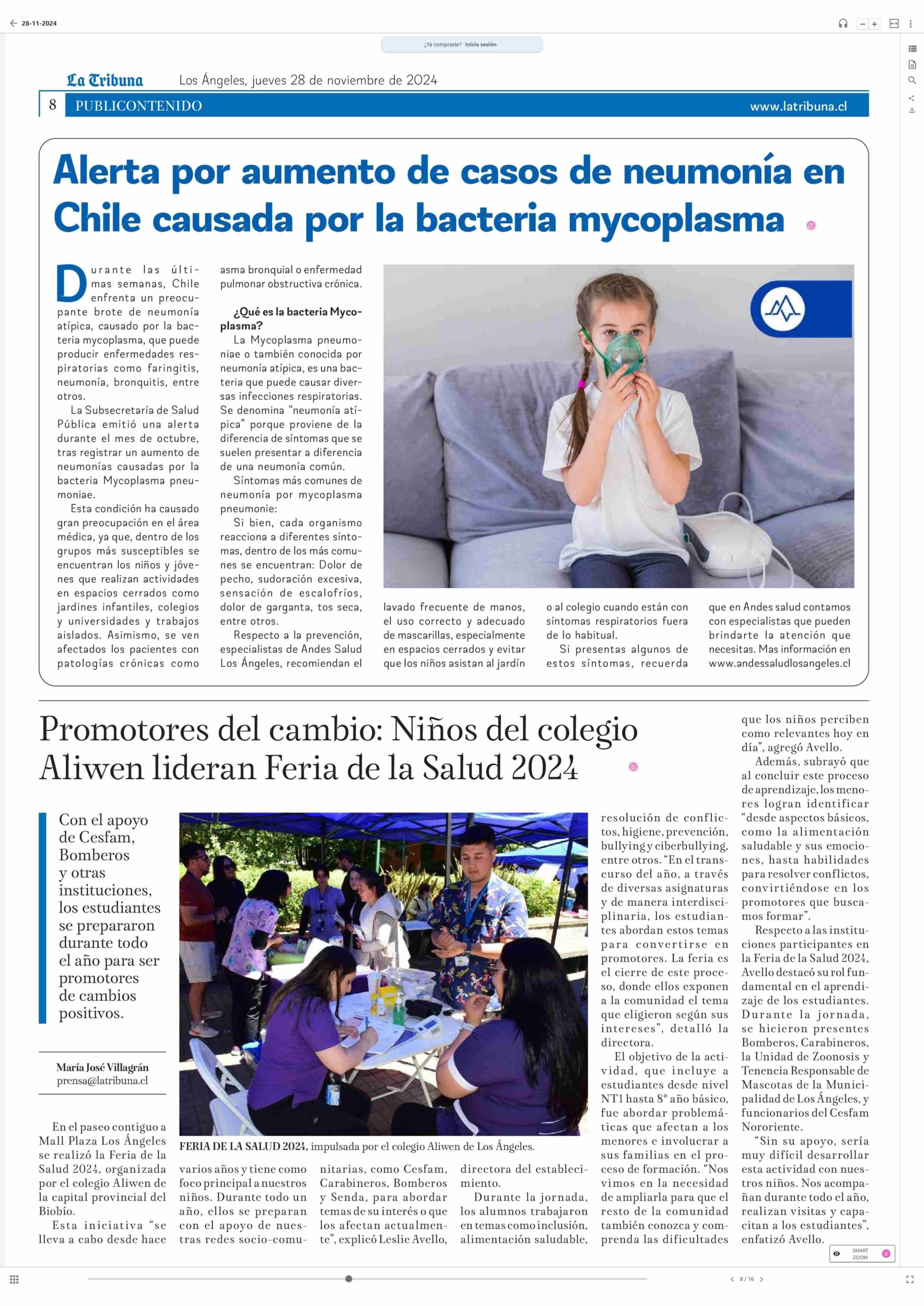 Alerta por aumento de casos de neumonía en Chile causada por la bacteria mycoplasma . 28-11-2024 La Tribuna |