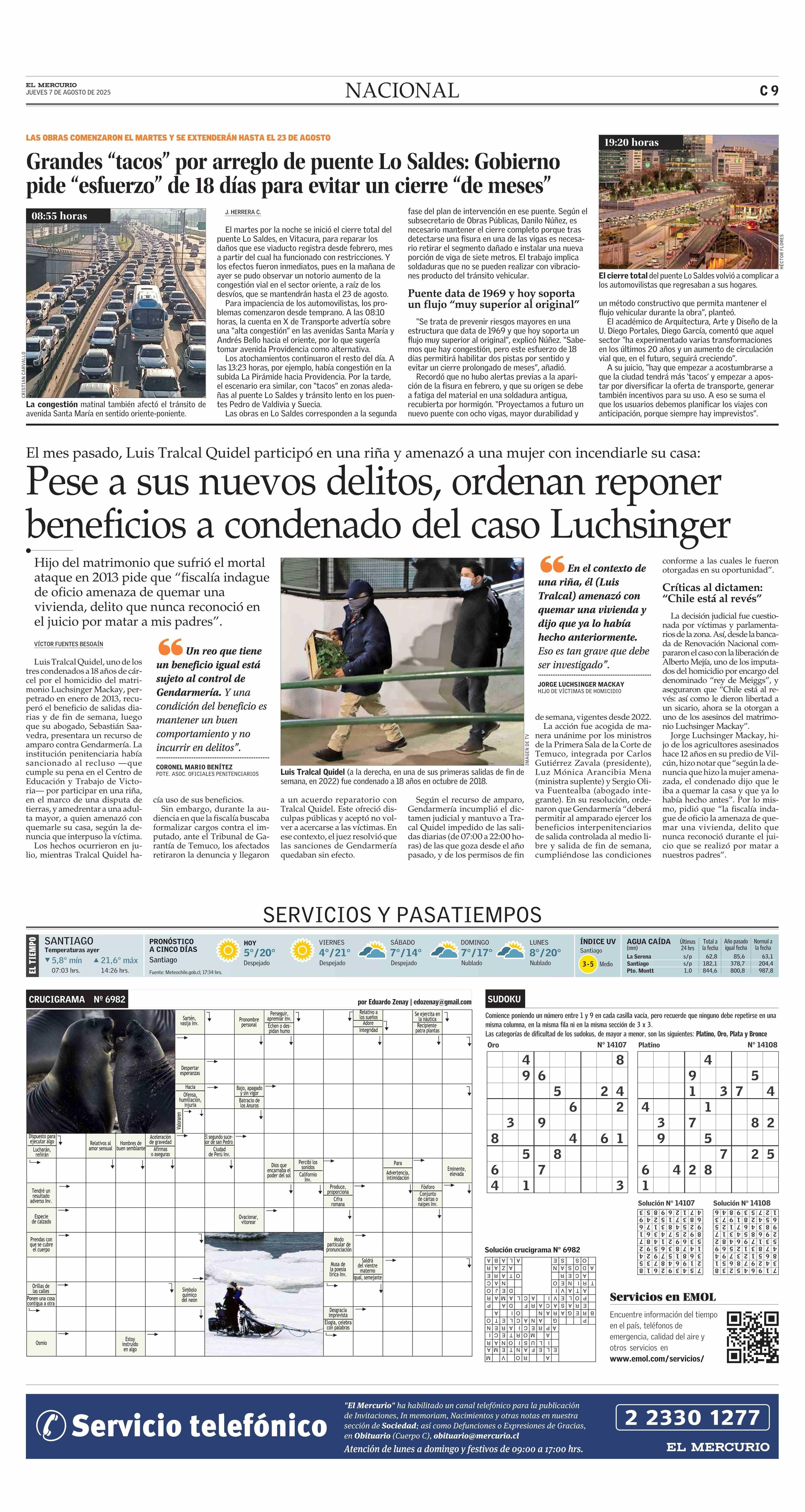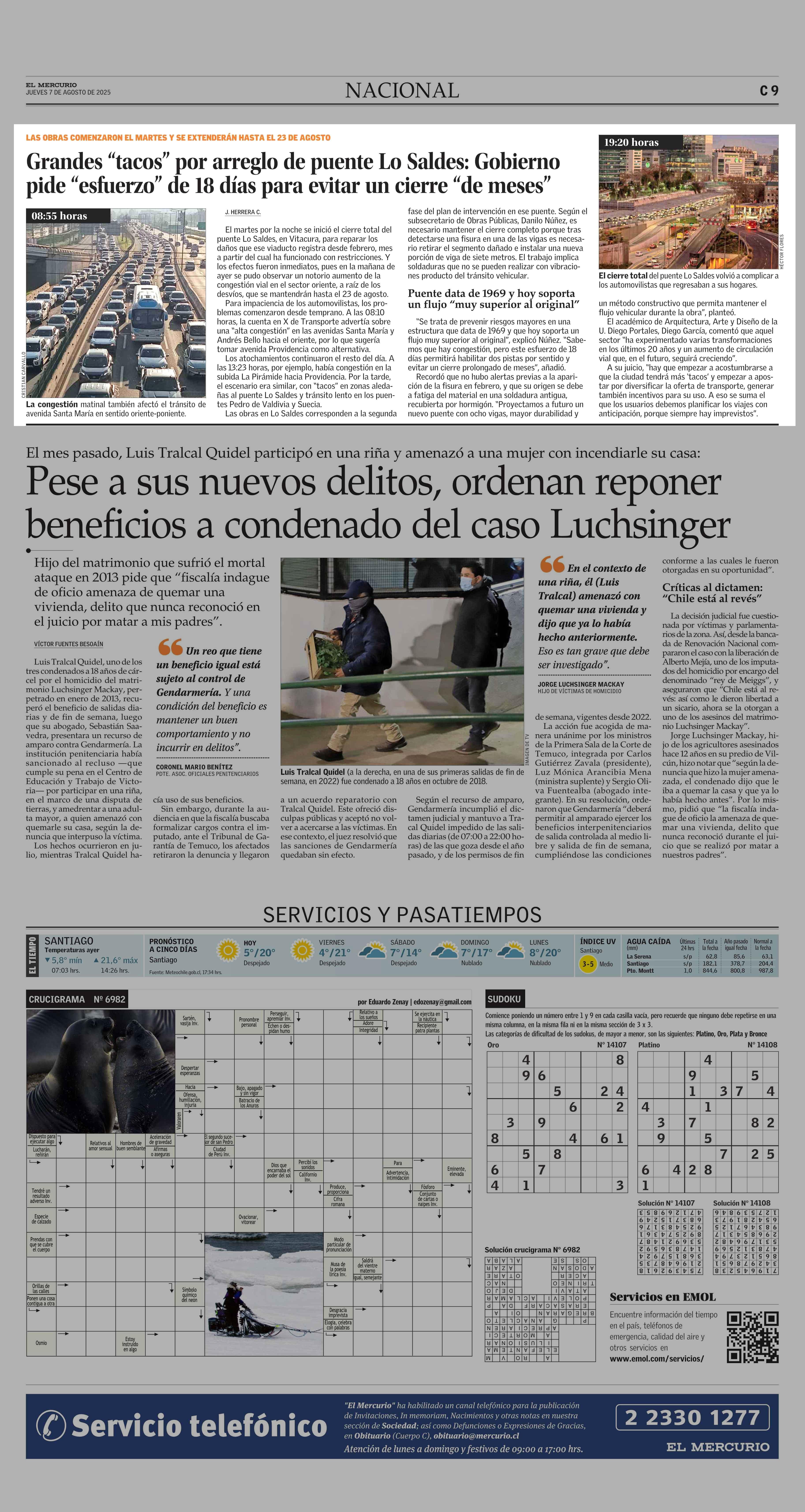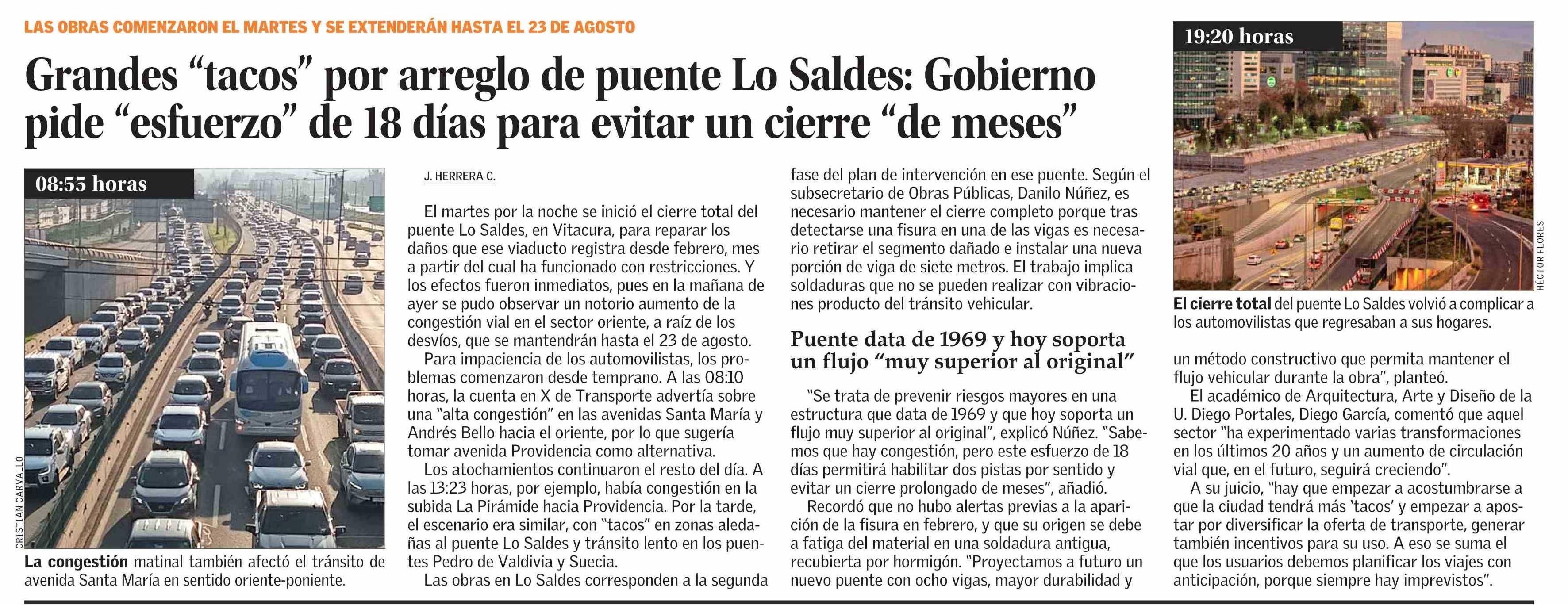 Grandes “tacos” por arreglo de puente Lo Saldes: Gobierno pide “esfuerzo” de 18 días para evitar un cierre “de meses” 07-08-2025 El Mercurio |