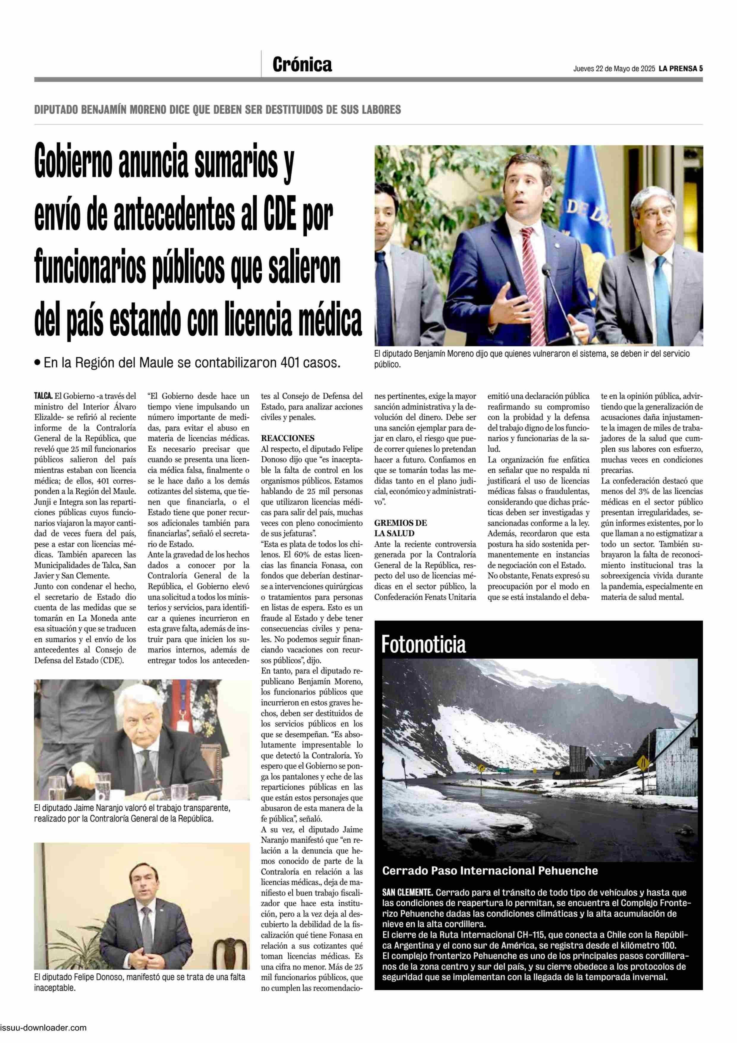 Gobierno anuncia sumarios y envío de antecedentes al GDE por funcionarios públicos que salieron del país estando con licencia médica 22-05-2025 La Prensa de Curicó |