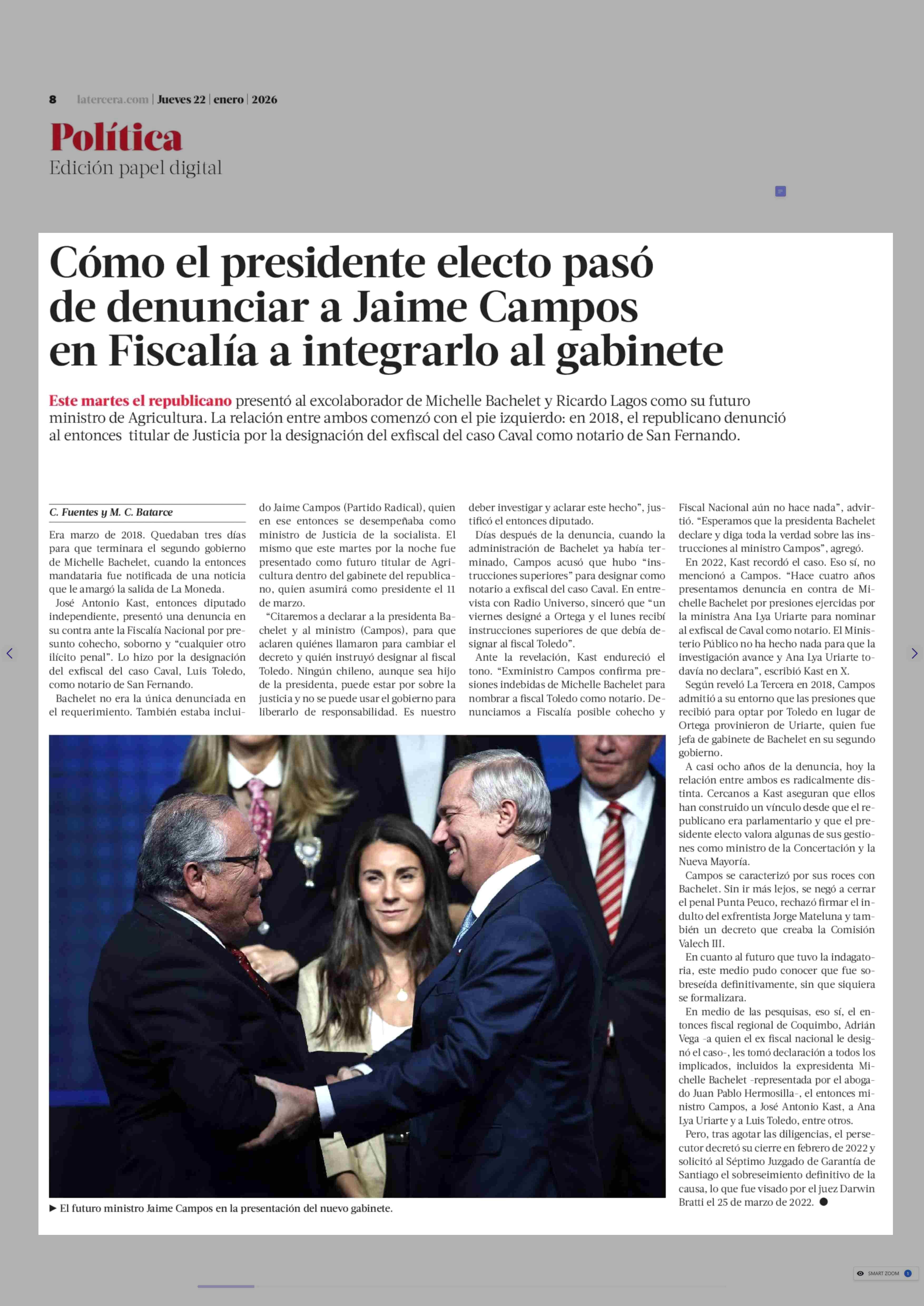 Cómo el presidente electo pasó de denunciar a Jaime Campos en Fiscalía a integrarlo al gabinete 22-01-2026 La Tercera |