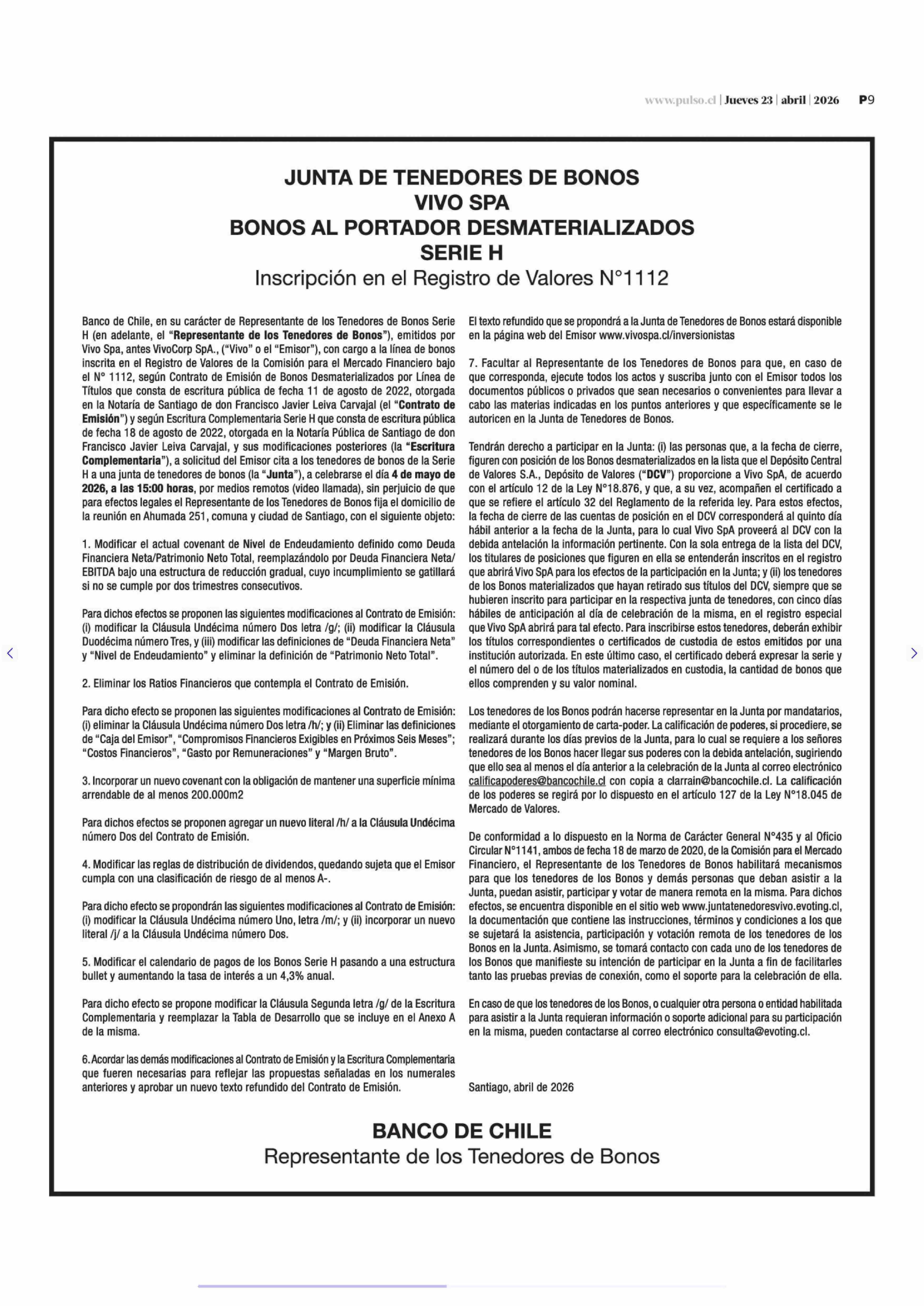 Extractos: JUNTA DE TENEDORES DE BONOS VIVO SPA BONOS AL PORTADOR DESMATERIALIZADOS SERIE H Inscripción en el Registro de Valores Nº1112