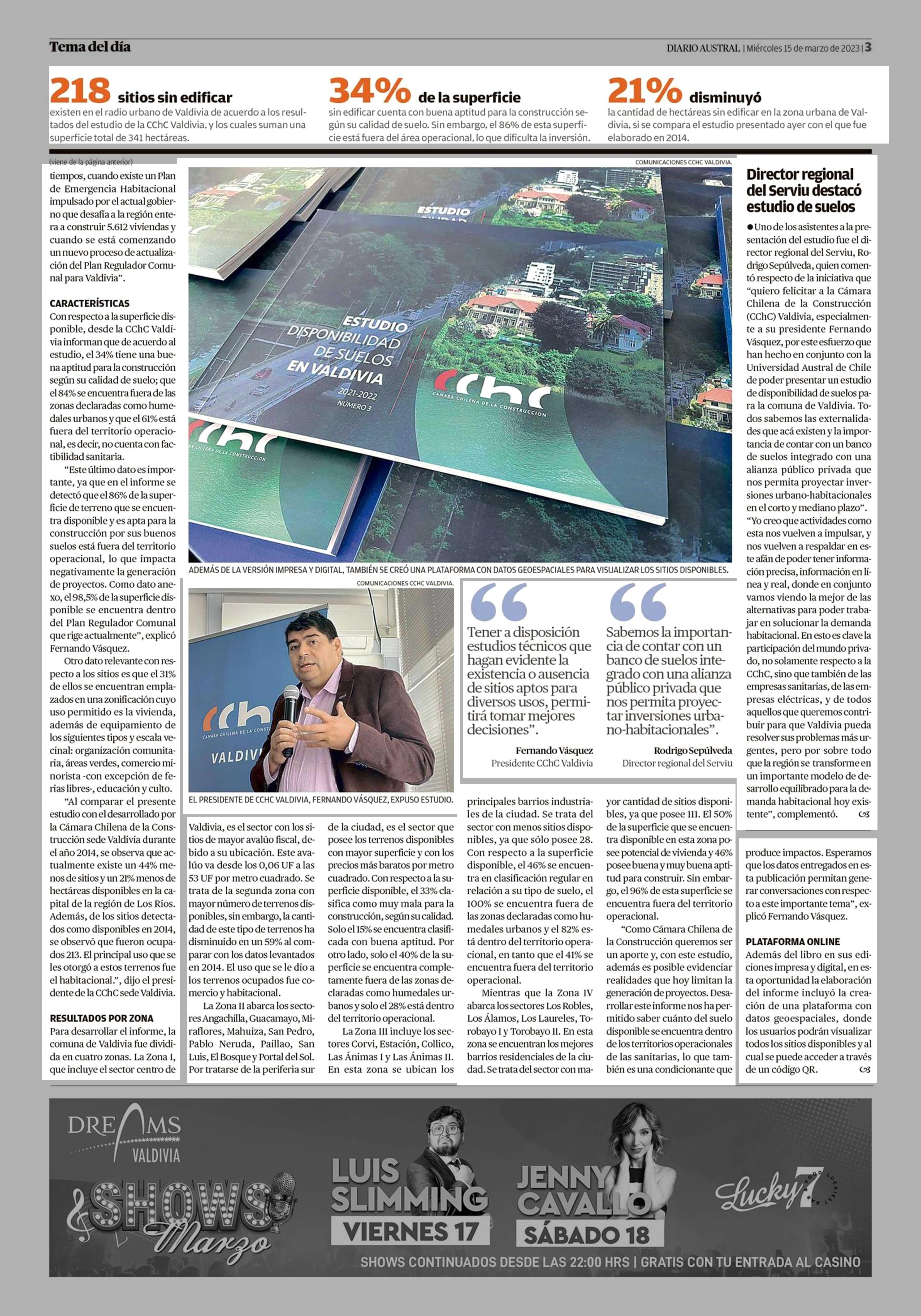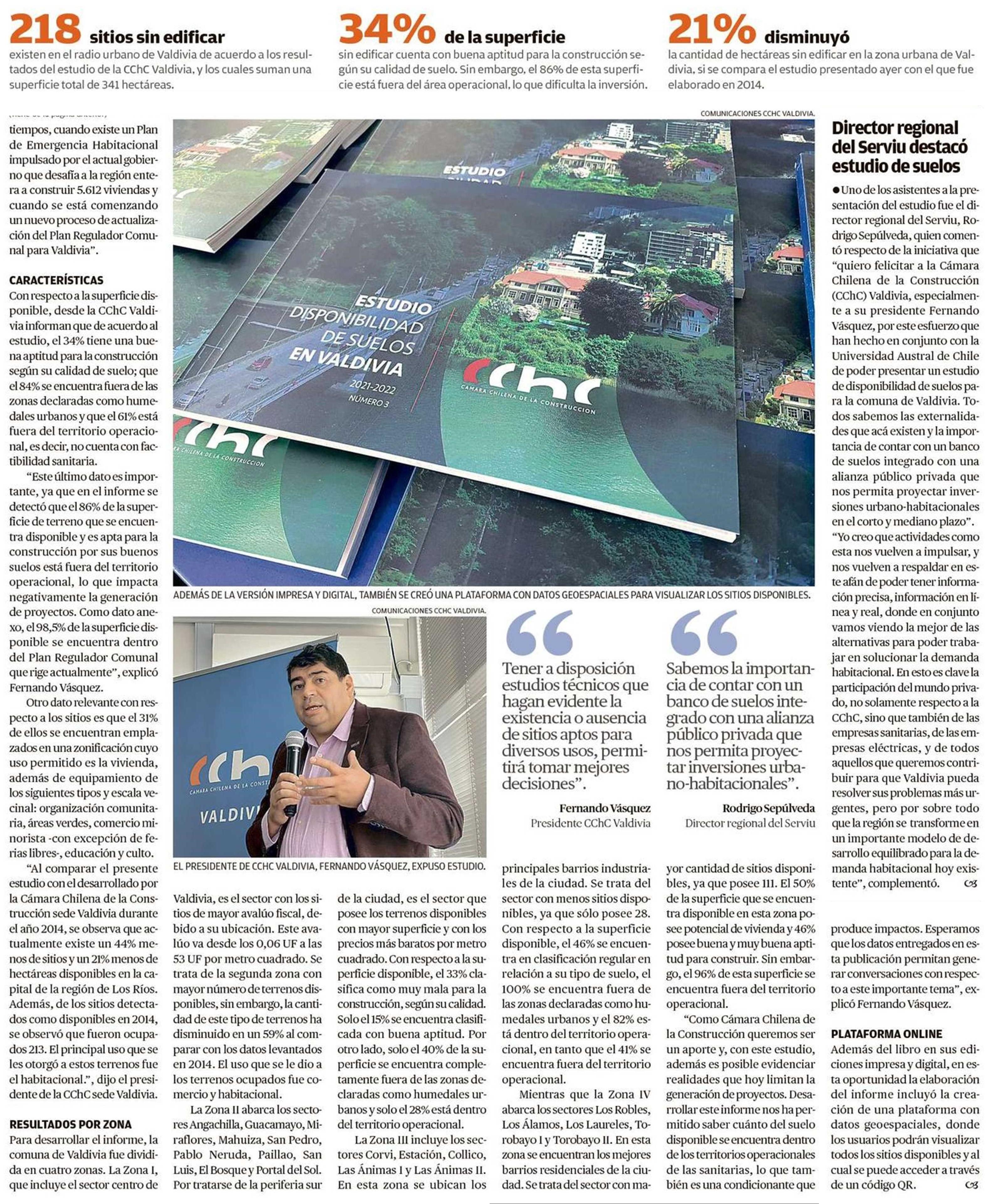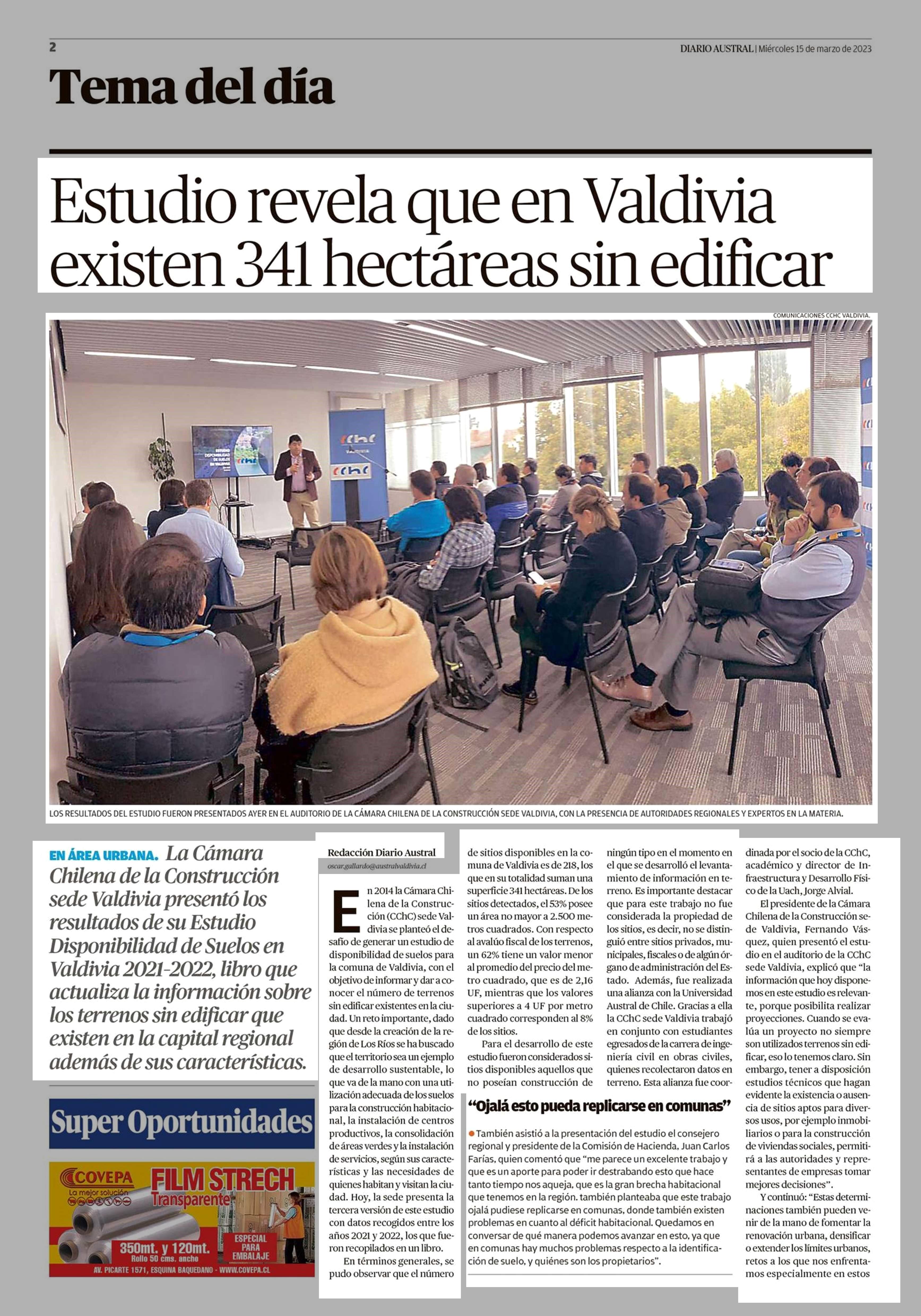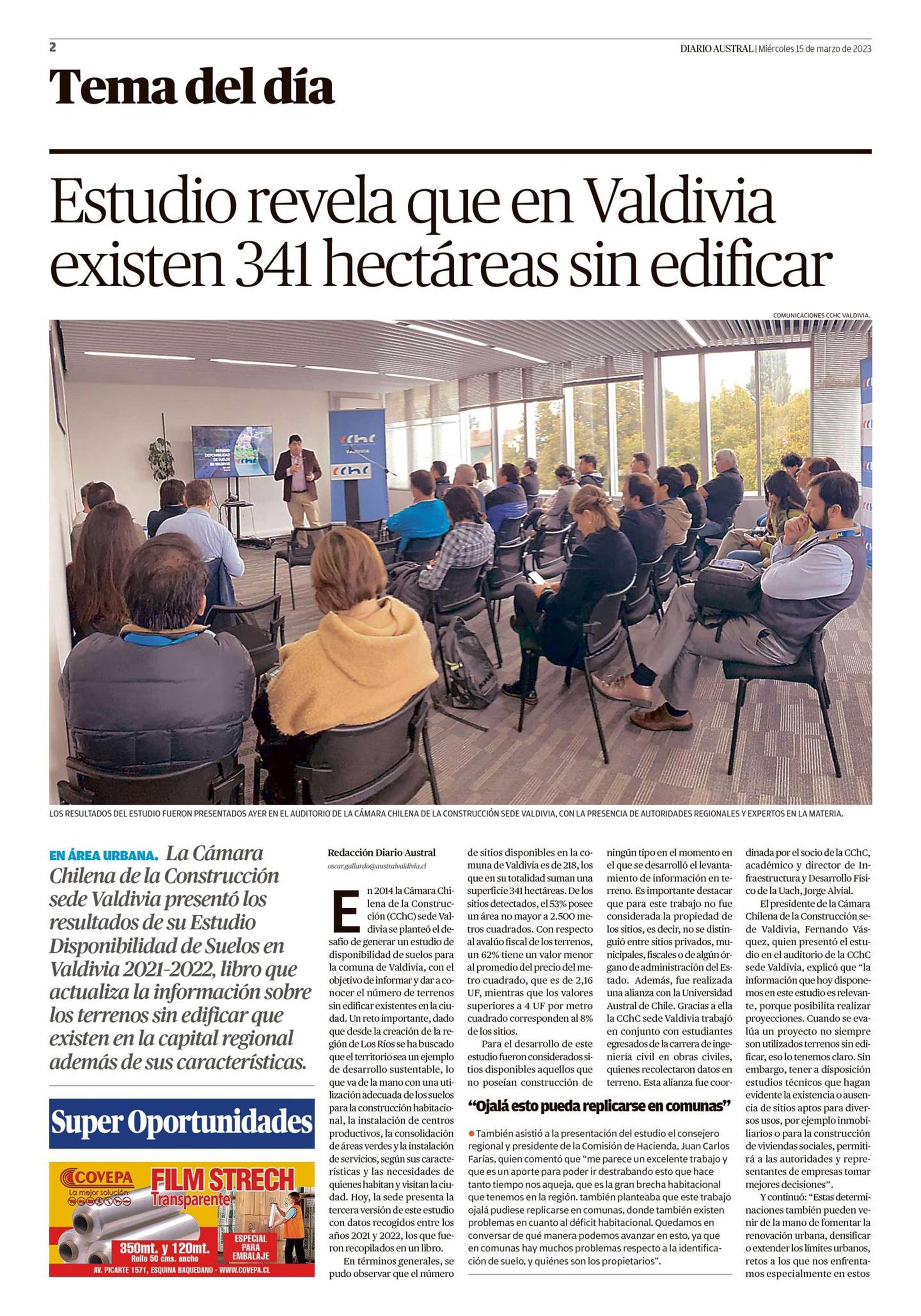 Estudio revela que en Valdivia existen 341 hectáreas sin edificar 15-03-2023 Diario Austral Región de Los Ríos |
