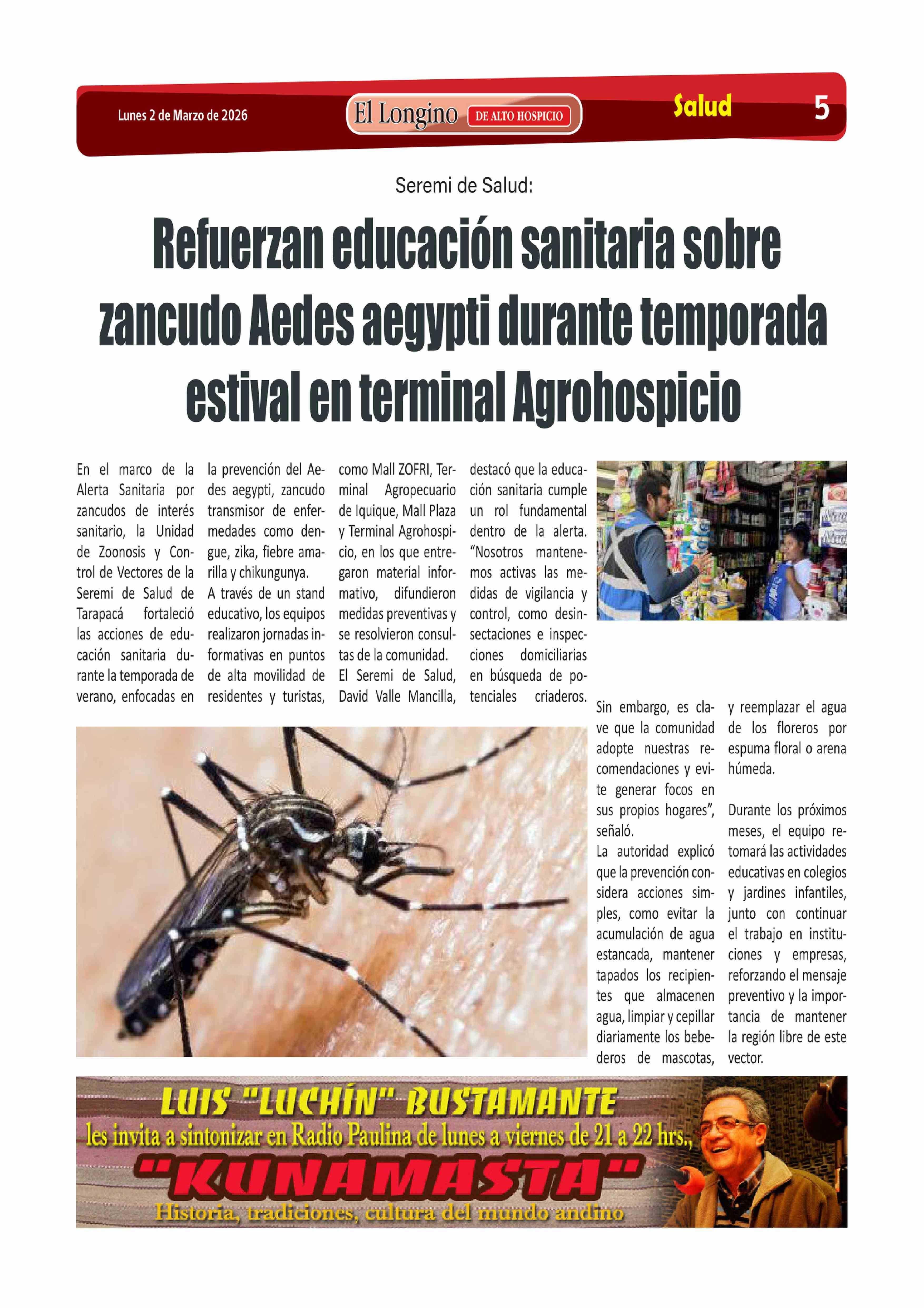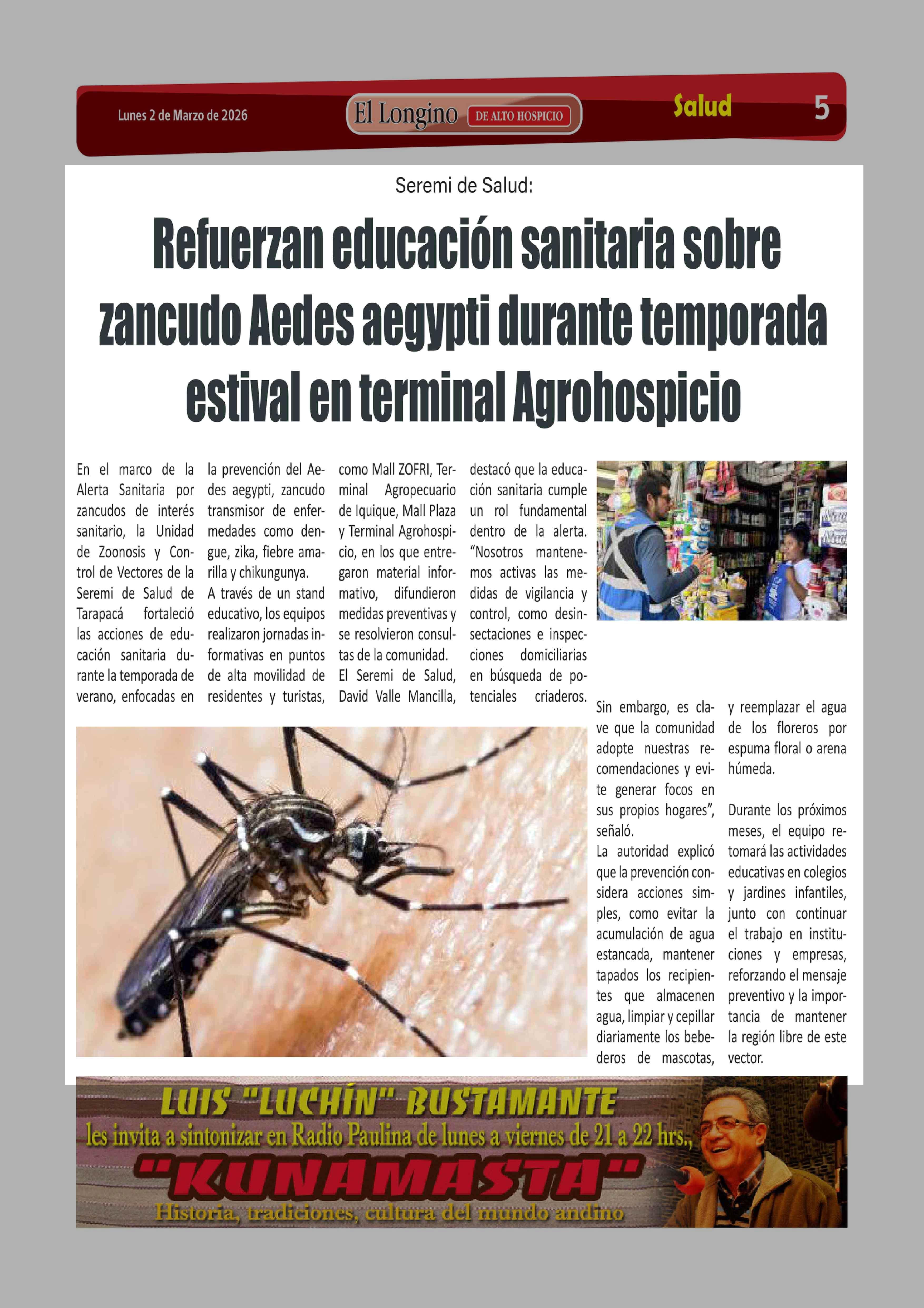 Refuerzan educación sanitaria sobre zancudo Aedes aegypti durante temporada estival en terminal Agrohospicio 02-03-2026 El Longino |